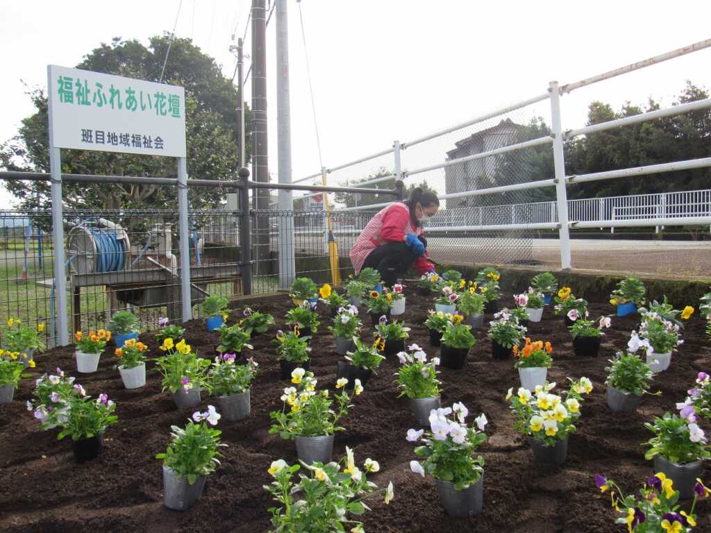 前日の雨で土が固くなっているところはシャベルなどで柔らかくしながら、パンジーや葉牡丹など、100株以上の花々を植えつけました。会員らは「前回よりも花が多くていいね」と感想を言い合っていました。