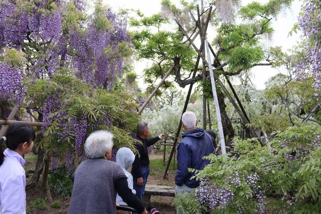 約40年前から大切に育てている長井家の藤です。7種の品種が約20本植えてあり、高いものは7m50cmになるものもあります。長井さんは「色々な人が藤を見に家に来て、おしゃべりして、こちらが楽しませてもらってる。とても幸せ」と笑みを浮かべていました。玄関前には自宅で取れた季節の農産物や家族で作ったオリジナルの小物入れ等が並んでおり、近所の方や観光客との交流の場にもなっていました。5月初めまでは見頃を楽しめるとのことです。