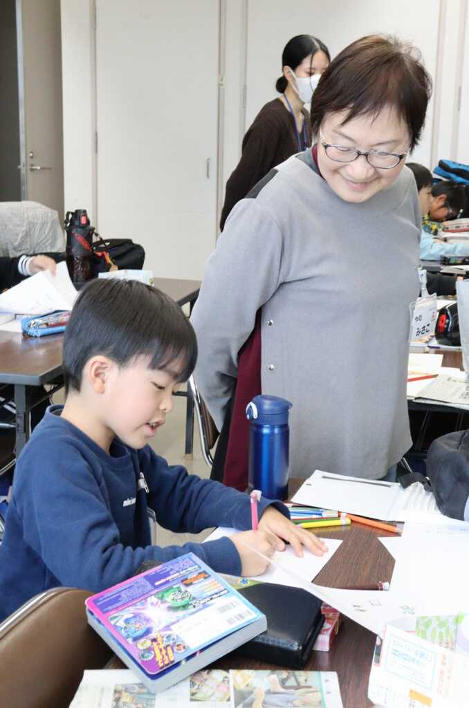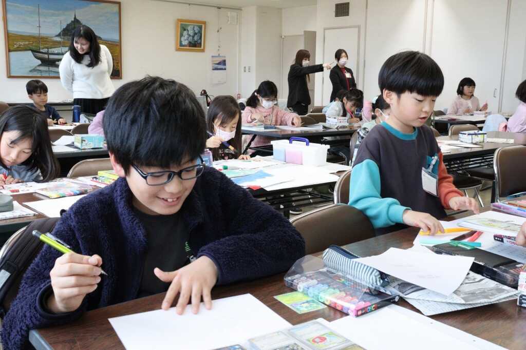 | 南足柄市でイラストレーター・絵本作家として活躍されている山田花菜さんとデザイナーの吉成誠さんを迎え、好きな画材を使ってカレンダー作りに挑戦しました。初めに、全員で一年間のイベントや自然について、アイディアを出し合いました。その後、大好きなキャラクターの図鑑や、思い出の写真などを持ち寄り、その中に四季を入れていきました。大胆に絵具で描きだしたり、ち密な線を鉛筆で丁寧に下書きしたりと、個性あふれる子どもたち。描き方に悩んだ子や、もう少しアクセントを加えたい子は、先生や見守りボランティアの皆さんからアドバイスを受けながら、集中して頑張り、自分だけのカレンダーが完成しました。 |