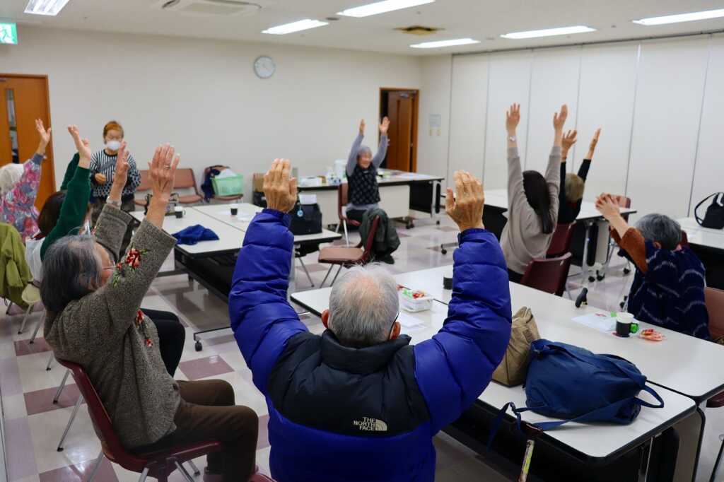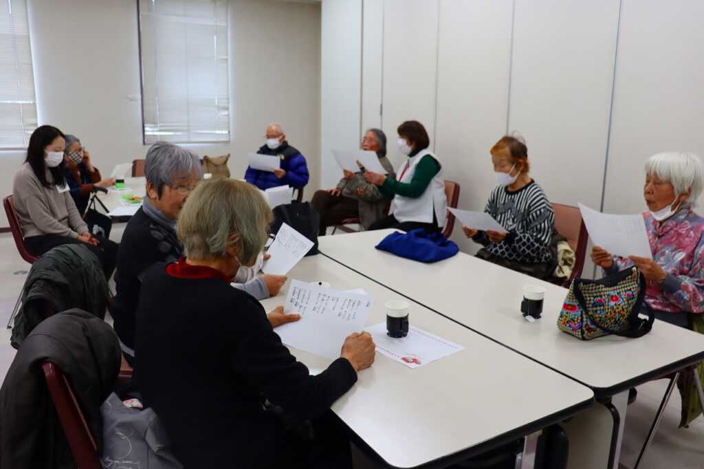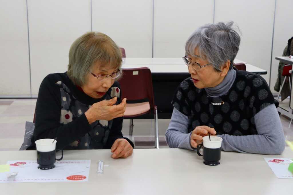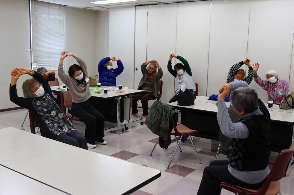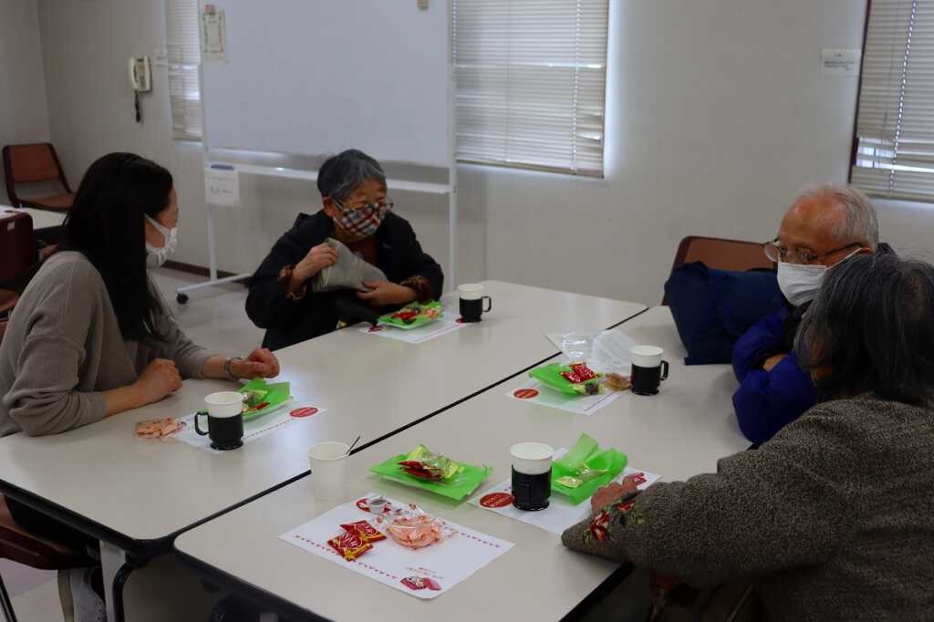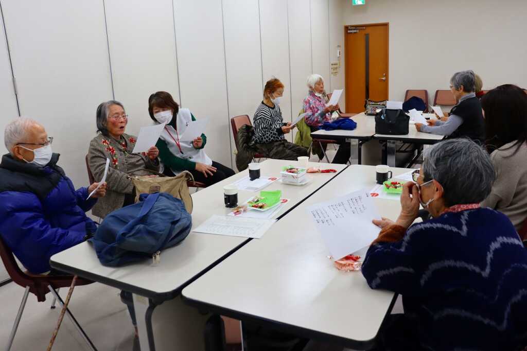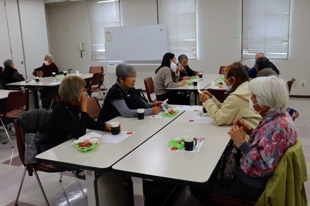 | 毎月1回女性センターにて開催している「ほっとカフェ」。テーブルごとに参加者同士が交流をして、お喋りが盛り上がっていました。終わりの頃には、介護予防サポーターによる体操で座る姿勢で固まった身体をほぐしました。終了前には、今回から歌を歌って終わることになり、「故郷」と「いい湯だな」を歌ってお別れしました。 次回は3月16日(月)10時から開催します。参加費は300円で、どなたでもご参加いただけますので、皆さまお誘いあわせの上、ぜひご参加ください。 |