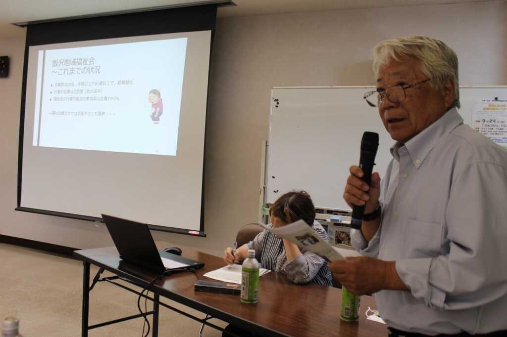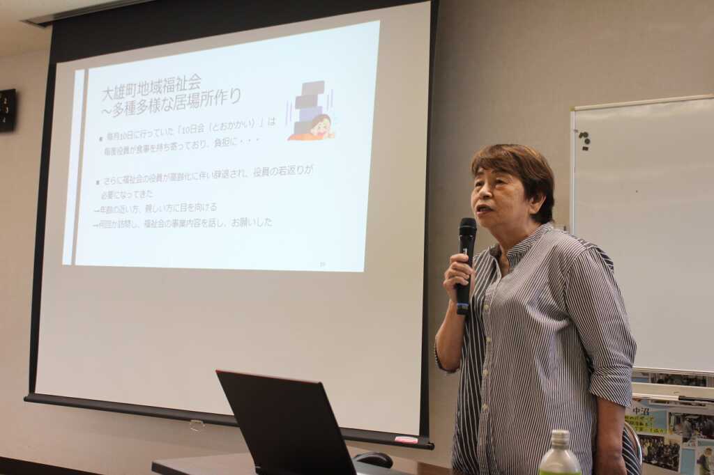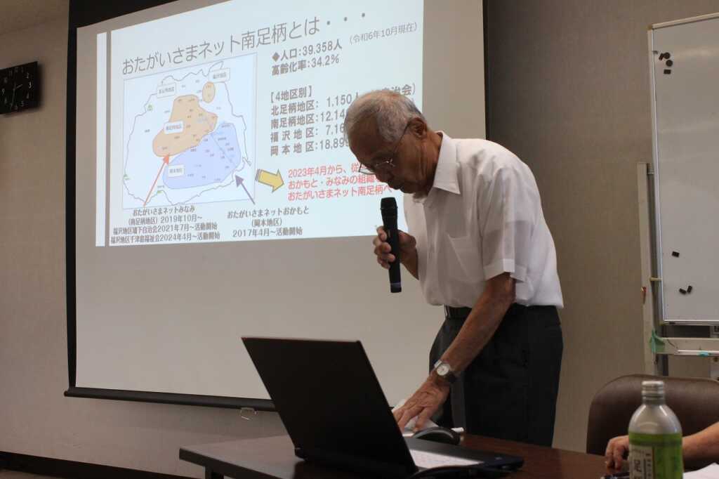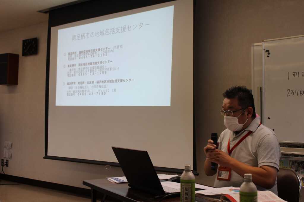 南足柄市南足柄・北足柄・福沢地区地域包括支援センターの吉田篤史氏を迎え、南足柄市の高齢化の現状と、介護保険制度について伝えていただきました。その後は、南足柄地区内の取り組み事例の報告として、おたがいさまネット・大雄町地域福祉会・飯沢地域福祉会・広町福祉げんき計画推進委員会の各会長から活動紹介と活動への想いを語っていただきました。参加者から活発な質疑応答も行われ、関心の高さがうかがえました。
