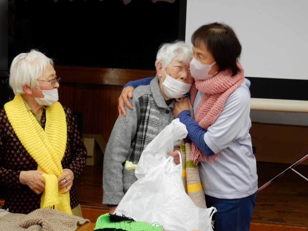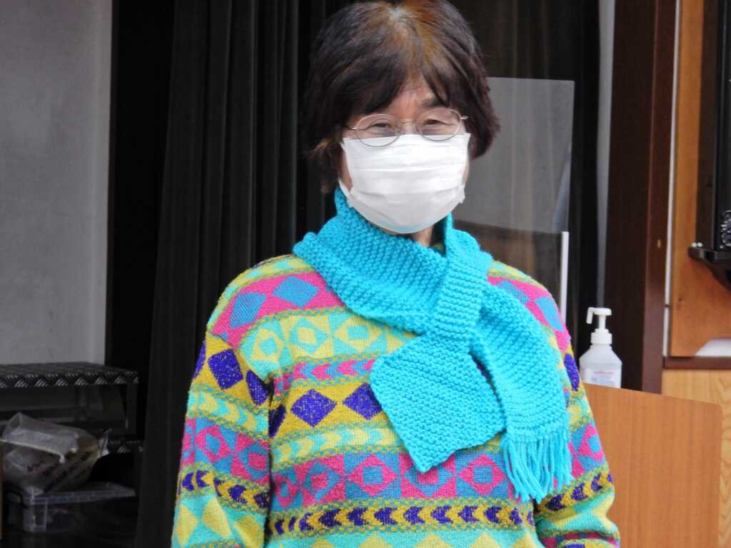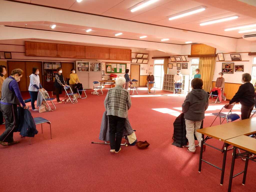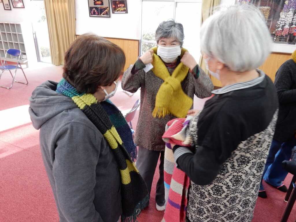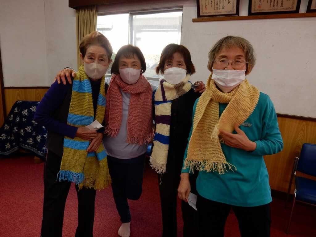 今年最後の楽ちん会です。準備体操でゆっくり身体をほぐした後は、6つの筋肉・スクワット・片足立ちを行いました。その後、91歳になられる参加者のおひとりが「中沼に住んで10年。初めは知り合いがいなかったが、この場所に参加するようになり皆さんと知り合えて嬉しい。編み物が好きなので、ぜひ使ってほしい」と、ご自身で作られた手編みのマフラーを全員にプレゼント!早速参加者の皆さんは「あったかい」「素敵な色合い」と、頂いたマフラーを首元に巻き、心も身体もあたたまる会となりました。