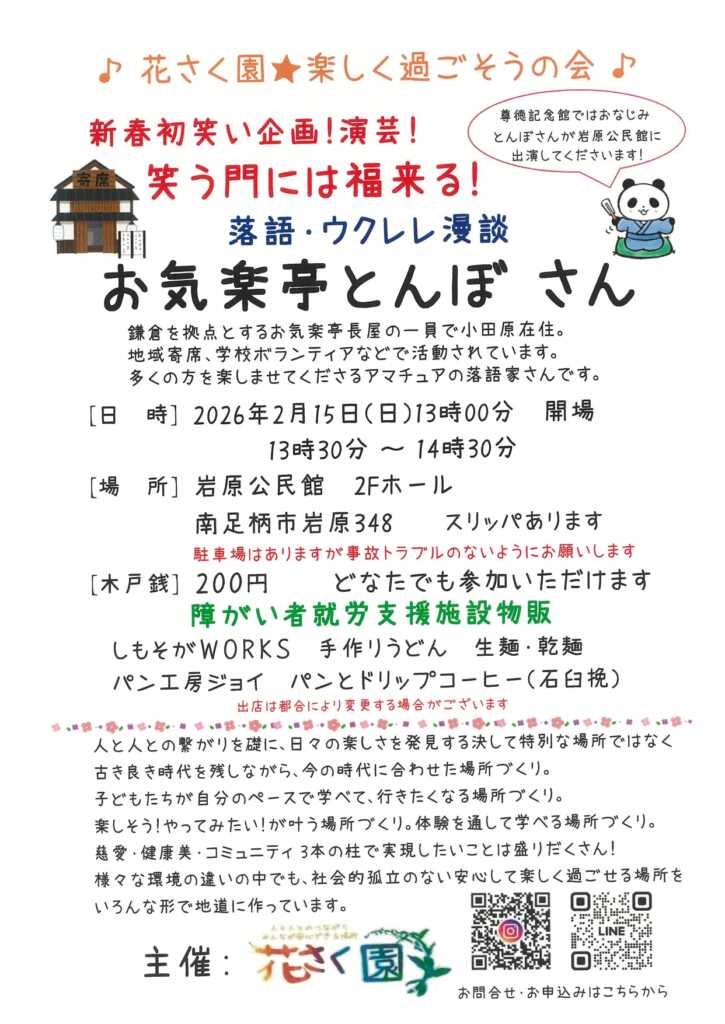 2月15日(日)岩原公民館に、尊徳記念館ではおなじみのお気楽亭とんぼさんをお招きし落語・ウクレレ漫談を開催します。物販では、障がいを持つ方が働く施設さんによる手作りうどん、パンとドリップコーヒー、などが出店されます。詳細はチラシをご覧ください。