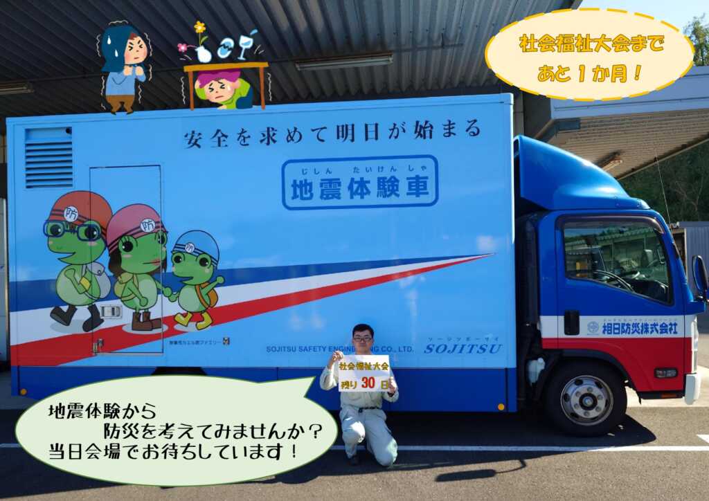 社会福祉大会にて、相日防災(株)による地震体験をすることができます。文化会館とりんどう会館の間の道路にて、起震車を設置してお待ちしています。「防災をリアルに体感」してみませんか!?