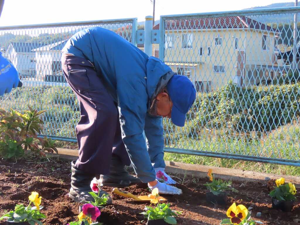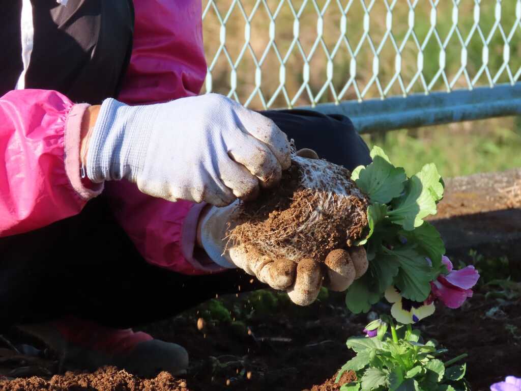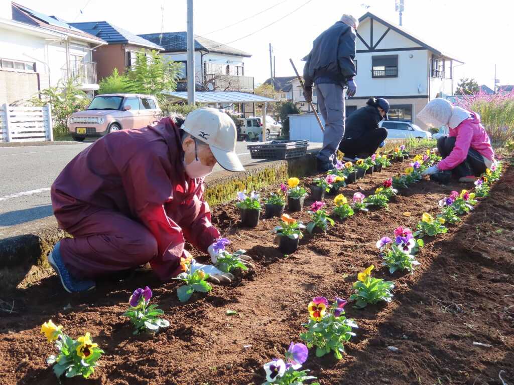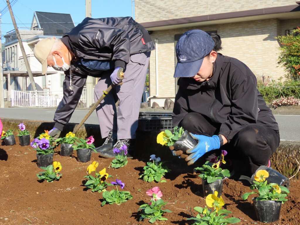 | 今回はパンジー80株を植え替えました。初めに、色味と間隔のバランスを見るため配置してから作業開始。会員から「ポットから出す時に下をほぐして、少し根を取ってから植えると良いよ」「パンジーのお花の向きが道路側になるように意識して」とアドバイスがあり、意識をしながら手分けして丁寧に植えました。 |