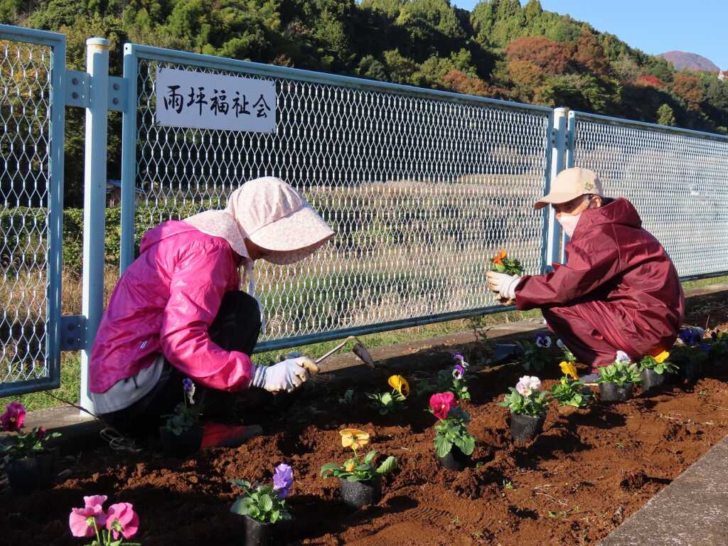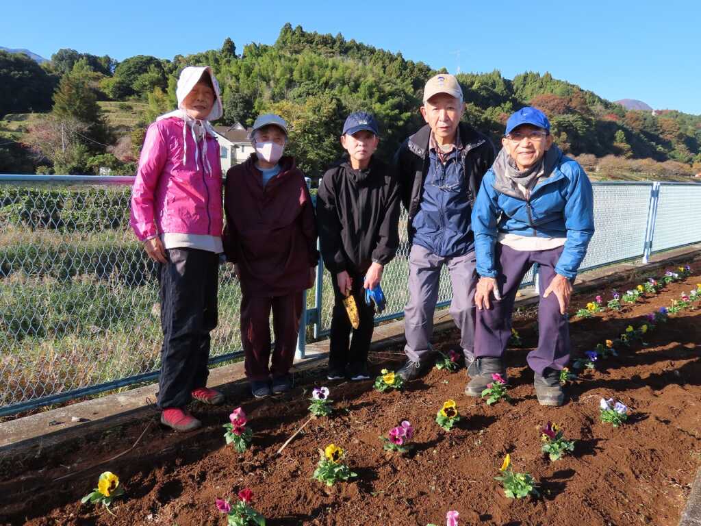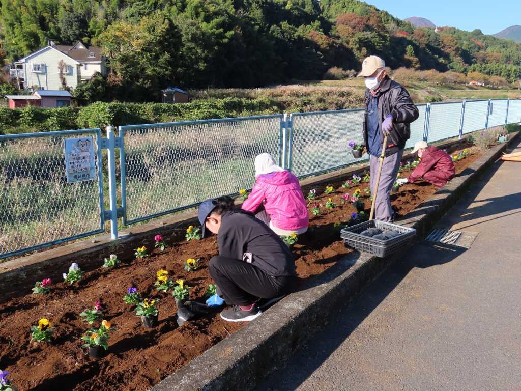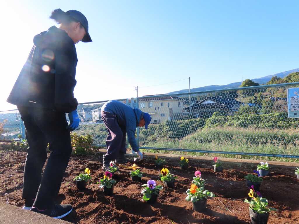 | 今回はパンジー80株を植え替えました。初めに、色味と間隔のバランスを見るため配置してから作業開始。会員から「ポットから出す時に下をほぐして、少し根を取ってから植えると良いよ」「パンジーのお花の向きが道路側になるように意識して」とアドバイスがあり、意識をしながら手分けして丁寧に植えました。 |