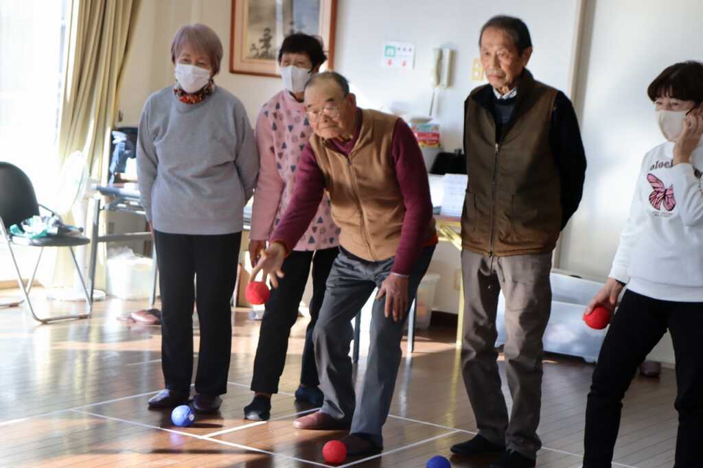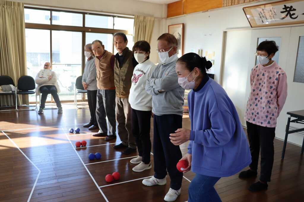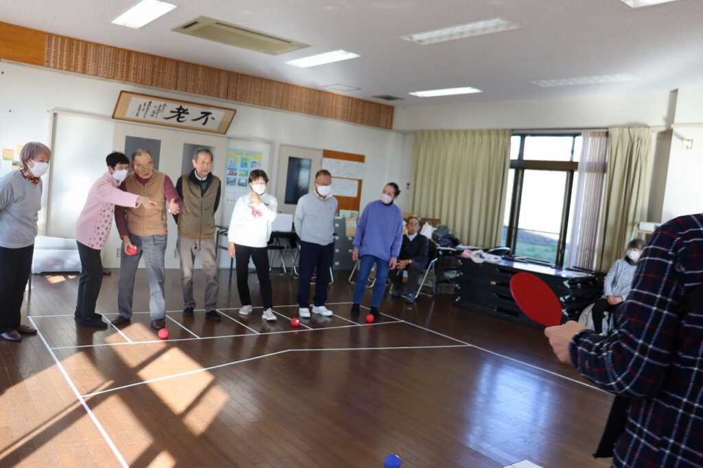 親睦会として2回目となるボッチャ交流です。くじで4チームに分かれてゲームを楽しみました。はじめは、皆さん様子を見ながら球を投げていましたが、慣れてくると「ジャックボールを狙って外に出してみるか」「あれだけ球が偏っているから上に乗せても良いかも」と各々作戦を考えて投球!しかし、強すぎたり弱すぎたりと思い通りにいかないこともしばしば。それでも、ナイスショットの時は敵味方に関係なく拍手を送り会場が盛り上がりました。