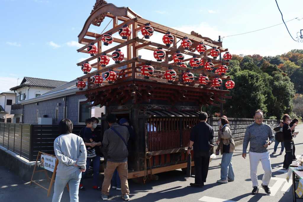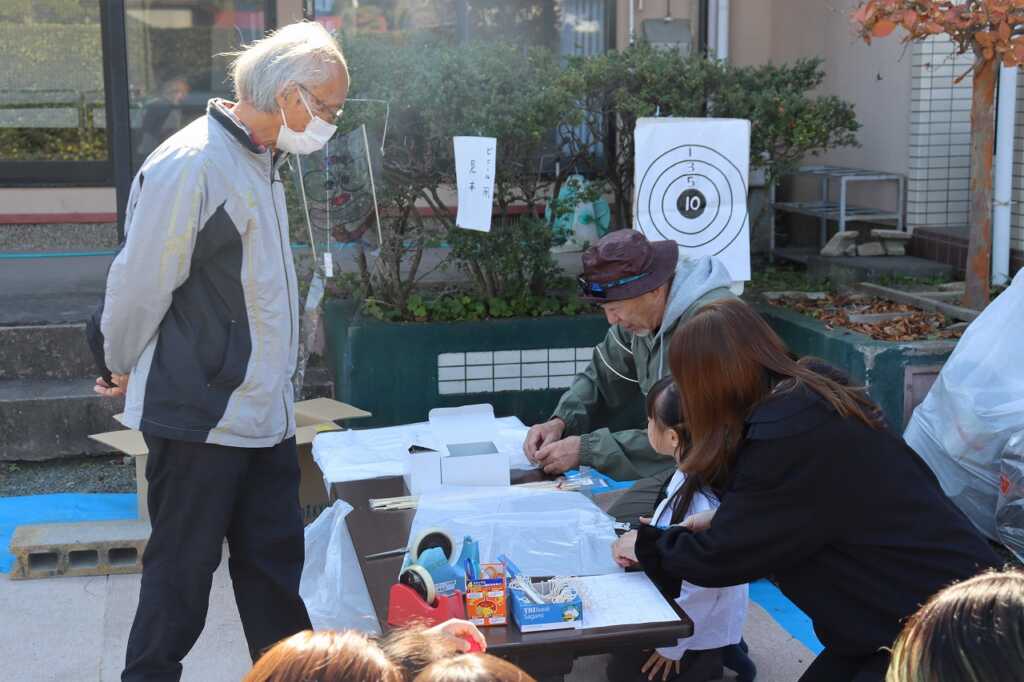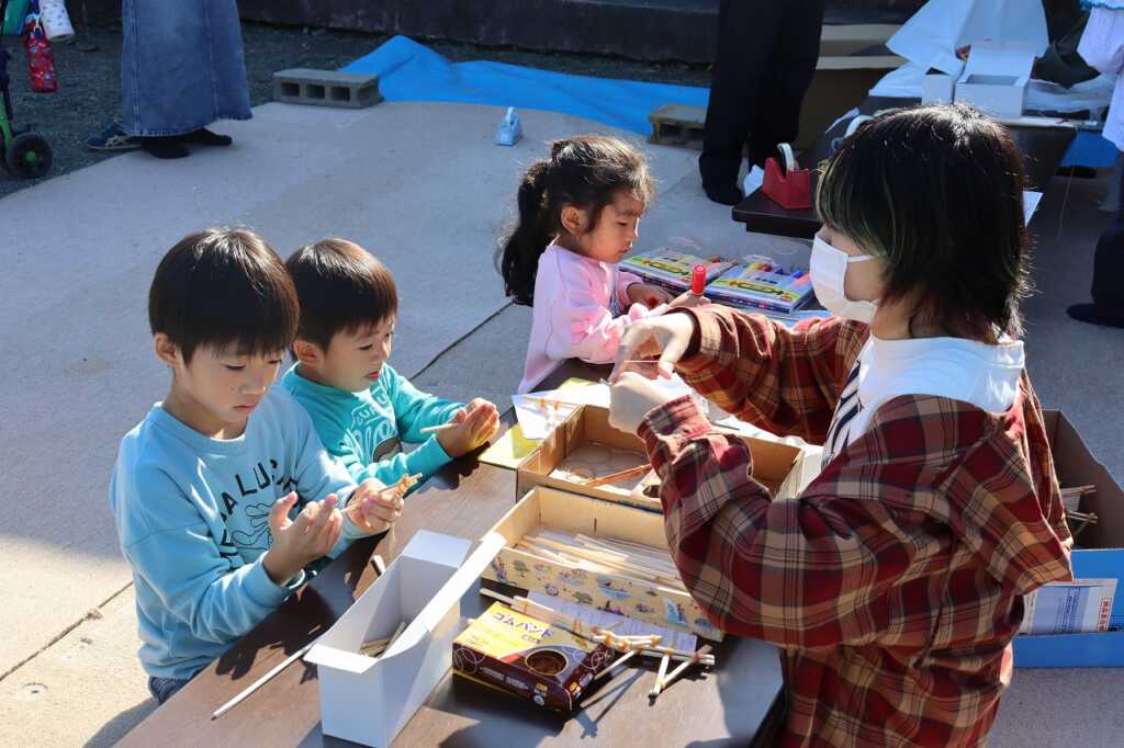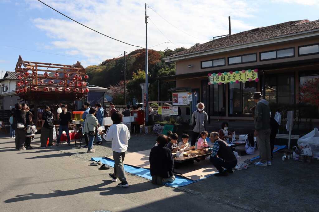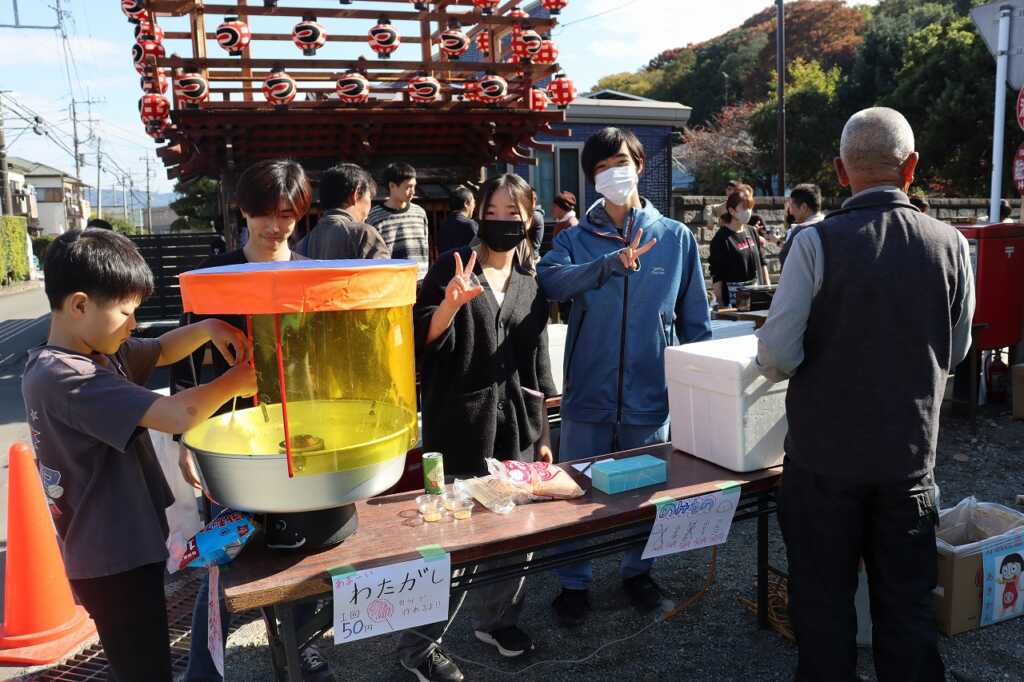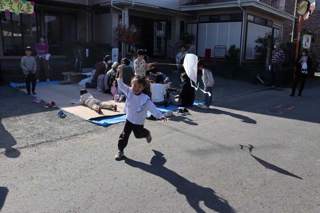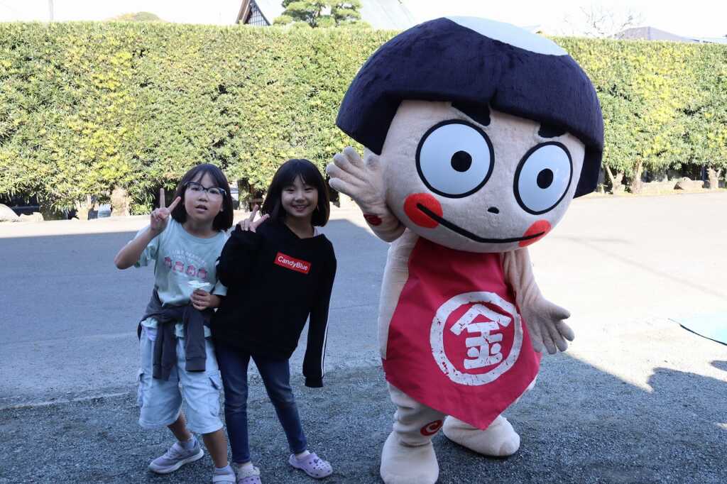 公民館の外では、お祭りを盛り上げるお囃子の演奏や、地域の皆さんによる飲食物の出店、凧や割りばし鉄砲づくりのワークショップが行われました。よいしょくんもお祭りに駆けつけ、子ども達は大喜び!一緒に記念撮影をしたり、握手をしたりと大人気でした。