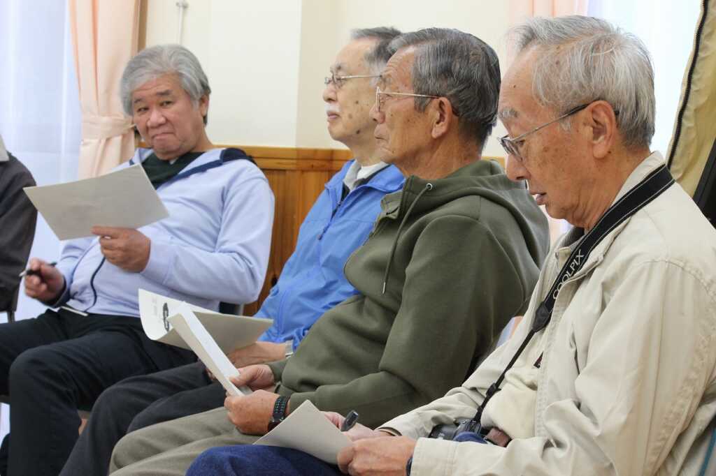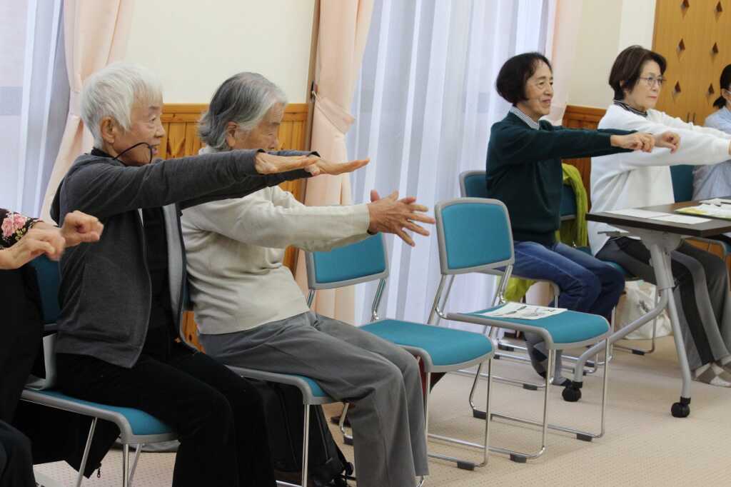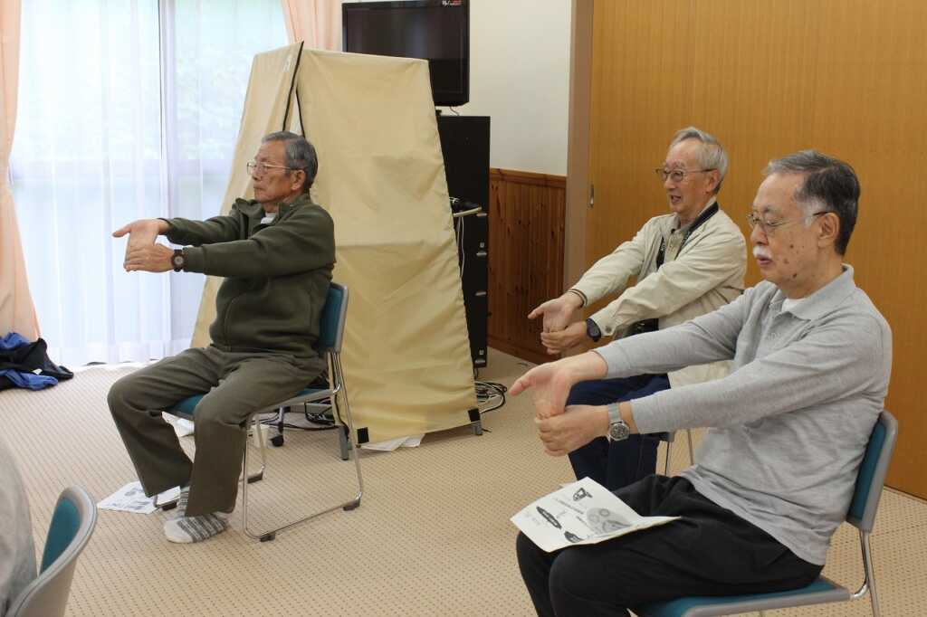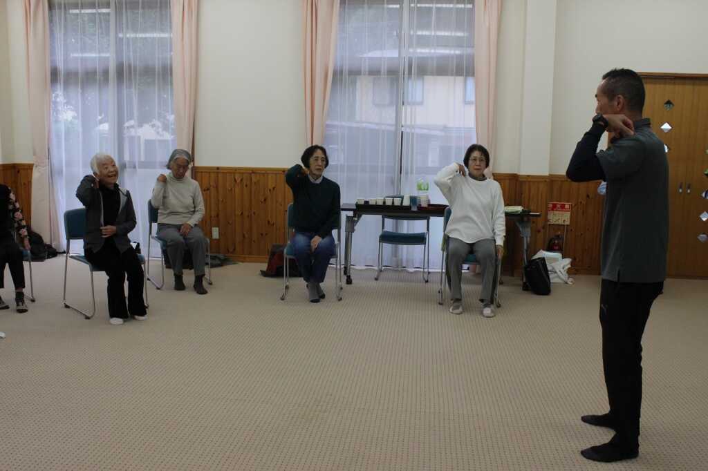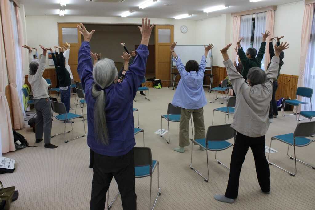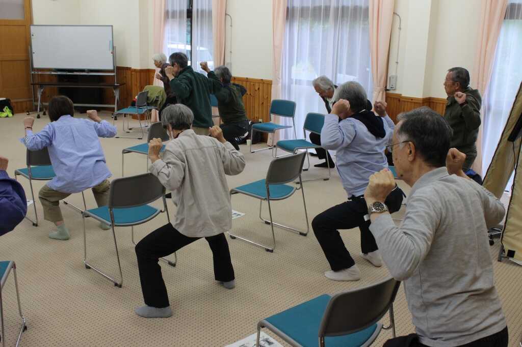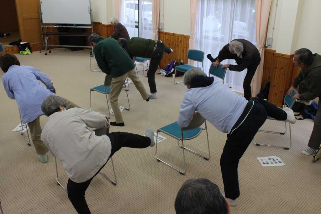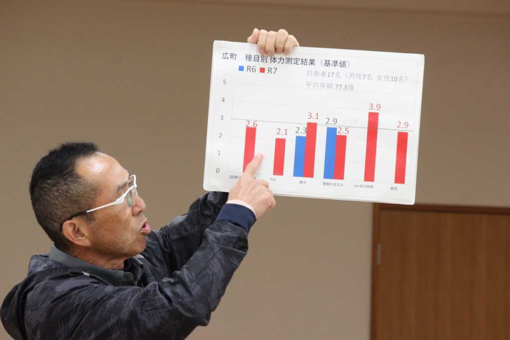 今回はフレイル予防教室として、健康運動指導士の吉井昭洋先生をお招きしました。健康度測定の結果説明では先生から「広町は比較的若い年代が多いが、結果は平均値。1年後もっと結果が良くなるよう、週に一度でもいいからできることをやってほしい」と繰り返し話がありました。参加者から「つったり浮腫んだりしやすい。効果的なストレッチ方法は」と質問が出ると、先生は「冷やさないことが大切。足裏のツボやひざの裏のマッサージを試してほしい。手でほぐすことで握力もつく」と具体的なアドバイスを送っていました。その後は、しこ踏みや重量上げの動作、身体のひねりのストレッチをして終了となりました。