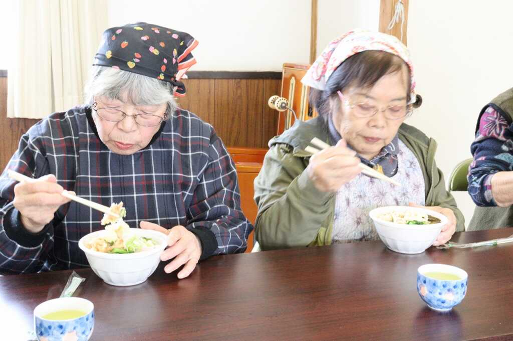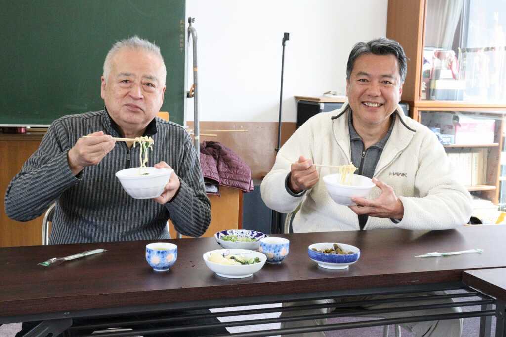 毎年恒例となった食事会です。前日からうどんを打ち、下ごしらえを終えたうえで、麺を茹であげ出汁からとった麺つゆとからませます。更に天ぷらを乗せると彩り豊かなうどんが完成!テーブルには持ち寄った漬物も並び、おかわりもたくさんいただきました。「一人だと冷凍やカップ麺のうどんしか食べないから、打ち立てはおいしいね」と大好評でした。