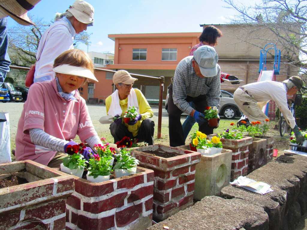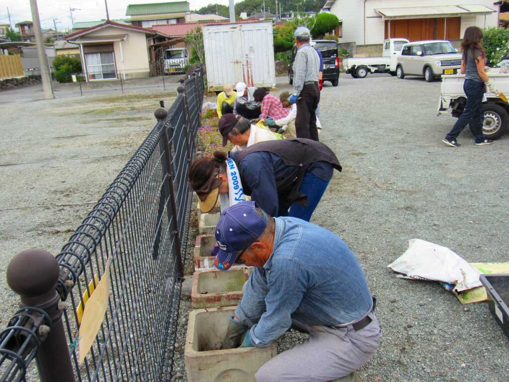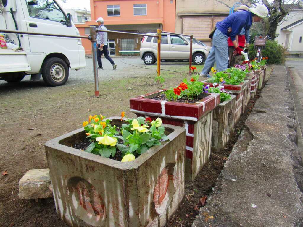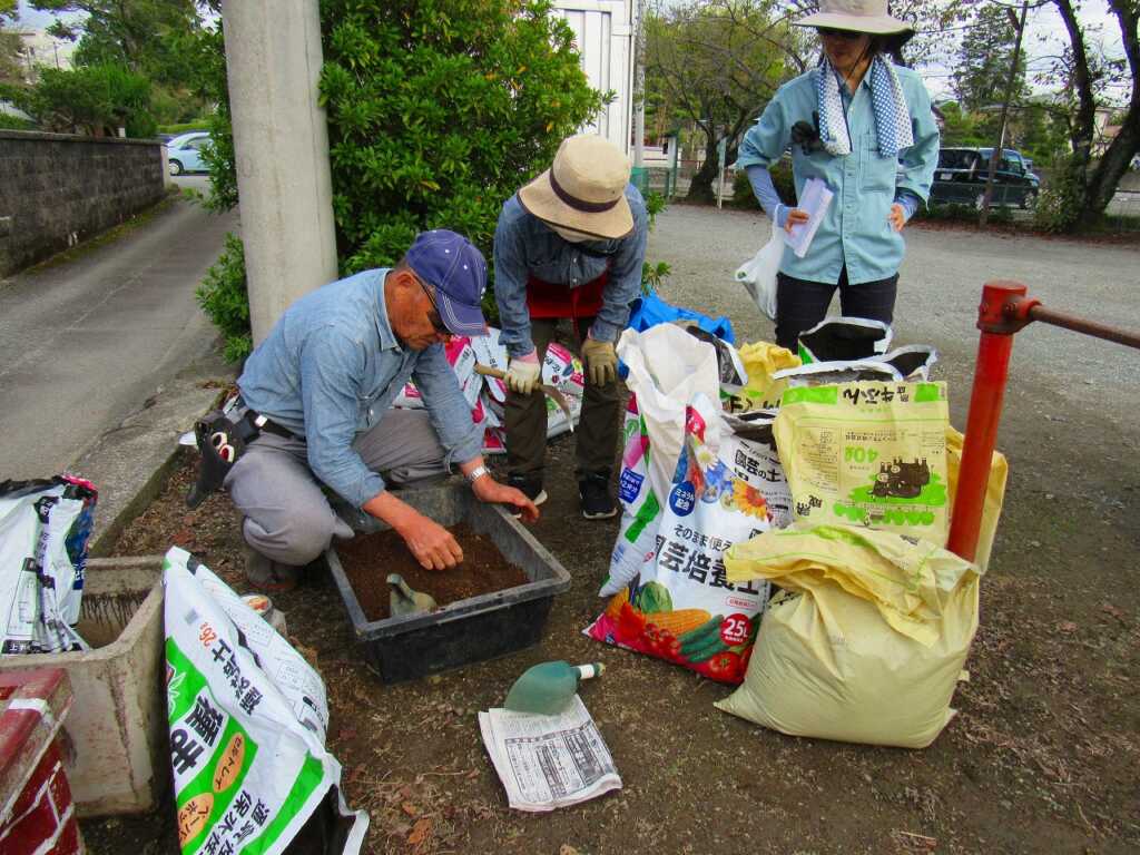狩野地域福祉会が発起人となり、花壇づくりをしました。この活動のために集まった「花とも」が初めて集合し、福山福祉会長の挨拶と自己紹介からスタート。花ともや地域の協力者から花や球根、土などが多く寄付され鉢が足りなくなるほどでした。土作りから花植えまで行い、花壇が華やかになると会員の顔も綻んでいました。花は、公民館と筏場分館に植えられています。花ともが頑張って育てている花を、皆さん是非ご鑑賞ください。