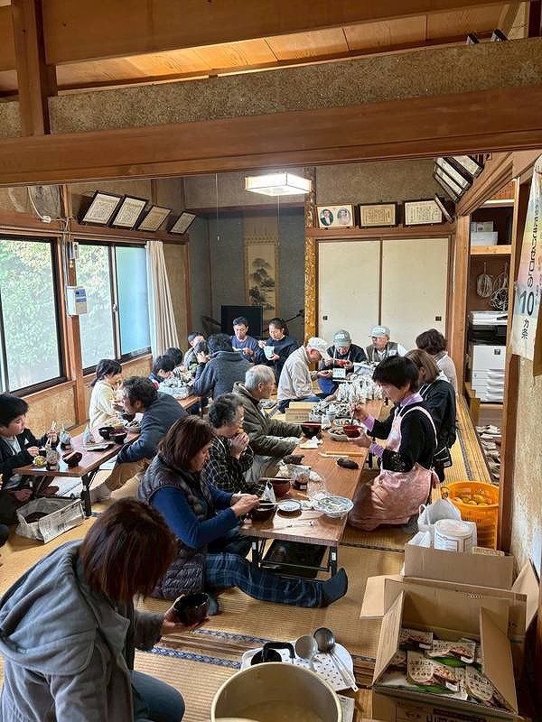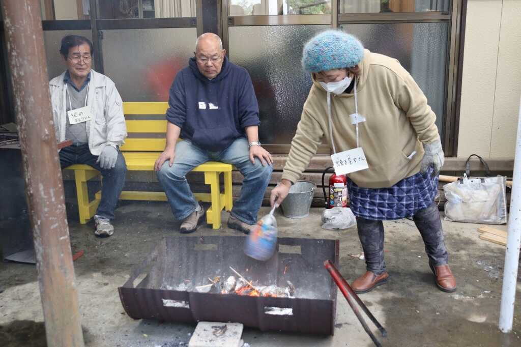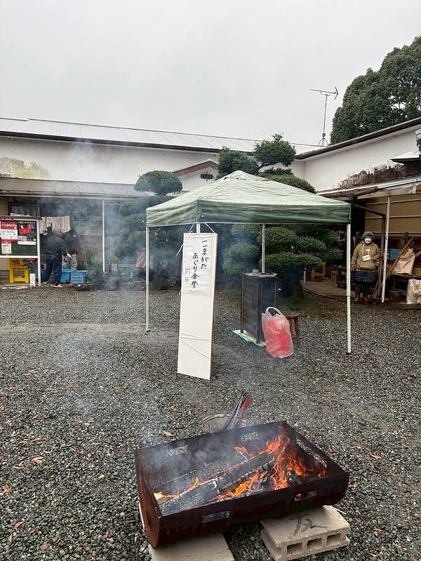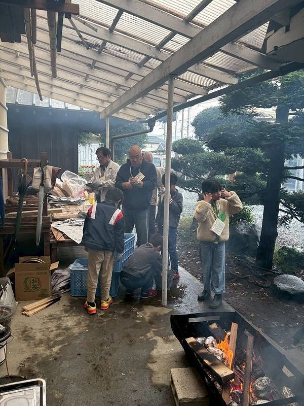 協議体の話し合いの中から始まった地域の畑「こまがたあぐり」。自治会の公民館事業として、皆で食べるイベントが開催されました。畑で採れたさつま芋は、焚火でホカホカの焼き芋にして提供されました。他にも、地域の方によるお手製の豚汁や防災食の体験も兼ねてアルファ米も振舞われ、皆で食卓を囲んで頂きました。