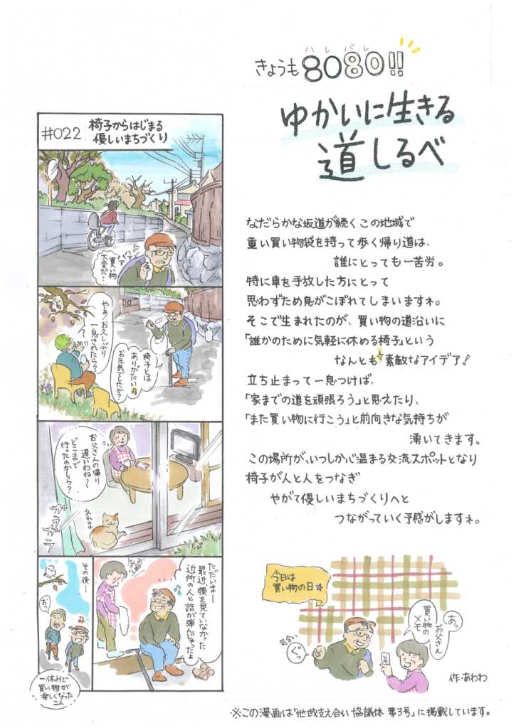「地域支えあい協議体」ページ内に、四コマ漫画「きょうも8080!ゆかいに生きる道しるべ」最新号を掲載しました。ぜひ一度お読みください!