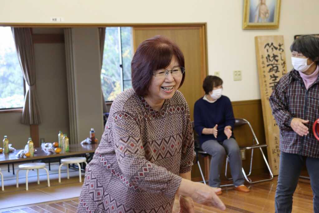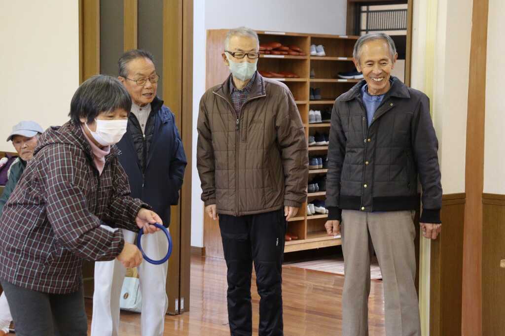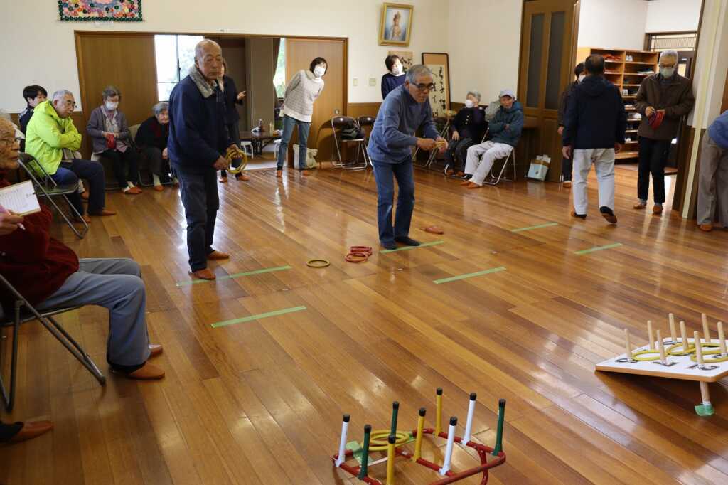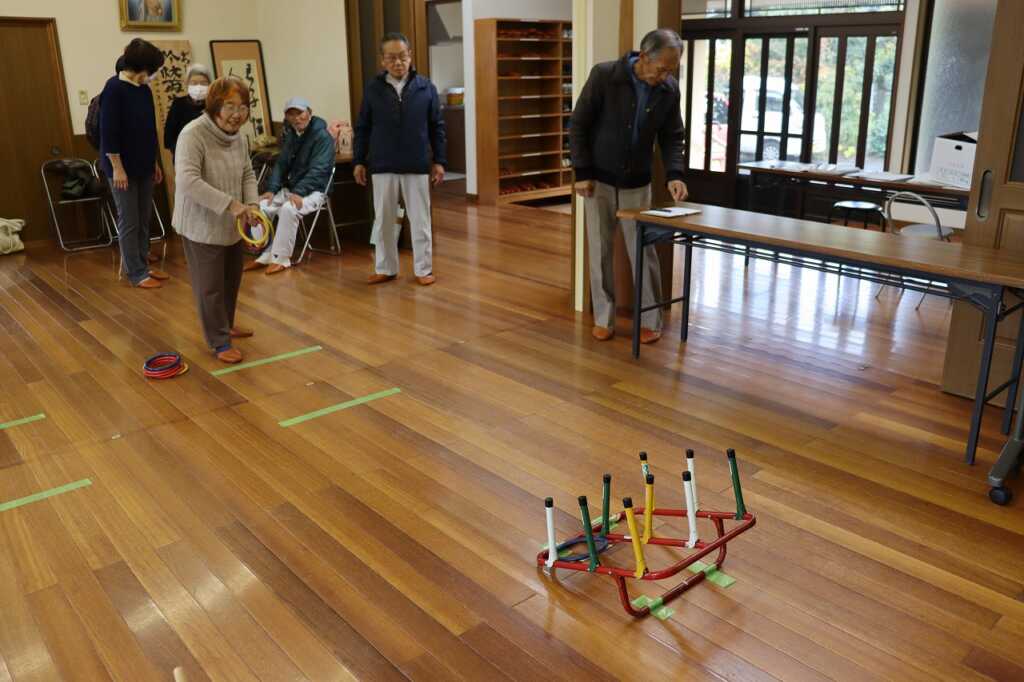 | 毎年恒例となっている地域福祉会と長生会の合同研修会が開催されました!昨年大人気だった輪投げを、今年も引き続き楽しみました。狙い通りにうまく入らず、「ルールは単純なのになかなか難しいね」という声も聞かれましたが、なかには9点に3回も入った強者もいらっしゃいました!他の参加者から「すごい!」と大きな拍手が贈られました。 輪投げを楽しんだ後は、お茶菓子をいただきながら話に花を咲かせました。小澤地域福祉会長が丹精こめて育てた早生みかんも振舞われ、「甘くて美味しい!」と好評でした。 |