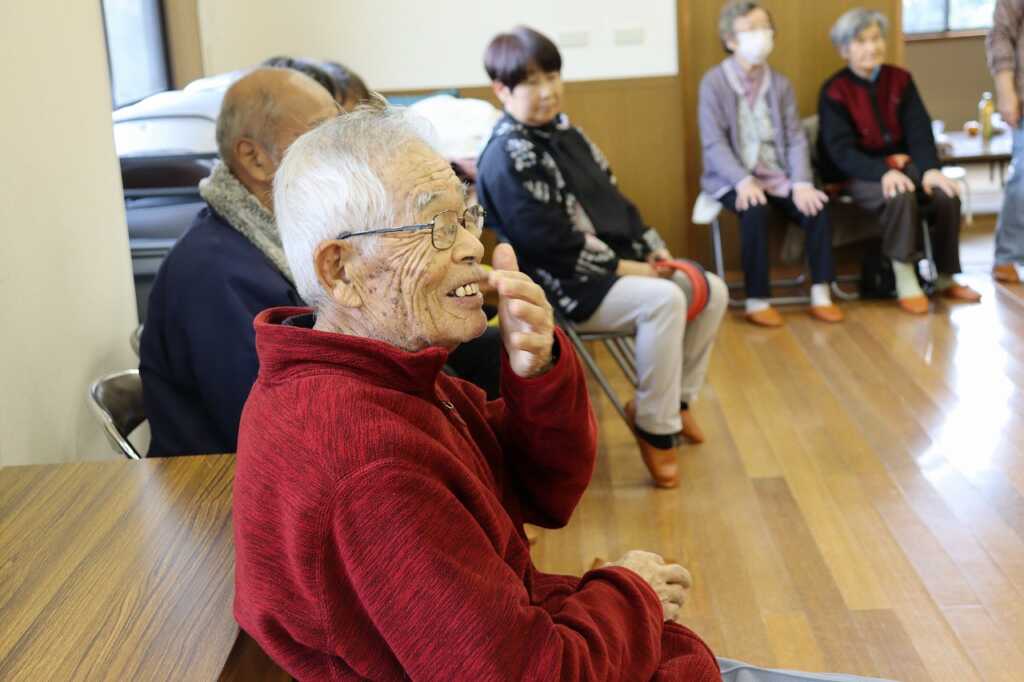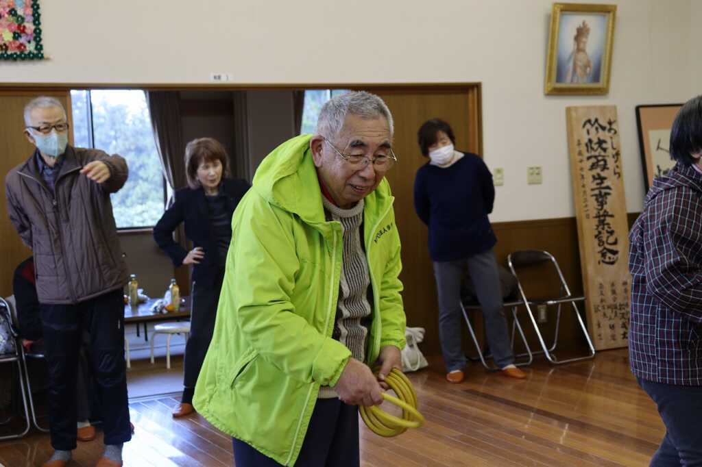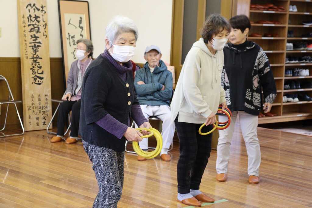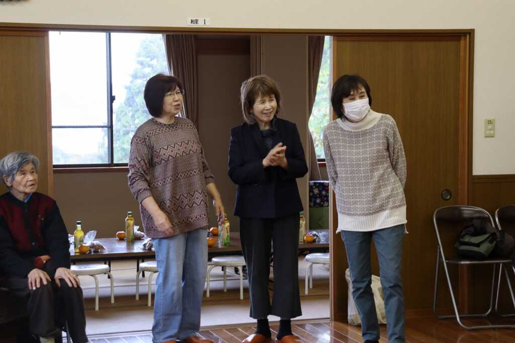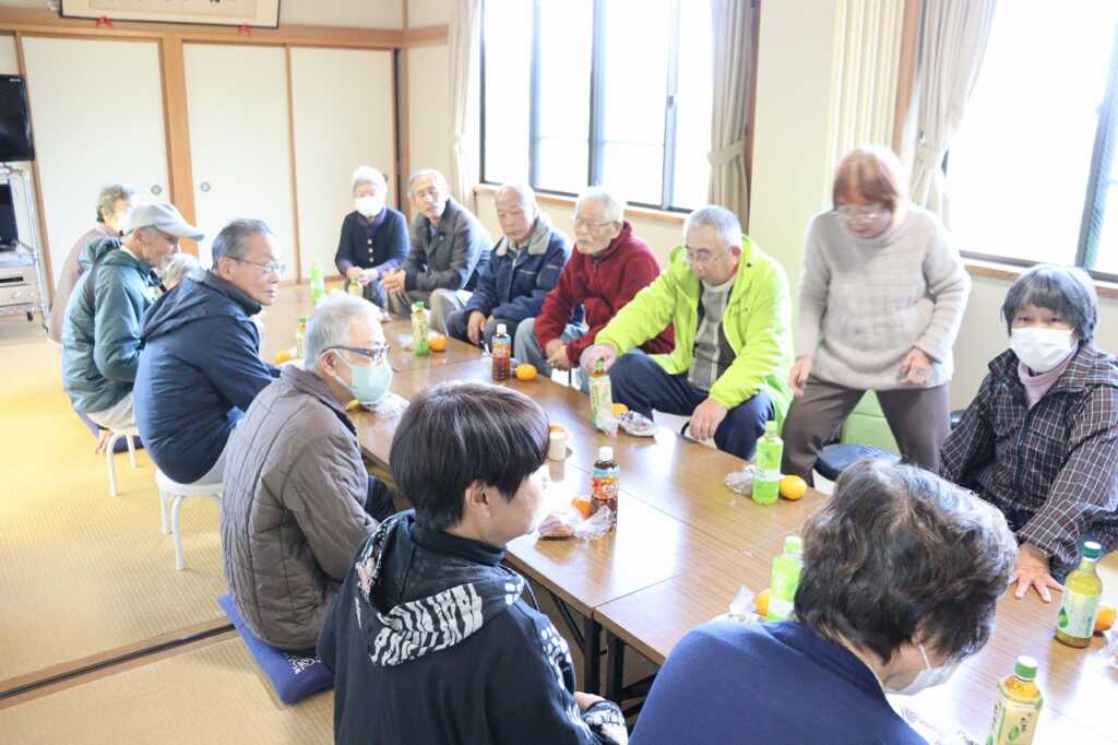 | 毎年恒例となっている地域福祉会と長生会の合同研修会が開催されました!昨年大人気だった輪投げを、今年も引き続き楽しみました。狙い通りにうまく入らず、「ルールは単純なのになかなか難しいね」という声も聞かれましたが、なかには9点に3回も入った強者もいらっしゃいました!他の参加者から「すごい!」と大きな拍手が贈られました。 輪投げを楽しんだ後は、お茶菓子をいただきながら話に花を咲かせました。小澤地域福祉会長が丹精こめて育てた早生みかんも振舞われ、「甘くて美味しい!」と好評でした。 |