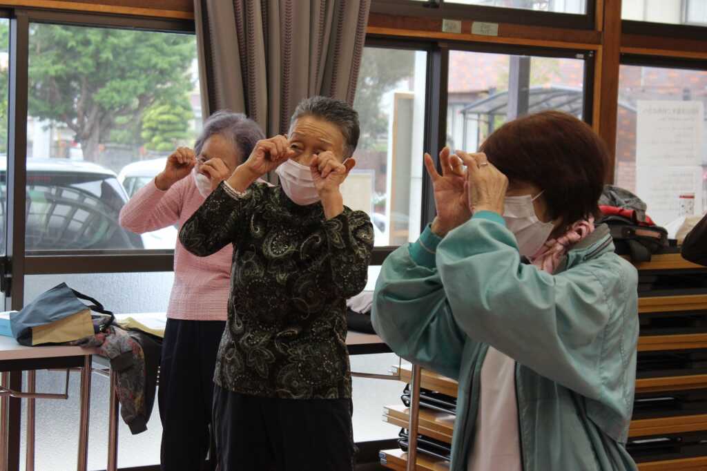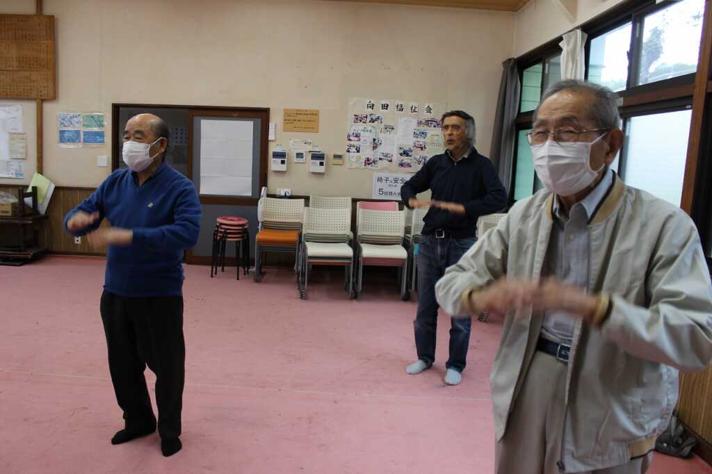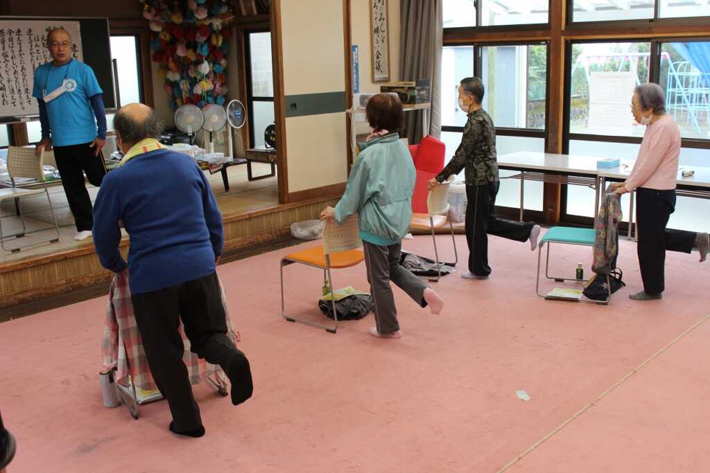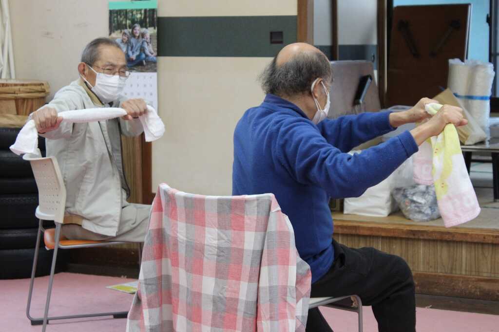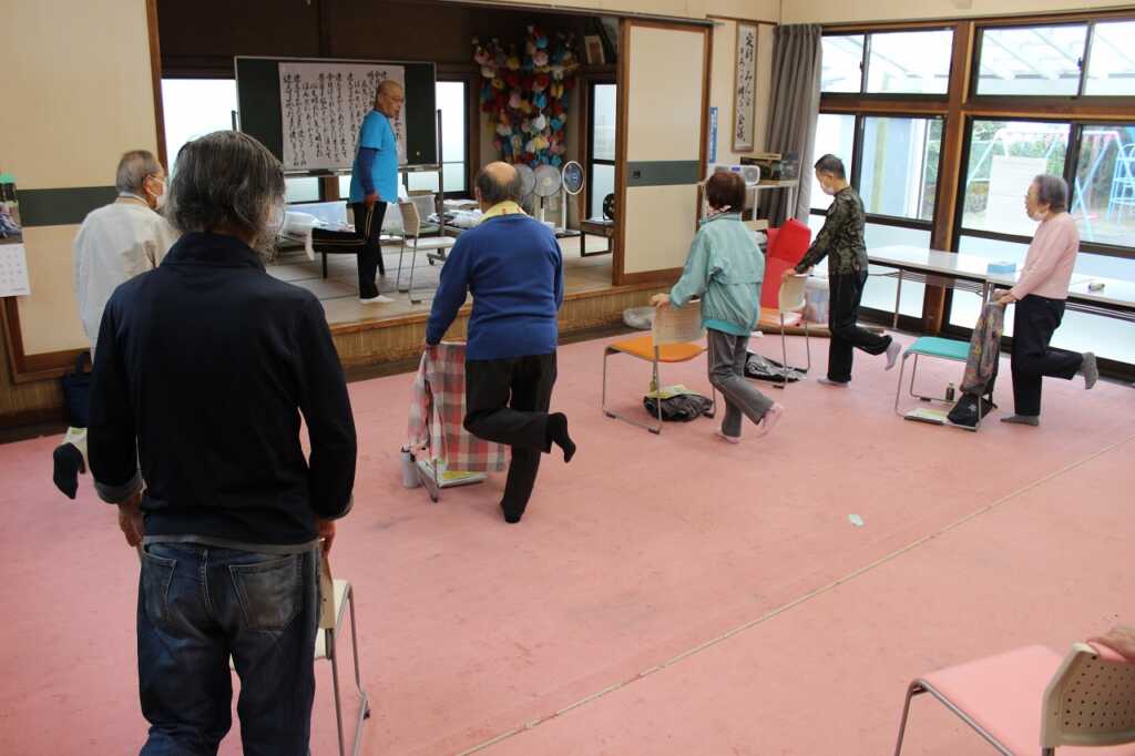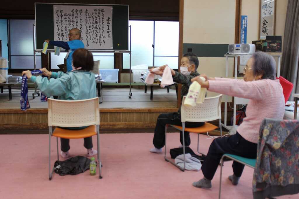 準備体操で身体をほぐしてから、6つの筋肉をゆっくり8カウントして鍛えていきました。椅子スクワットでは参加者も思わず「効いてくる」と苦笑いしながらも、全員見事にやり遂げました。介護予防サポーターからは「スクワットは6つの筋肉を網羅している。普段の生活でお茶を飲んだりお手洗いに行ったり、何度も立ち座りの動作があるが、その時に思い出して1回でもいいからスクワットの動作をやってみると良い」と伝えられました。