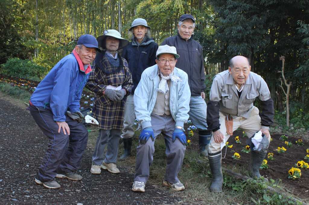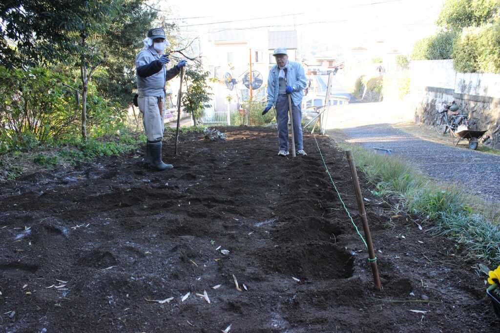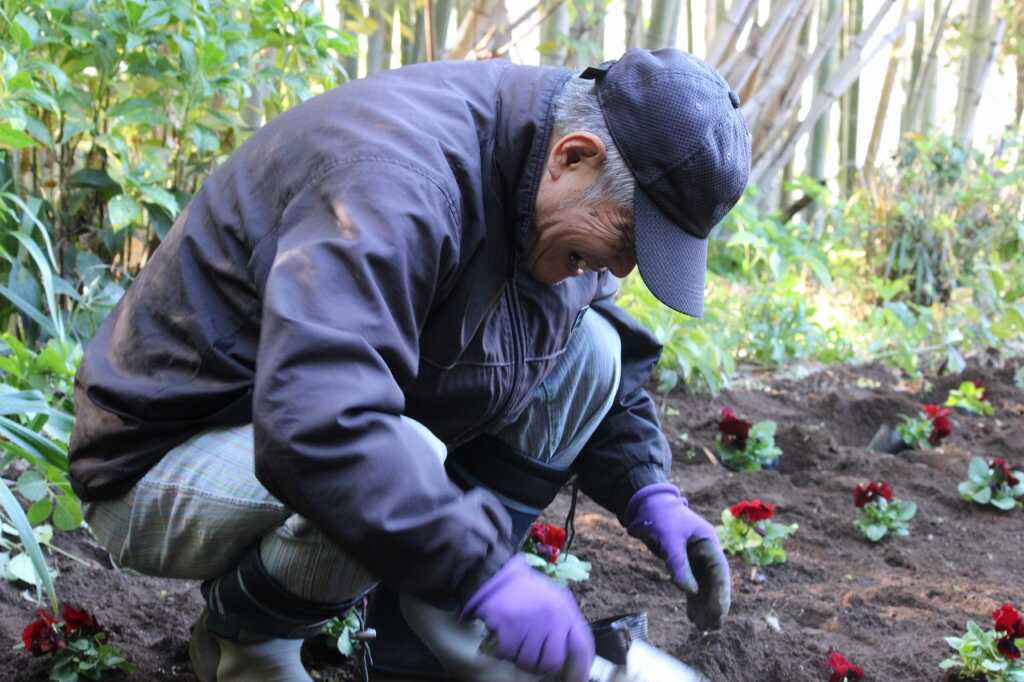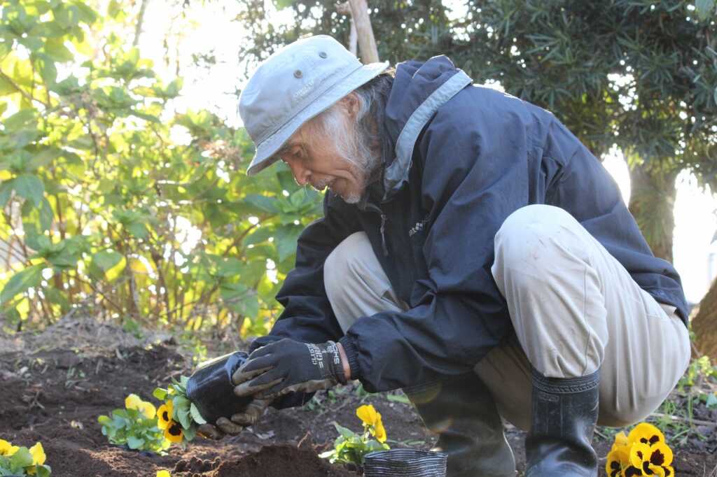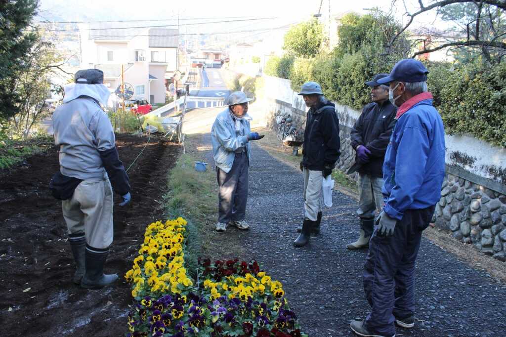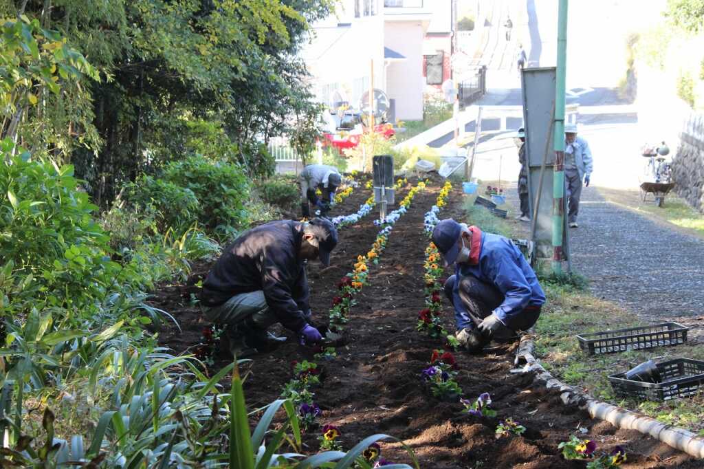 事前の草取り・掘り起こし・肥料を入れる作業を経て、6名の会員で300株のパンジーを植えました。初めに、代表の加藤さんお手製の縄を使って、株の位置が真っすぐになるよう目印を付けてから、他の会員で色の配置を決めていきました。「明るい色が続いた方がいいよ」「赤っぽい色は少し沈んでしまうな」と、悩みながらも、相談して華やかな花壇に仕上げていきました。