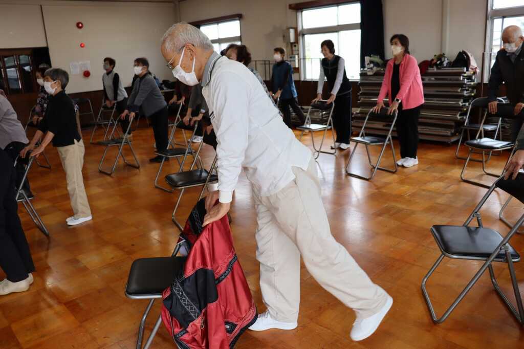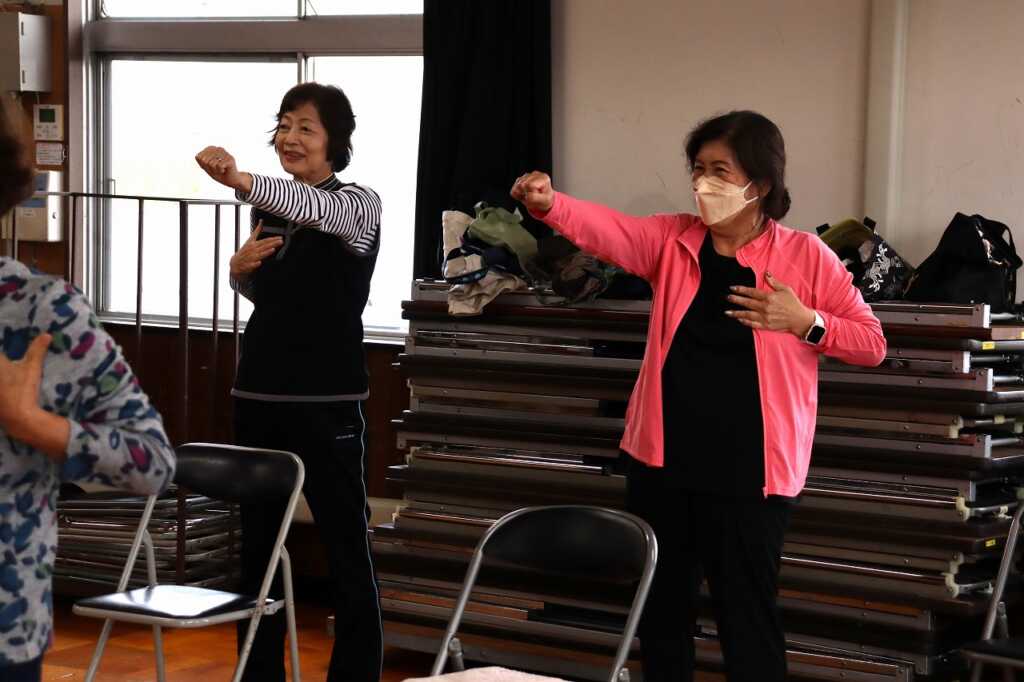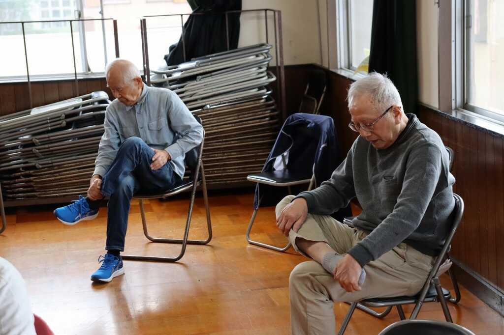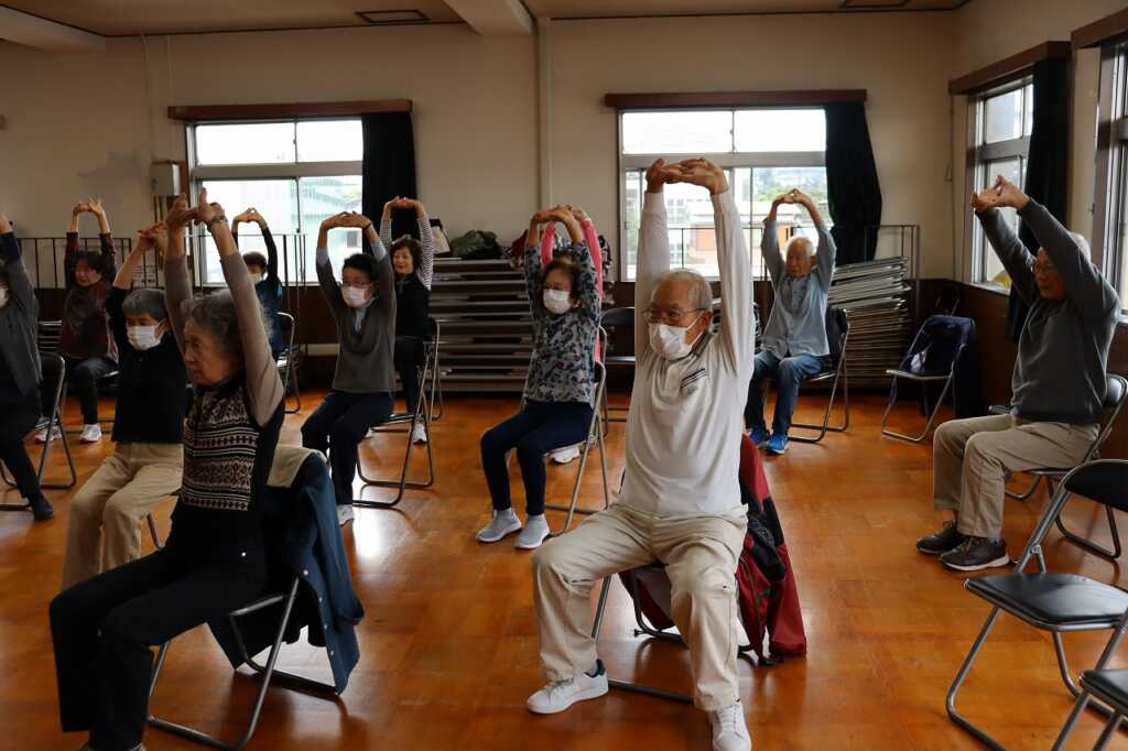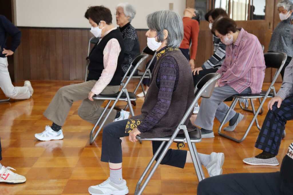 | 今日も大勢の方が公民館に集まり、皆で体操に励みました。全身くまなくストレッチして伸ばした後は、DVDを見ながら「貯筋体操」と「のびのび体操」を行いました。じわじわと下肢に負荷がかかる筋トレだったので、「この体勢結構きついね」「片足立ちの60秒は長く感じる」という声も聞かれましたが、互いに励まし合いながら取り組んでいました。終わった後は皆さん達成感に満ちた表情をされていました! 次回は11月7日(金)の開催です。ぜひご参加ください。 ~10月24日山崎公民館にて |
