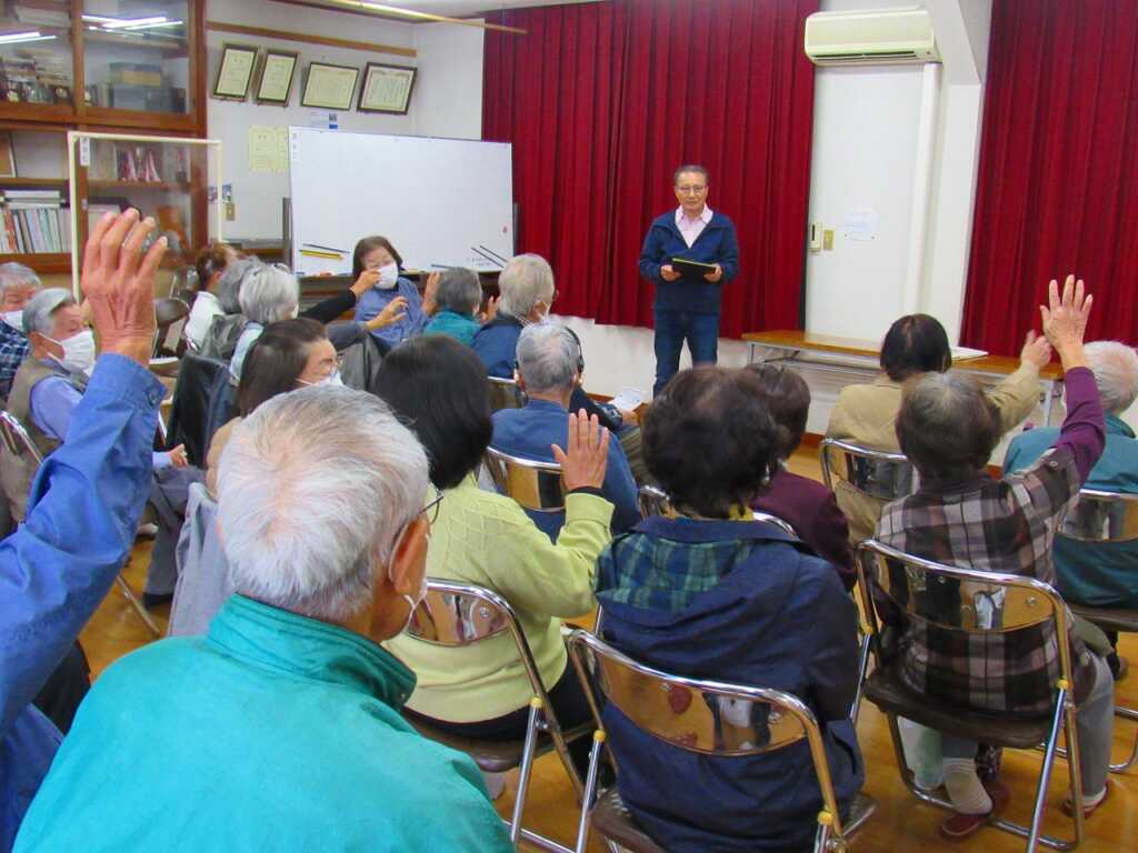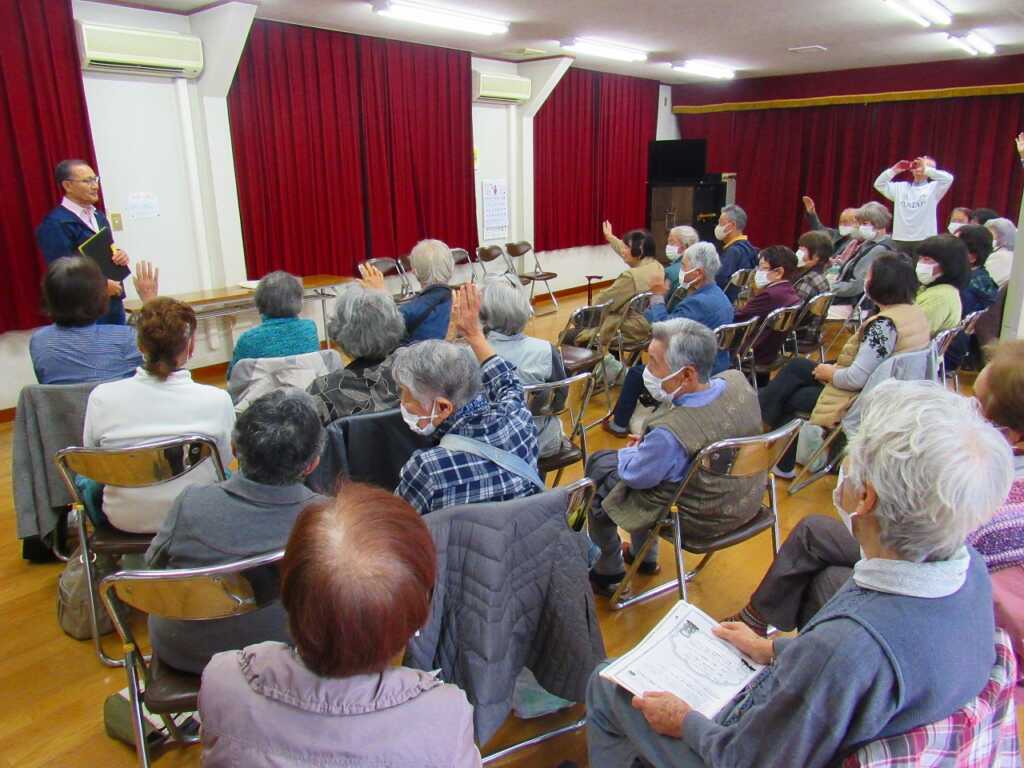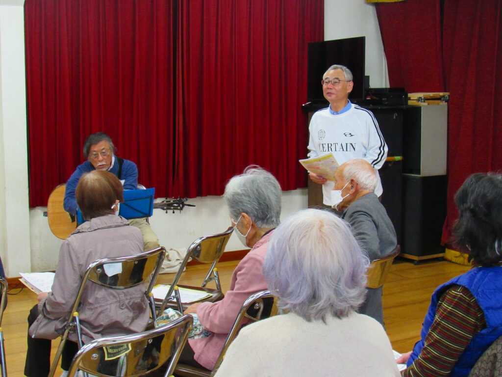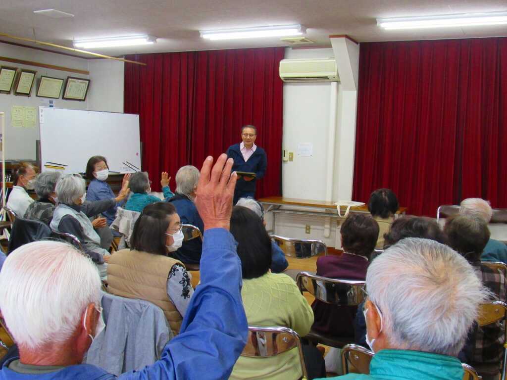 | 今年度2回目の竹の会が開催されました。オカリナグループなごみの澄んだ音色に癒され、秋の歌を合唱しました。「紅葉」では輪唱に挑戦!初めて合唱したとは思えないほど素敵なハーモニーが生まれました。オカリナ演奏の後は、○×クイズが出題され、「パンダのしっぽは白?黒?」「一円玉の原価は1円?それとも高いの?」など意外と知らない豆知識に関心が集まりました。 |