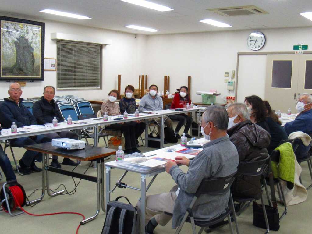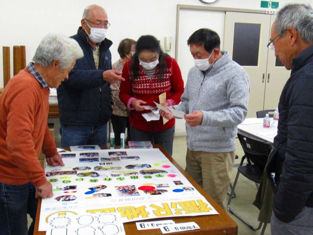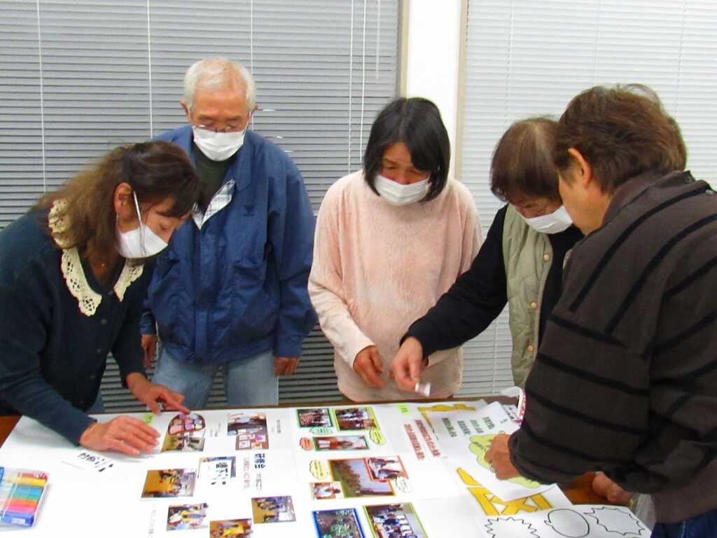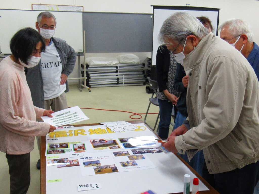 | 社会福祉大会で展示するパネル作りと研修会を行いました。パネル作りでは、各地域で作成してきたものを2枚の模造紙に貼りましたが、参加者の提案でその場でアイディアを出してデザインをすることもありました。 研修会では、防災安全課から「災害に備えて~各種災害とその対応~」と題して、地震・水害・噴火の際に起こる事、気を付けておくべきことをお話いただきました。特に、水害について福沢地区の大半が浸水する可能性があることを伝えられると、皆さん対策について真剣に耳を傾ける様子がありました。 |