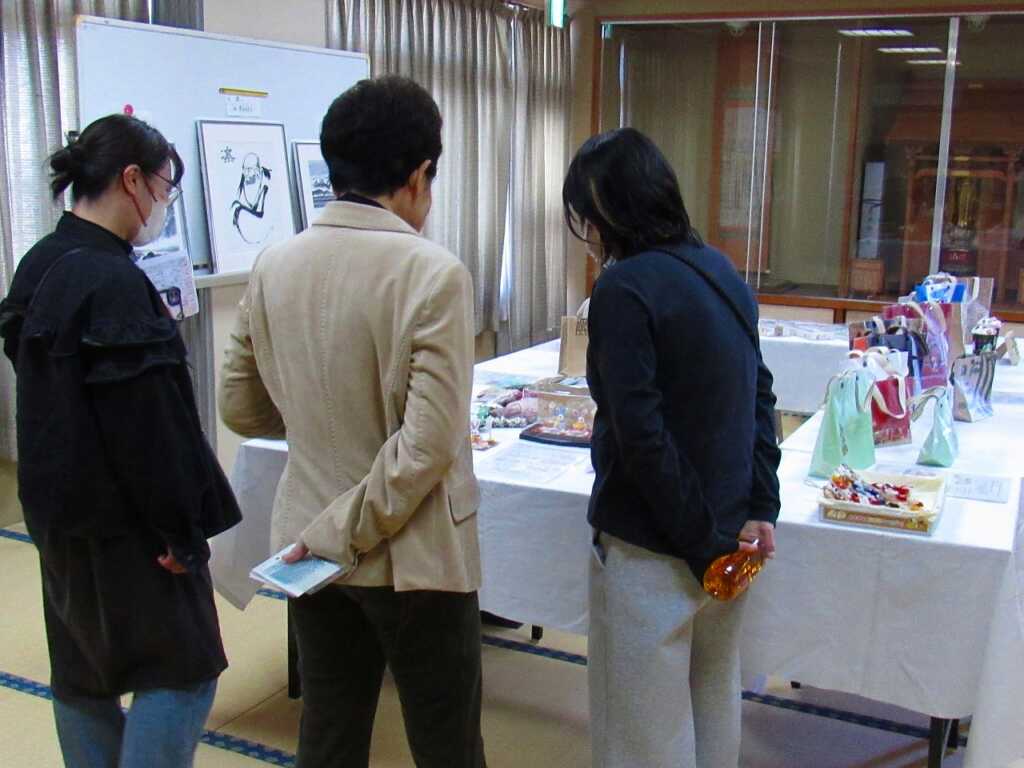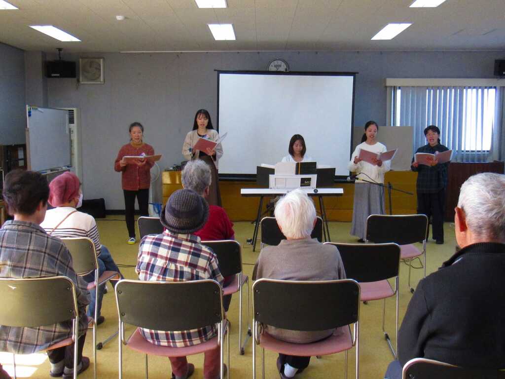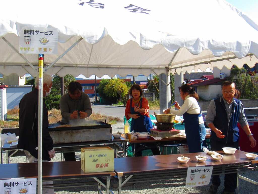 | 公民館の1階では、合唱やハーモニカの演奏などの発表があり、来場者も一緒に歌声を響かせました。2階では、地域の方やみんないっしょに井戸端会議で作成した作品が並びました。公民館の外では、地域の方の作物販売やジュニアリーダーによるバルーンアートと綿菓子の配布がありました。福祉会は、芋煮・石焼き芋・焼きそばを無料配布しました。子どもから大人まで食と芸術を楽しむ文化祭となりました。 |