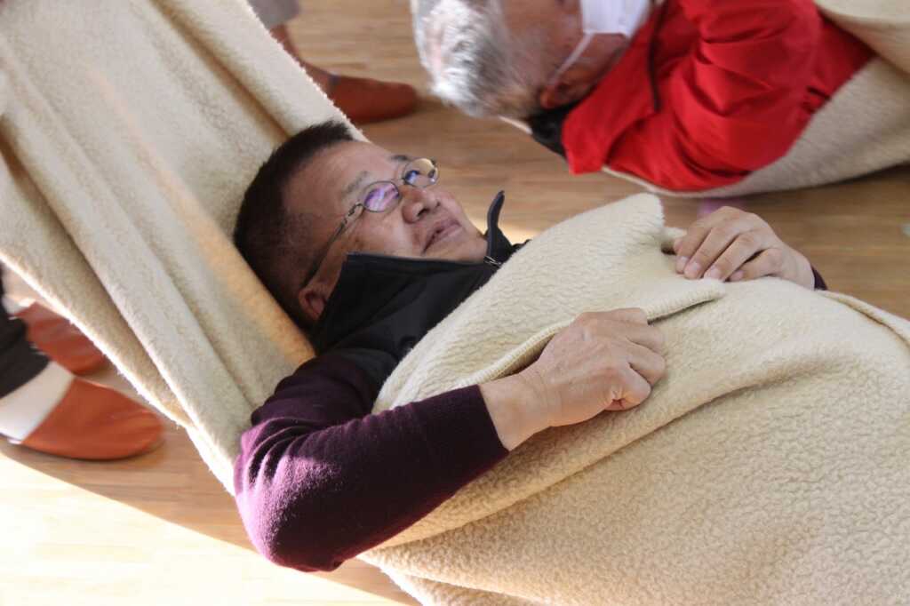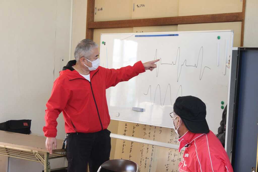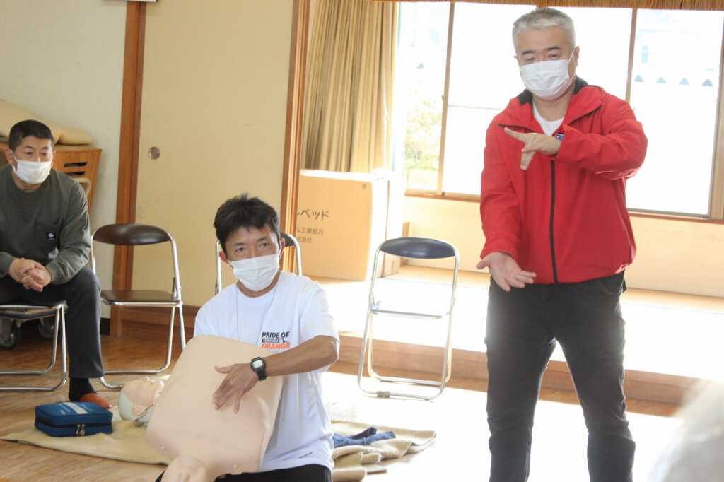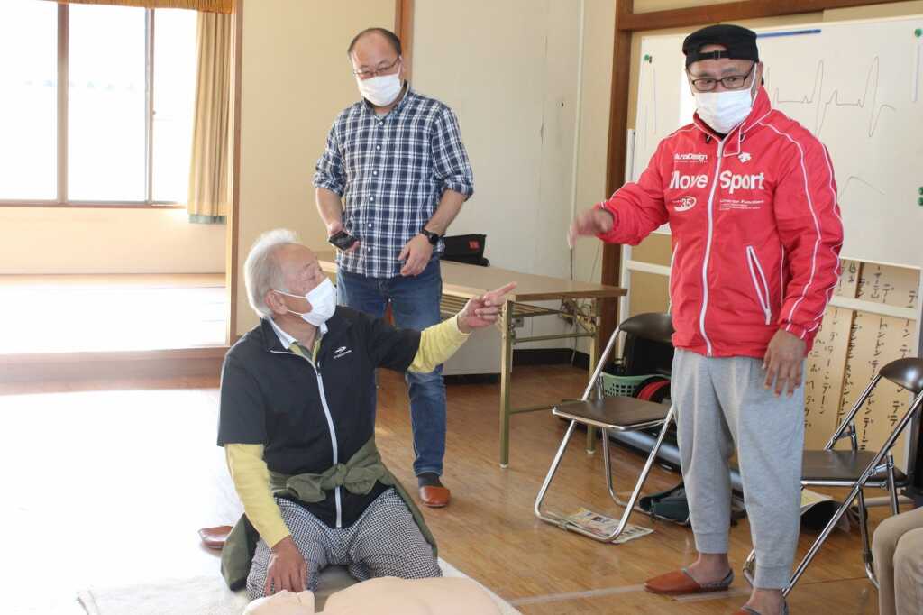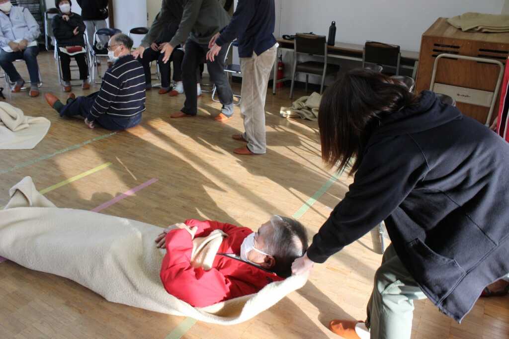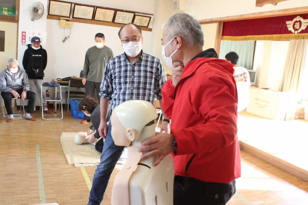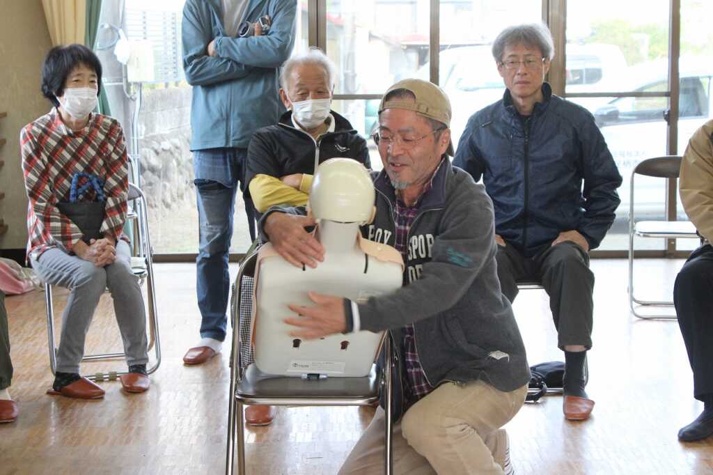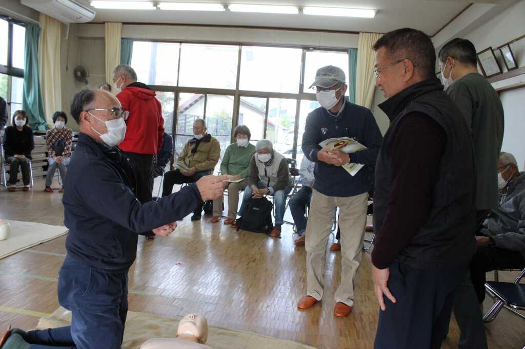 | 現役消防士である小田原市消防職員協議会の皆さんを講師に迎え「その手で守ろう!福泉自治会を!」と題した講演と実技を行いました。講師は「災害が起きたとき、すぐに助けに来ることは出来ない。普段から顔の見える関係性になってほしい。今日はぜひ隣の人と知り合いになって帰って」と強く訴えていました。その後AEDを使った倒れた人への対応を一人ひとり体験。慣れてくると、喉に物を詰まらせた場面や、浴槽で沈んでいる方を見つけた場面など、応用パターンも挑戦。搬送法では、倒れている方を斜めに寝かせて包むように運ぶ練習をしました。参加者は「実際にやってみないと分からないことがたくさんあった」と感想を述べ合っていました。 |