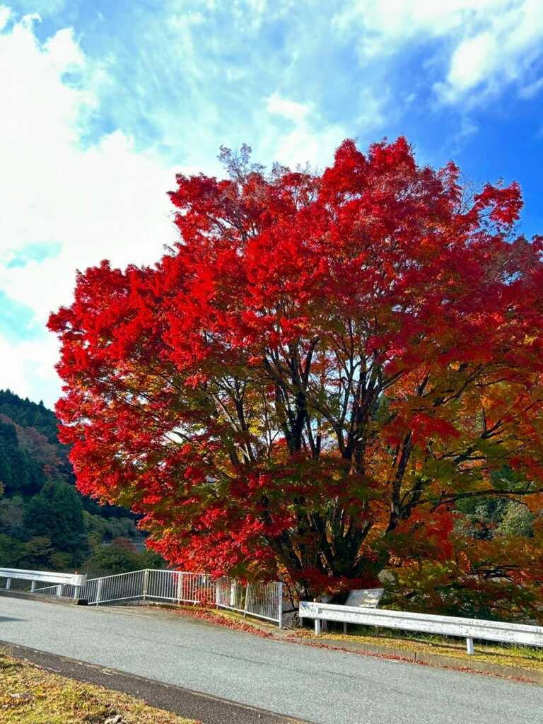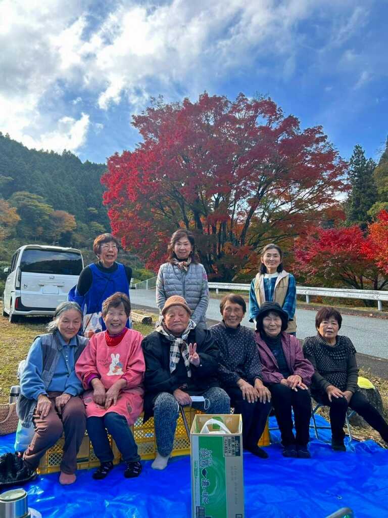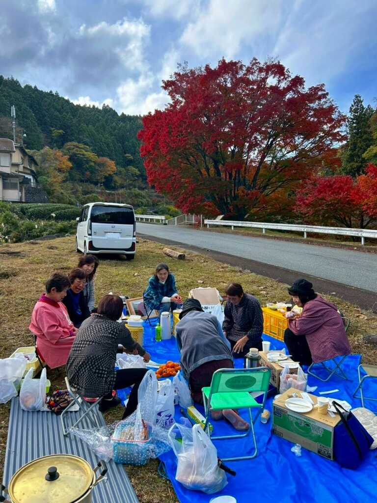 | 数年ぶりの紅葉を見る会の開催を楽しみました。すっかり秋の色が深まり、地蔵堂にある通称“大紅葉”も鮮やかな赤色に染まっていました。綺麗な景色に食欲も進みました。 (お写真は、福祉会の和田会長からいただきました。) |