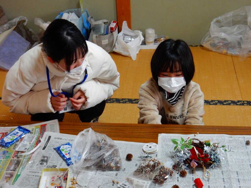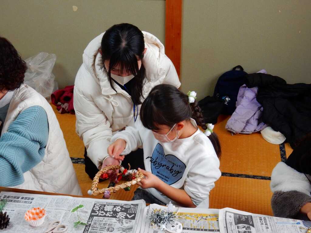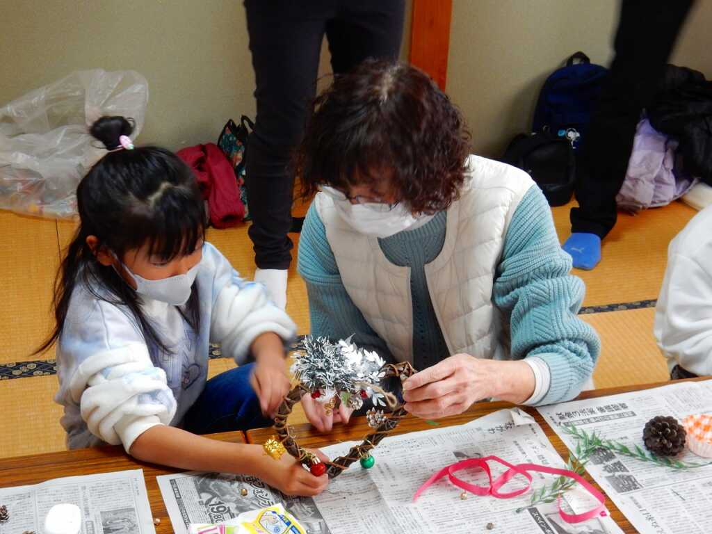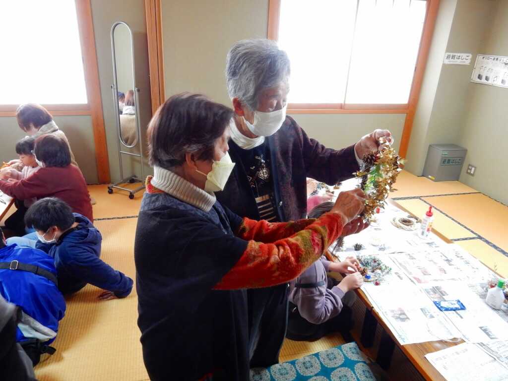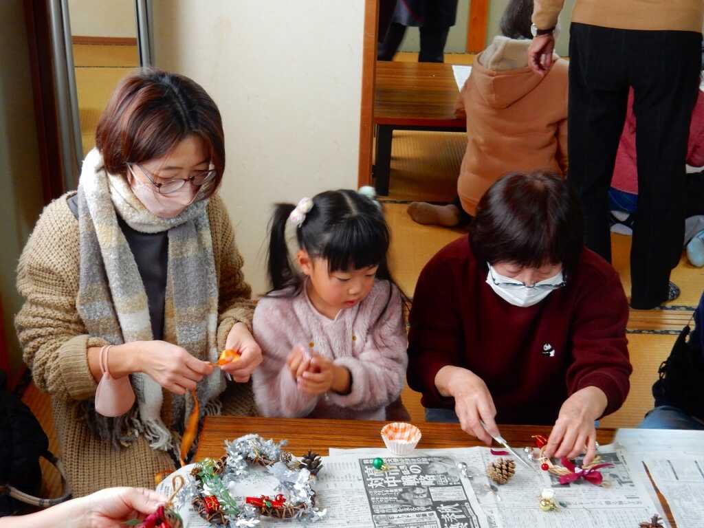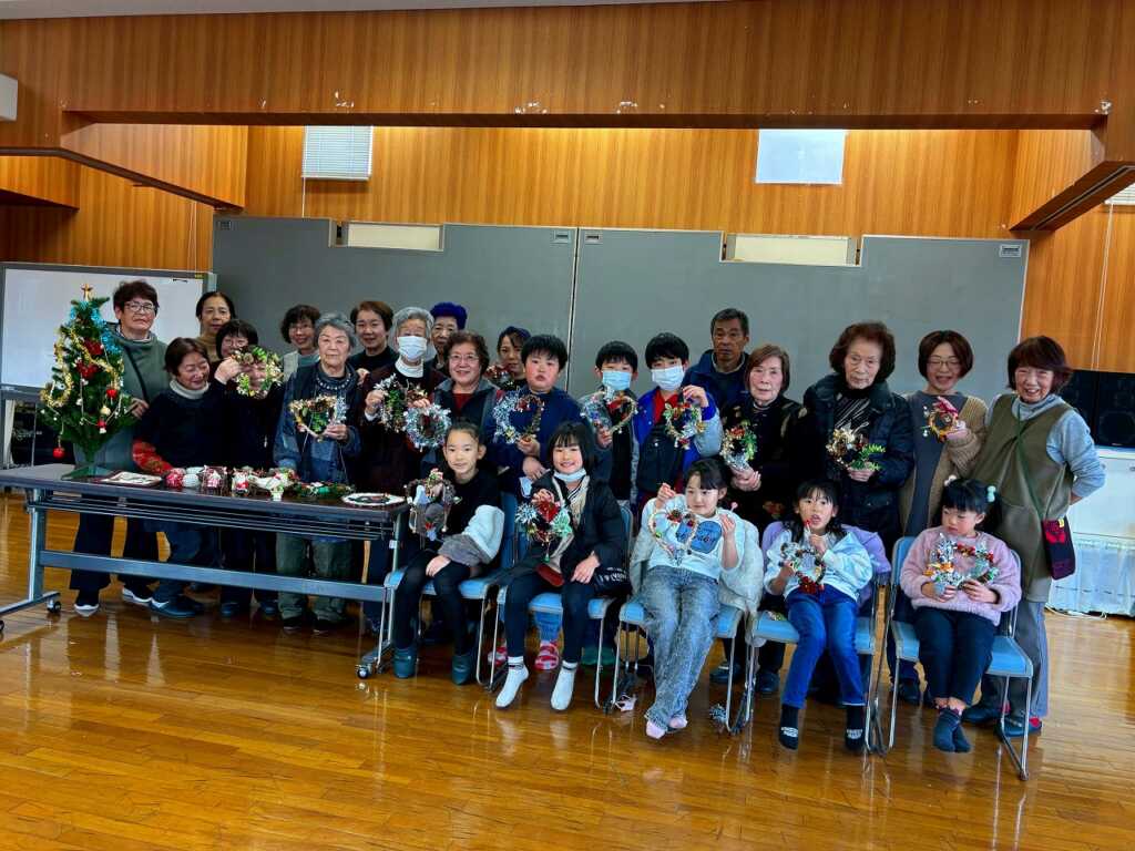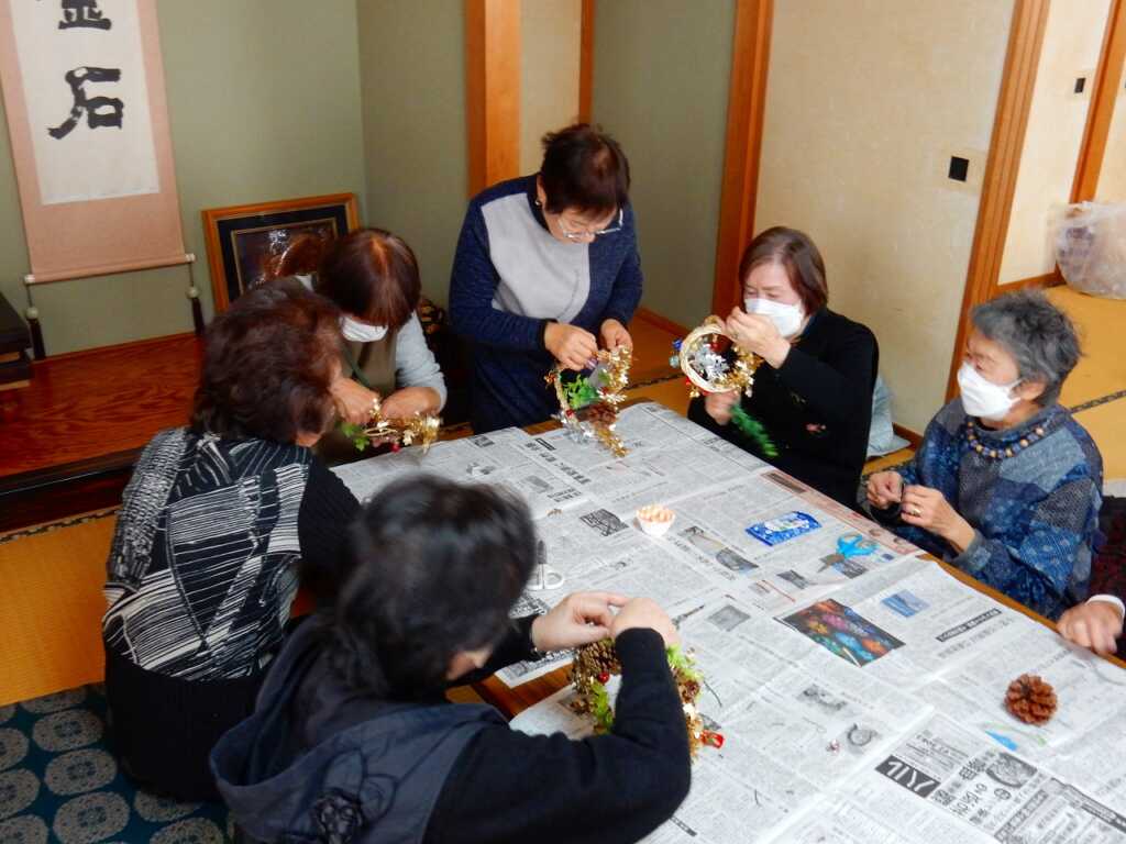 | 今回はクリスマス会でクリスマスリースを作りました。様々な種類の飾りが用意され、参加者の皆さん飾り付けに迷いながらも世界に一つだけのクリスマスリースが完成しました!最後は作ったクリスマスリースと一緒に集合写真を撮りました! (お写真の一部は、矢野会長からいただきました。) |