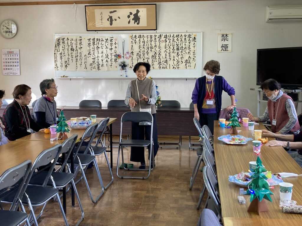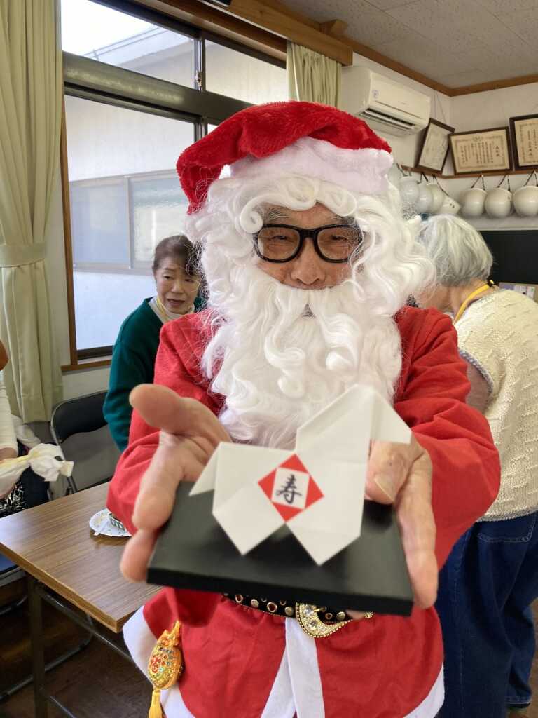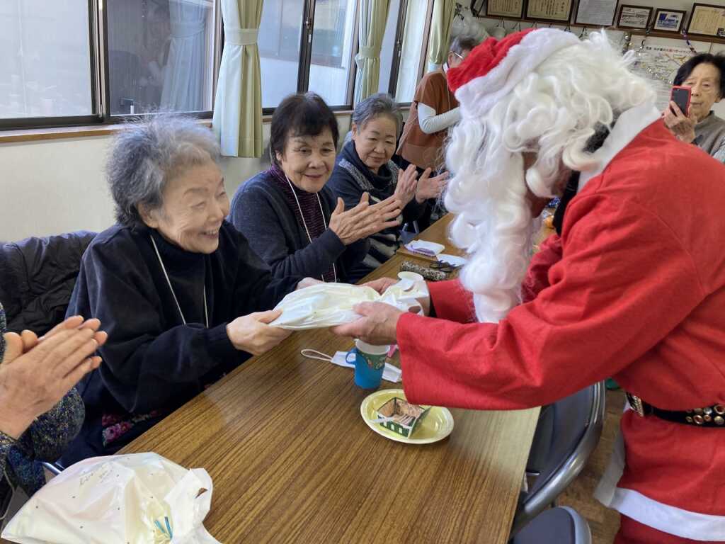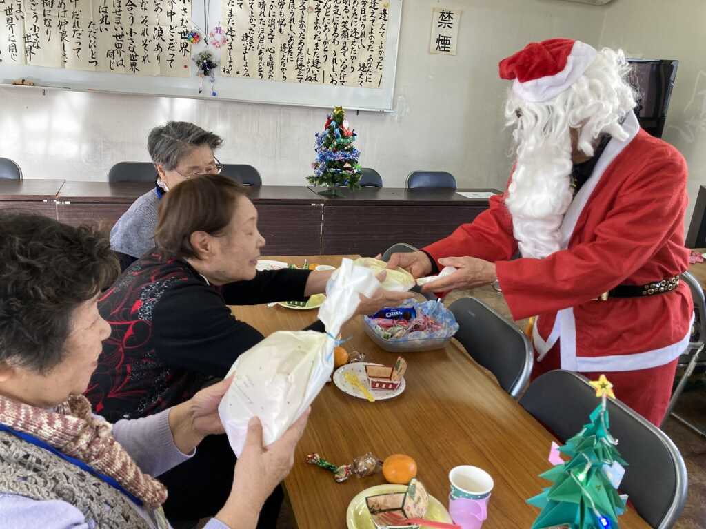 今回は1年の締めくくりとしてクリスマス会が開催!会場のテーブルにはお手製のクリスマスツリーが並び、ケーキもふるまわれました。途中、サンタさんが登場し参加者の皆さんにプレゼントが配られる粋な演出もあり「この年でプレゼントをもらえるなんて嬉しい」と、皆さん喜んでプレゼントを受け取っていました。