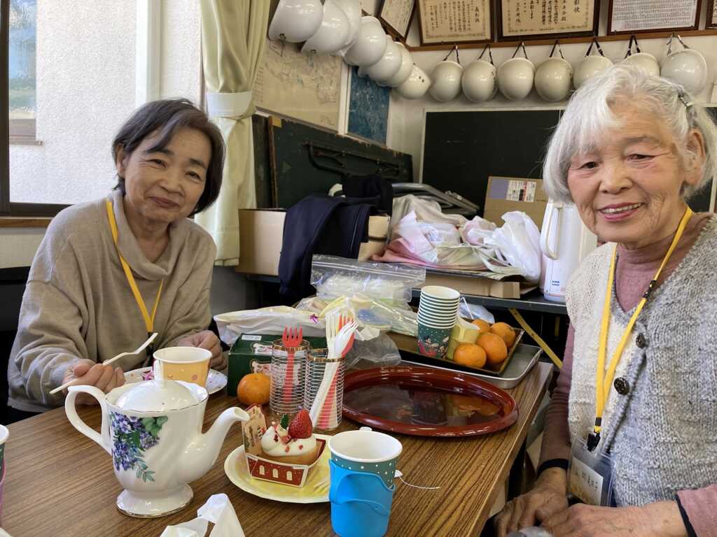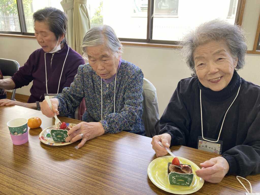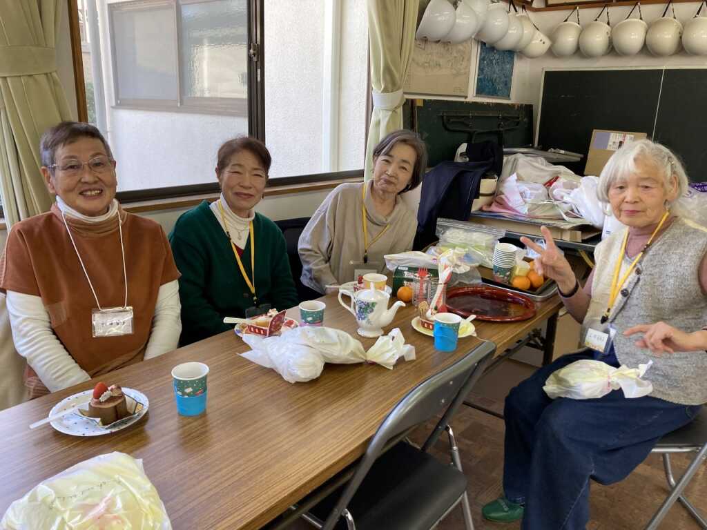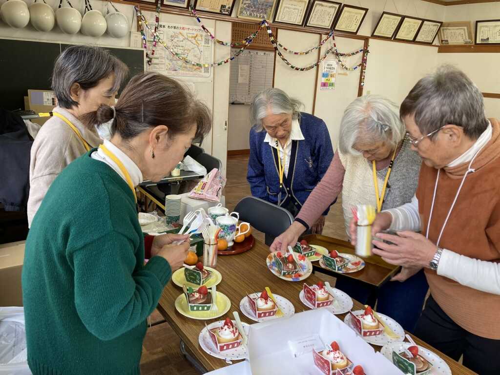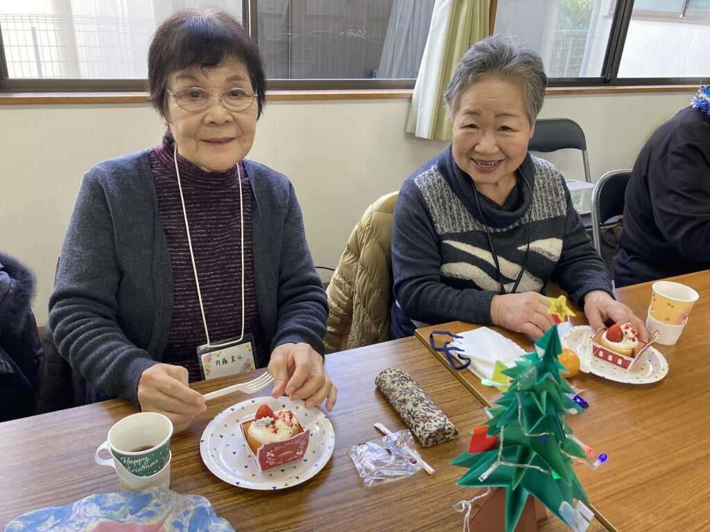 今回は1年の締めくくりとしてクリスマス会が開催!会場のテーブルにはお手製のクリスマスツリーが並び、ケーキもふるまわれました。途中、サンタさんが登場し参加者の皆さんにプレゼントが配られる粋な演出もあり「この年でプレゼントをもらえるなんて嬉しい」と、皆さん喜んでプレゼントを受け取っていました。