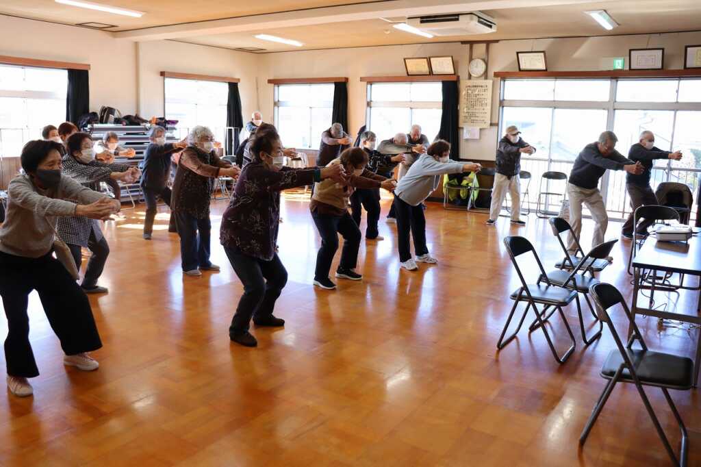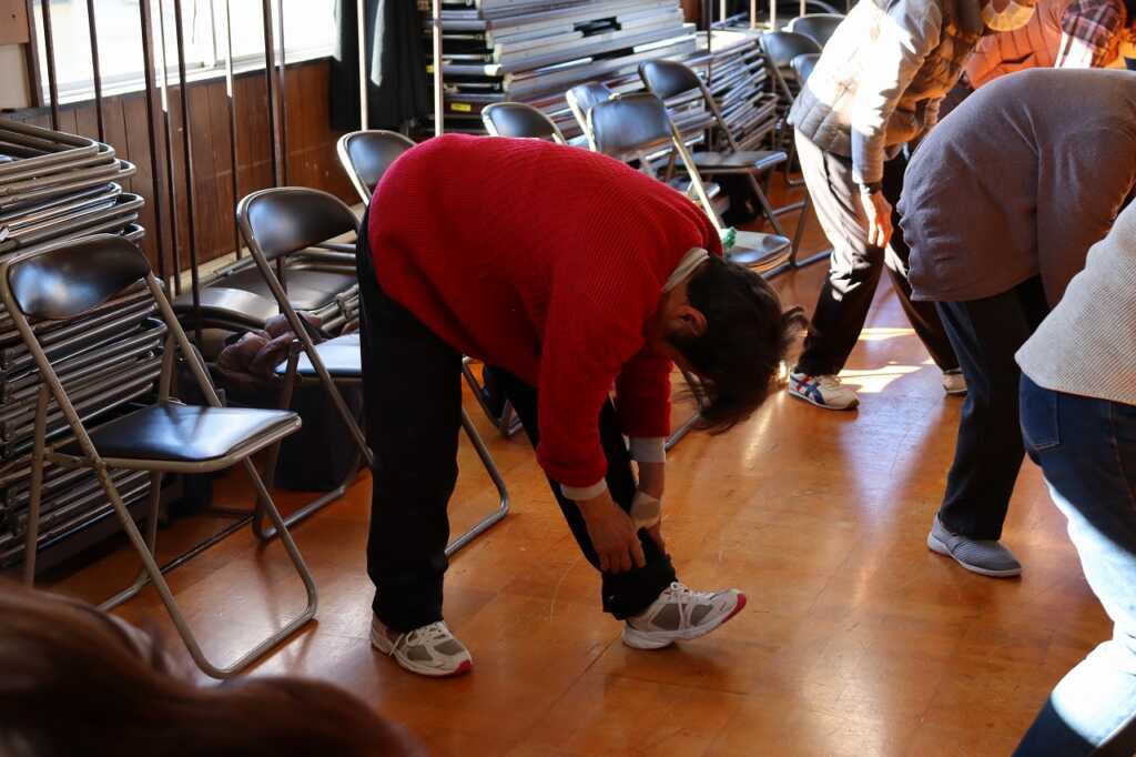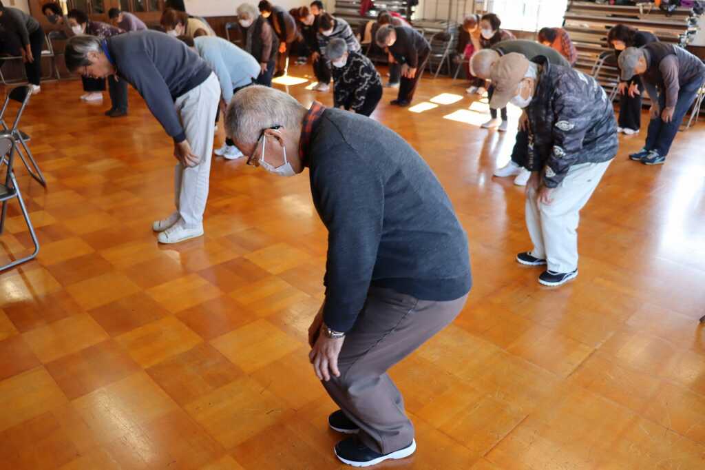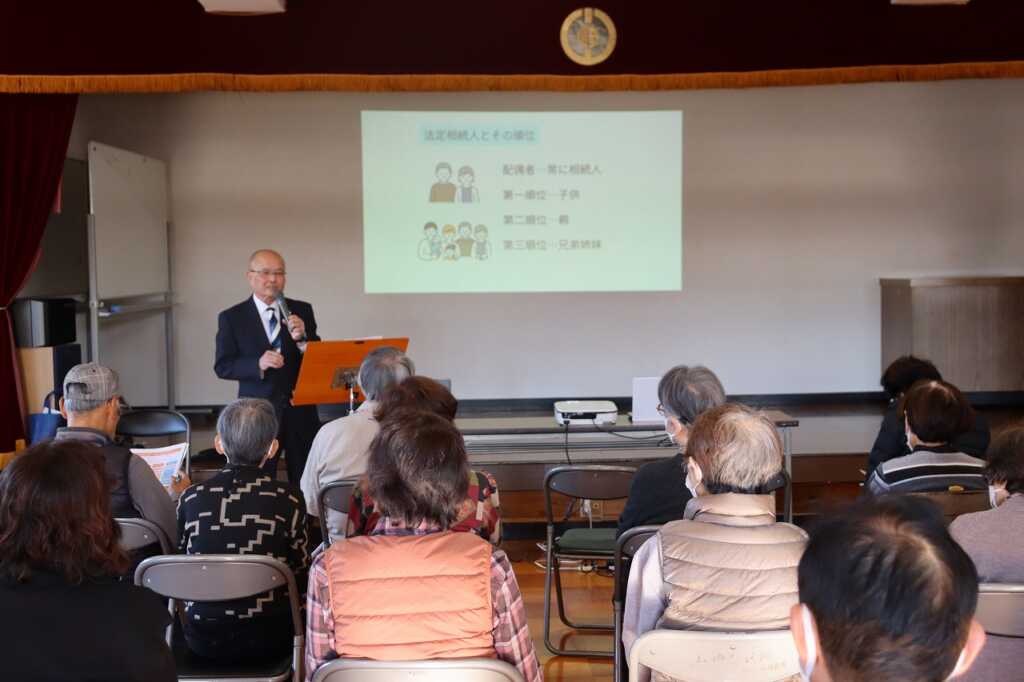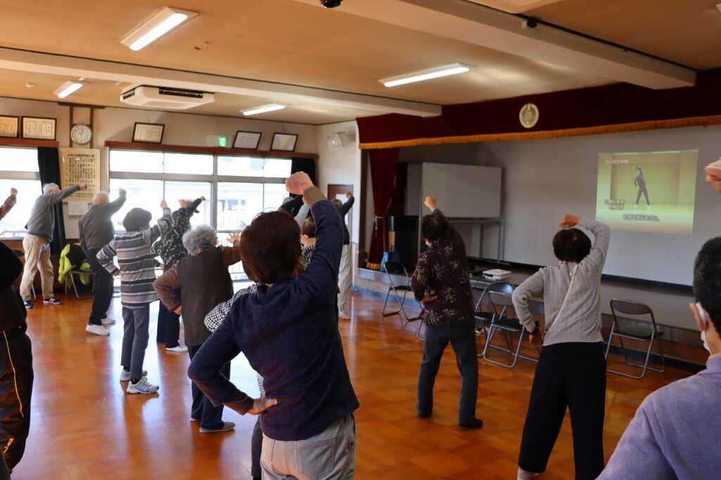 | 「貯筋運動」と「のびのび体操」の映像をスクリーンに映し出し、フォームを確認しながら、全身のストレッチや筋トレを入念に行いました。一通り終わる頃にはじわりと汗ばむくらい身体が温まりました。その後、フレイル予防のため、股関節や仙腸関節を重点的に鍛えました。 体操会の後には、抱き合わせで自治会主催の「相続セミナー」も開催されました。講師のi相続の鍋島氏より、実際にあった相続トラブルの事例をあげながら、いざという時の為に相続対策しておく重要性についてお話がありました。 |