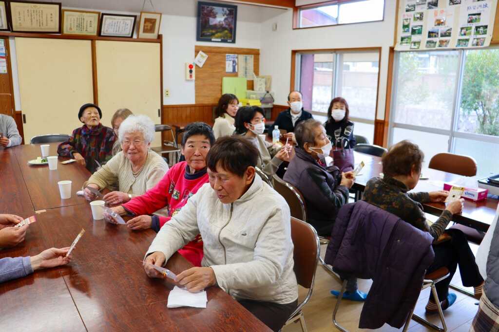 | 今年度3回目のサロン「みんなのたまり場」が開催されました。今回は「ゲームとおもてなし」と題し、頭の体操を兼ねたことばあそびを行いました。福祉会お手製のお汁粉と磯部焼きを頂き、参加者からは「美味しいわね。久しぶりにお汁粉を食べたわ」とお喋りをしながら堪能しました。 最後は、本日の目玉のビンゴ大会が行われました!「あった!」「開かないなぁ」と、読み上げられる番号に一喜一憂しながら楽しみました。 |
