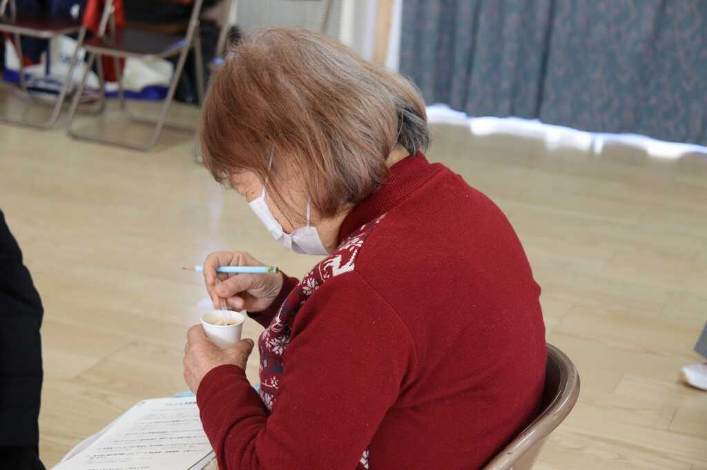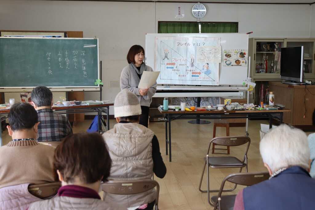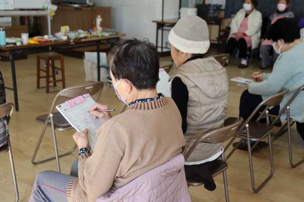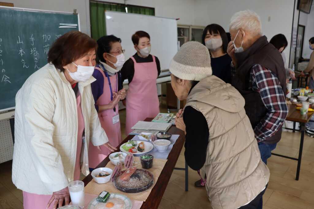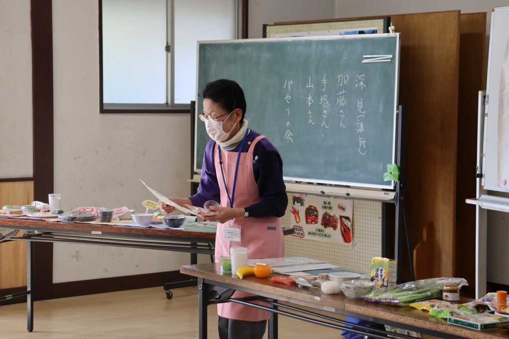 | 今回は管理栄養士である「あじさいの会」の深見氏を講師にお招きして、フレイル予防の栄養講座を行いました。栄養豊富な旬の野菜をはじめ、市販のお惣菜やレトルト食品等をうまく取り入れながら、主食・副菜・汁物と3食しっかり食べましょうと声掛けがありました。また、余分な塩は使わず、抑えられるところは抑えていく“省塩”についても話があり、講座の最後には、「ぱせりの会」の皆さんお手製の具沢山の減塩味噌汁が振舞われました。野菜の甘味もあり、参加者からは「味噌が少なくてもこんなに美味しいのね」という感想が聞かれました。 |