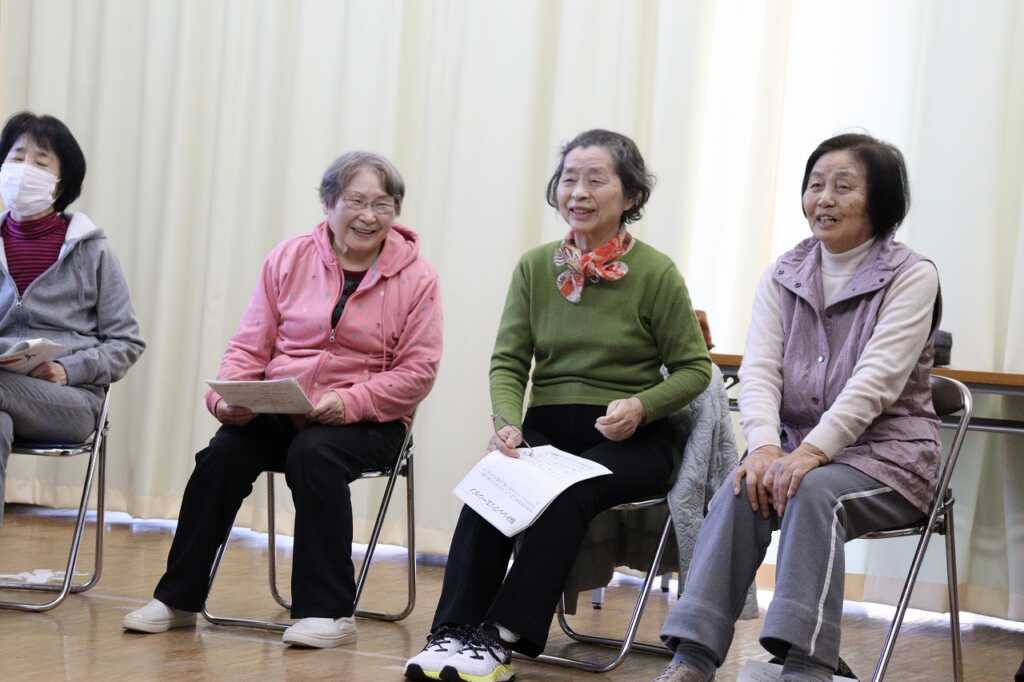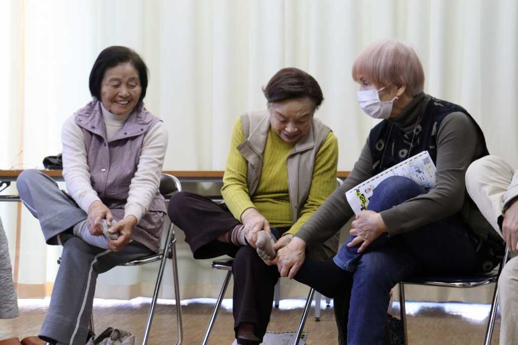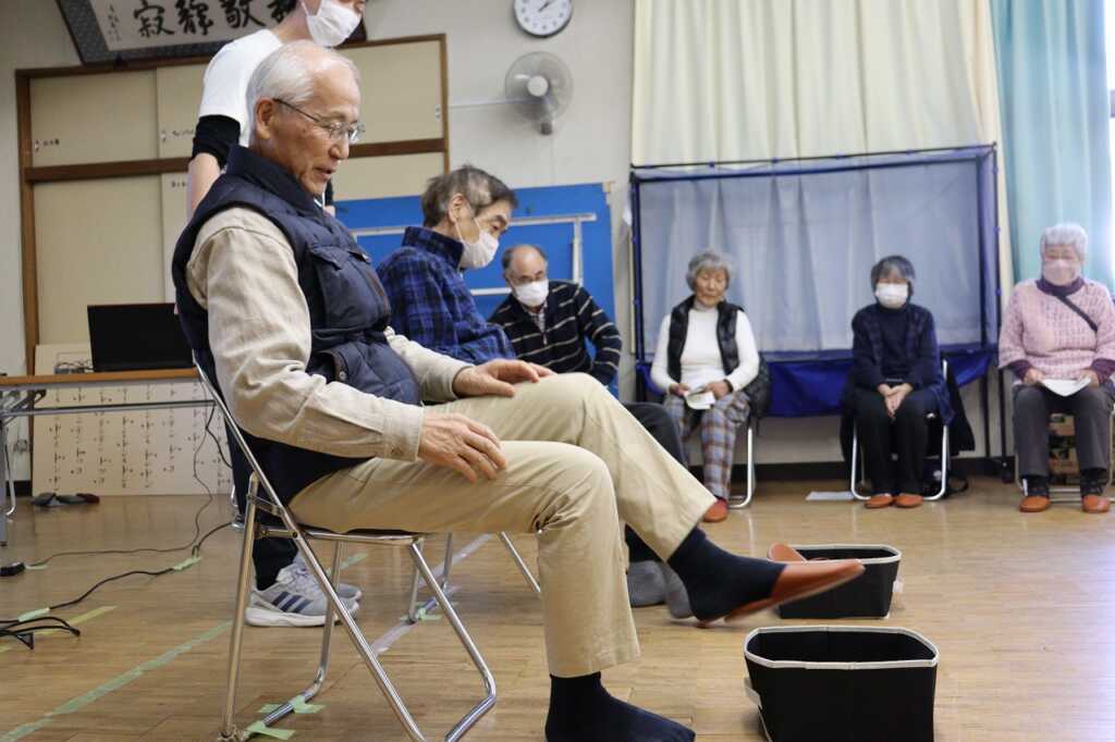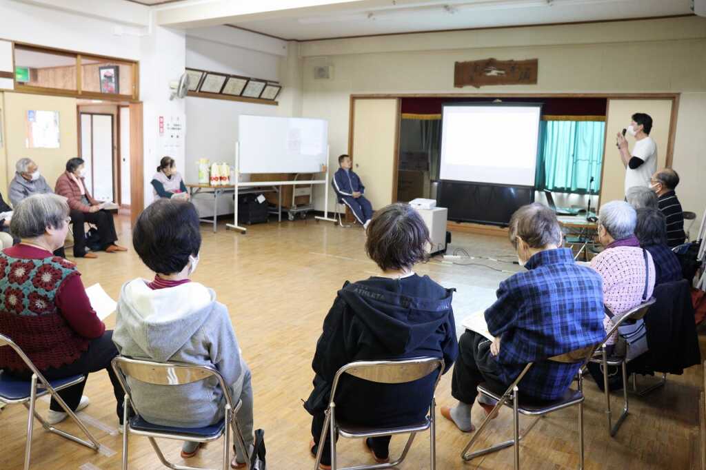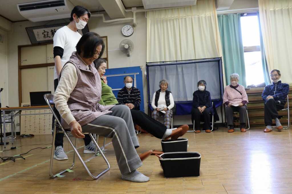 | 前半はNEXT10金盛智也さんによる「レクリエーションで学ぶ!転倒予防」と題した講座を行いました。画面に表示された文字の色に合わせて足を前後左右に出す動きや、外に出ているスリッパを足だけを使ってカゴの中に入れる「スリッパお片付けゲーム」を通して、頭と身体を動かしていきました。金盛さんは「間違えても大丈夫。頭を使うことが大切です」と、参加者を励まし、和やかな雰囲気でゲームを楽しみました。 後半は恒例となったお茶飲みです。お茶とお菓子を頂きながら、普段地域内で顔を合わせたことがない方や久しぶりに会う方と、自由に移動しながらおしゃべりを楽しみ、あちこちで大きな笑い声が響き渡っていました。 |