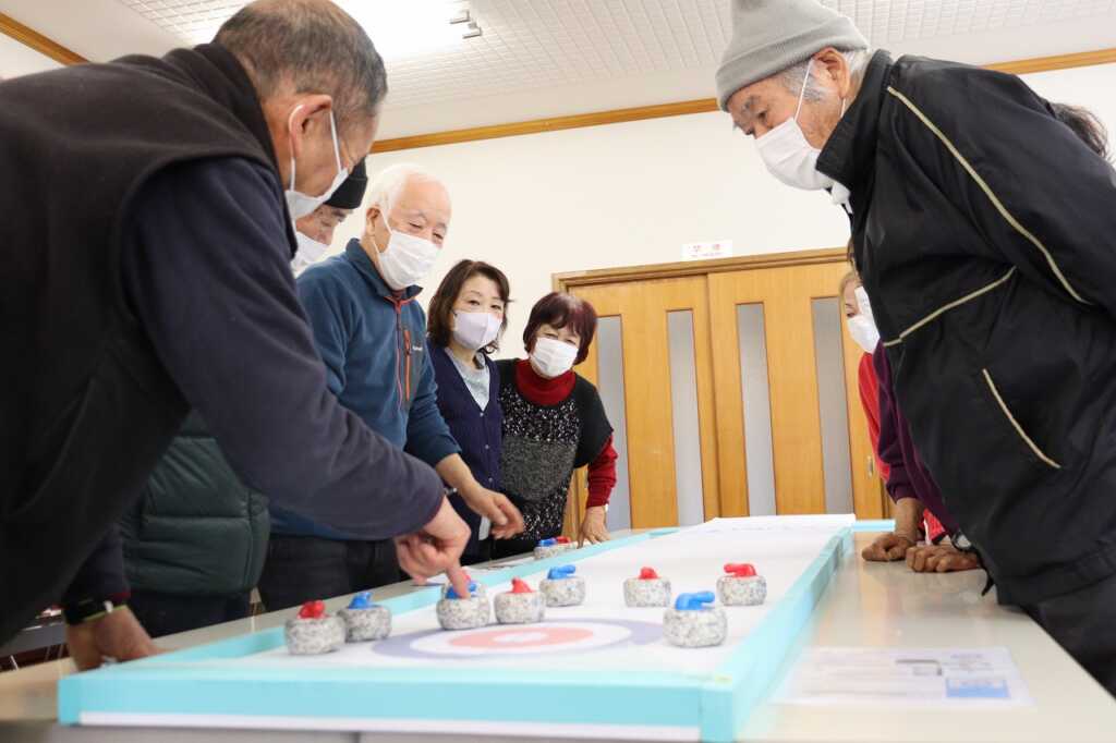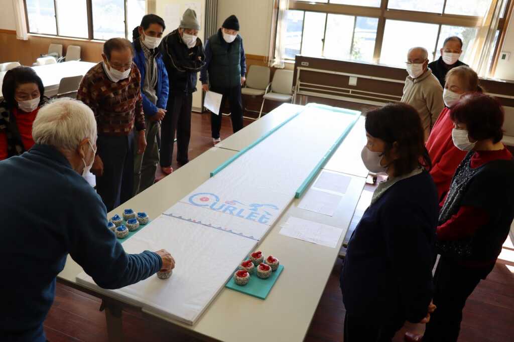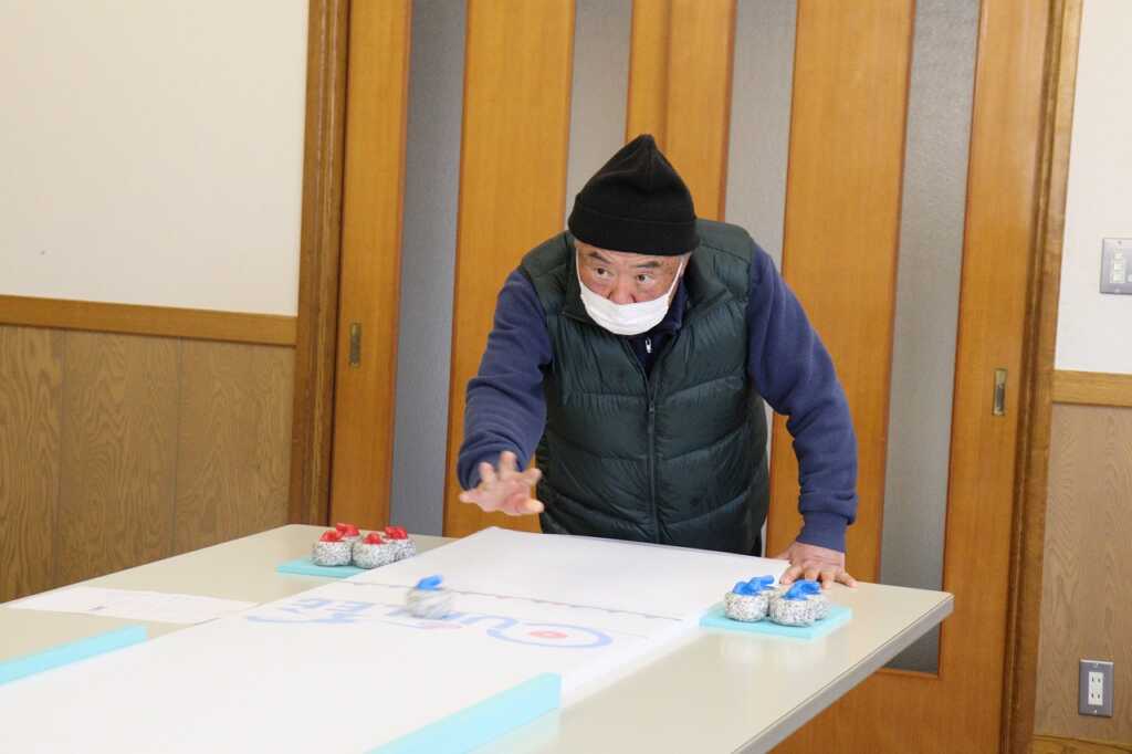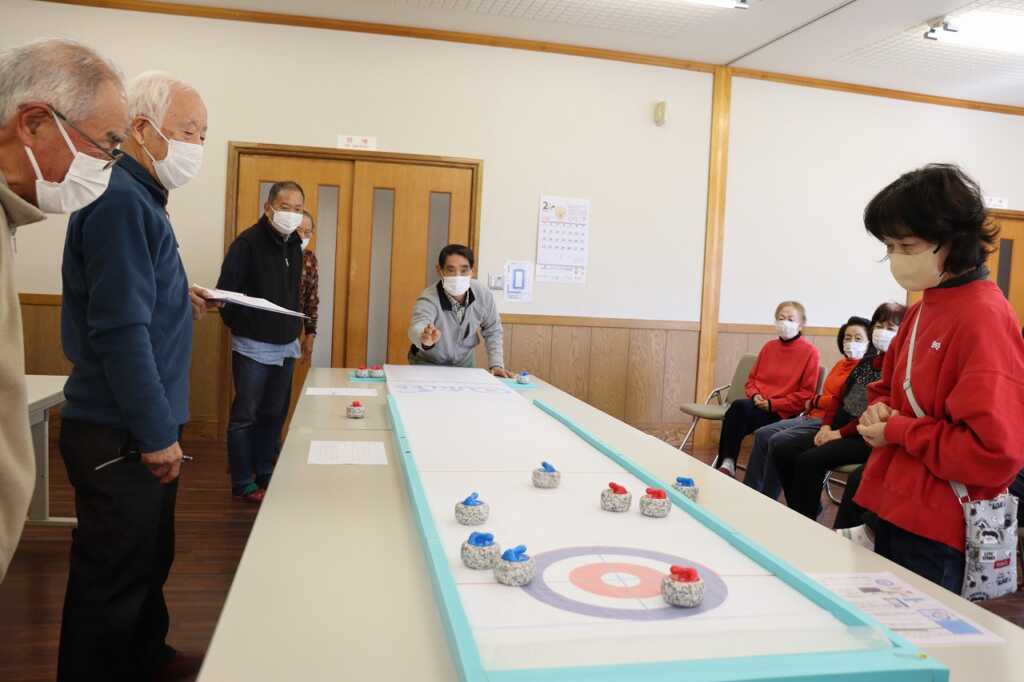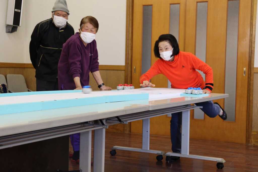 昨年初めて市老連女性部の指導のもとカーレットを体験したとのことで、今回は仙賑会のメンバーでゲームを楽しみました。初めに、練習で何球かストーンを投げ、感触をつかんでからいざ実戦!4チームに分かれトーナメントで5エンド対戦しました。初めのうちは力加減が難しい様子でしたが、白熱してくると壁に当てる“クッション”の技法を使うなど、作戦を話し合う様子もありました。敵味方関係なく、次の狙いどころを確認してから投げましたが、思ったとおりにいかず相手に逆転を許してしまうことも…。大笑いした後は、昼食をいただきながら表彰が行われ、感想を述べ合い互いを労いました。