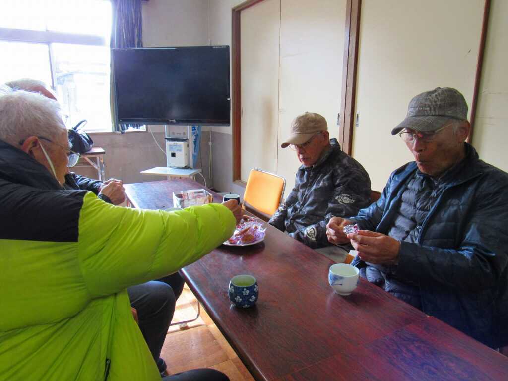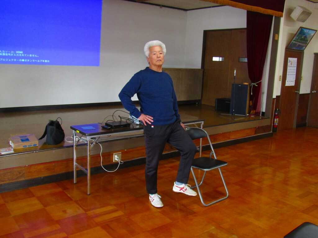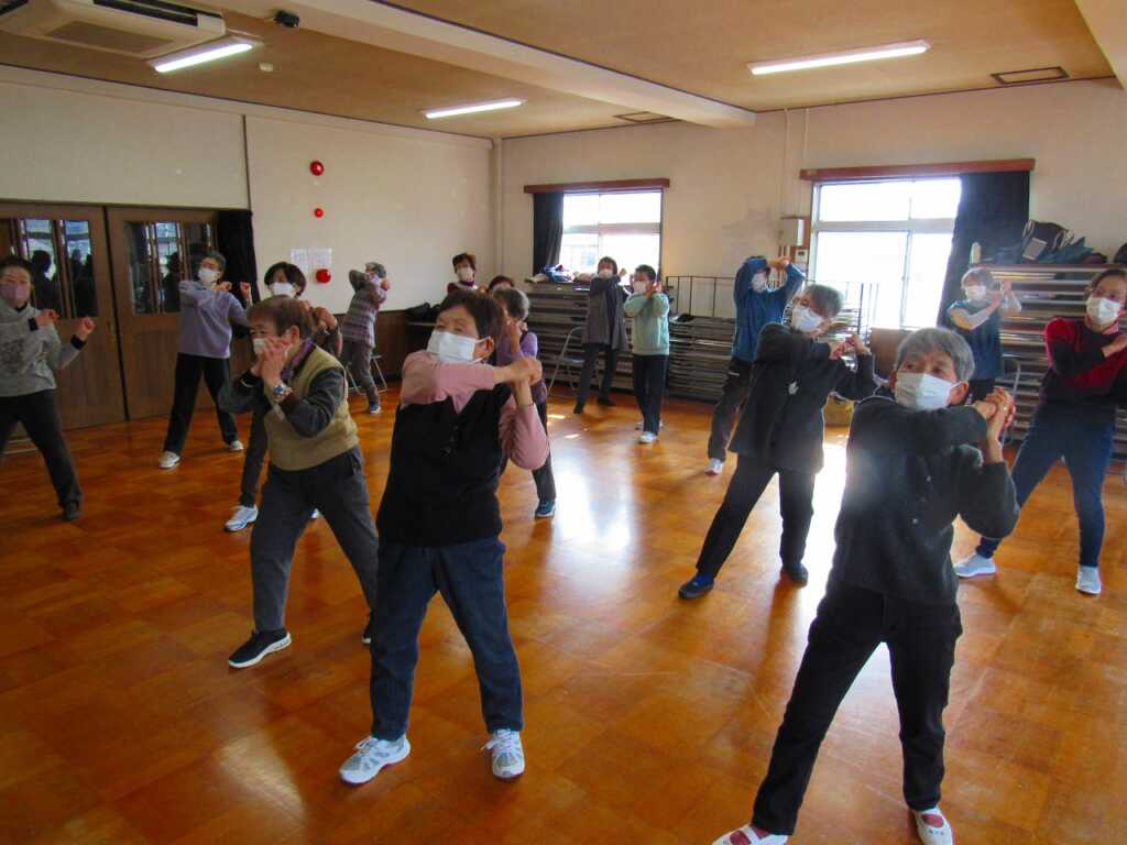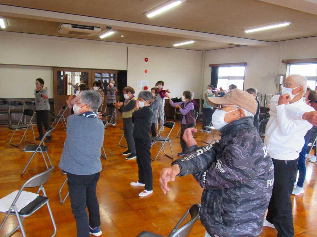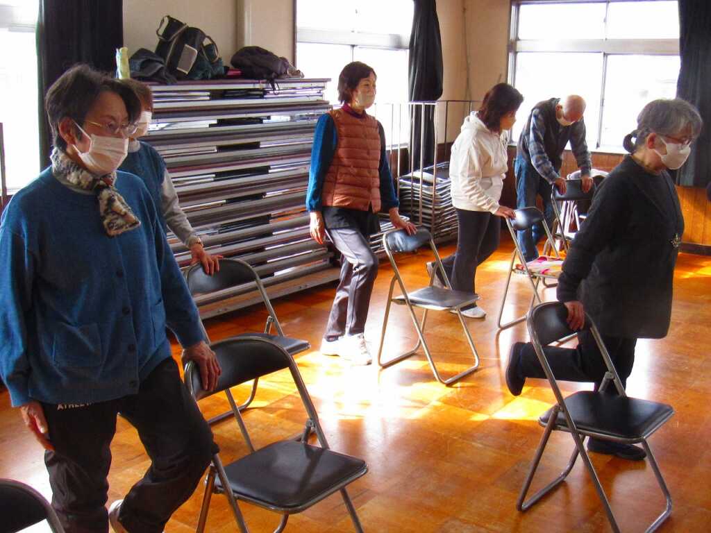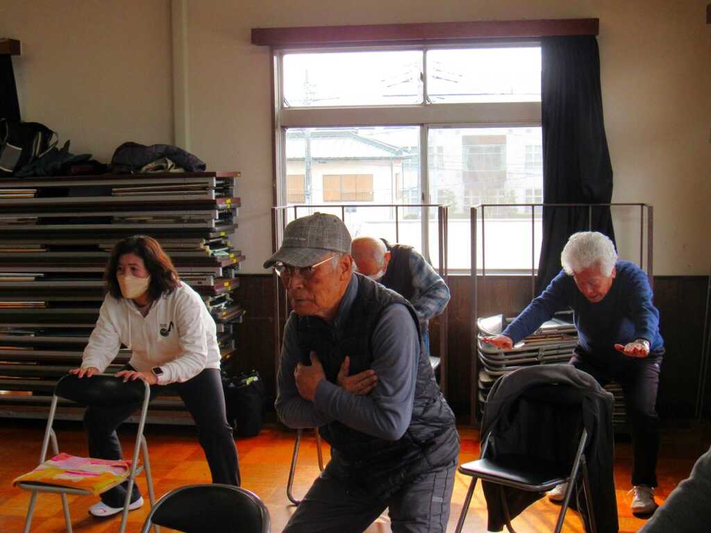 | ストレッチを入念に行い、身体をほぐしてから「のびのび体操」や「貯筋運動」、「きんたろう体操」を行いました。スクワットや片足立ちなど、負荷をかけてのトレーニングを軽々とこなしていました。体操後のお茶会では「こないだの雪の日は大変だったな」「夕日の滝は、凍って綺麗だよな」などの話で盛り上がりました。最後に、「春の小川」を皆さんで合唱し解散となりました。 次回の体操は2月20日(金)の開催です。是非ご参加ください。 |