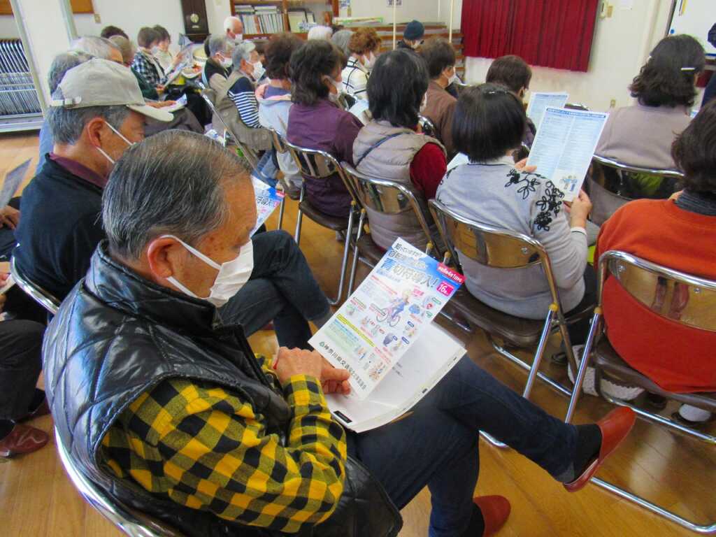 | 今年度3回目の竹の会が開催されました。今回は、4月から改正される自転車の交通ルールについて、松田警察署福沢駐在所の幾久氏からお話いただきました。初めに、最近地域で起きている事件や事故について紹介があり、特殊詐欺の被害額を聞いた参加者から被害額の高さに驚きの声が挙がりました。自転車のルールについて概要をお話いただいた後に、参加者からの質問を受け付けると沢山の質問がありました。中には予想していた答えと違う回答があり、参加者から「今日の講習は勉強になった」という声が多く聞かれました。 |