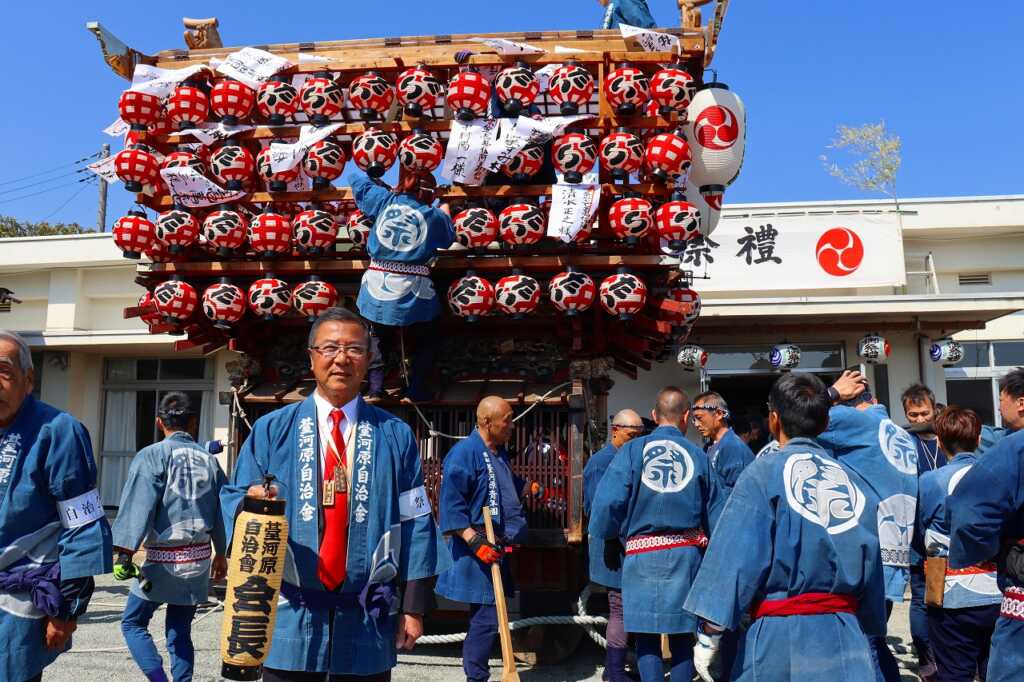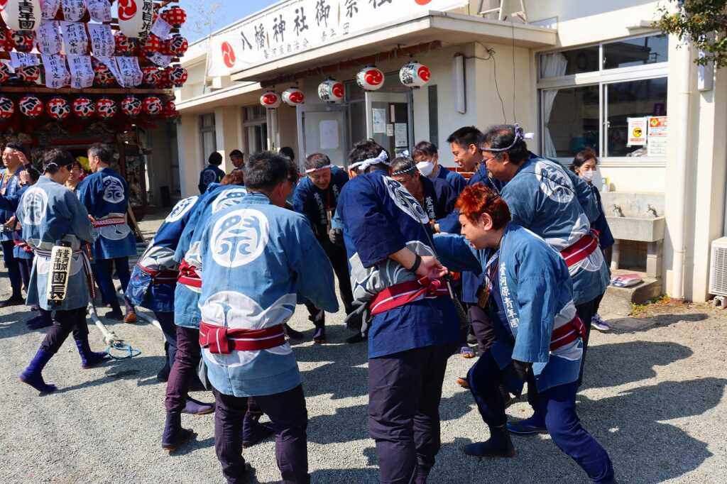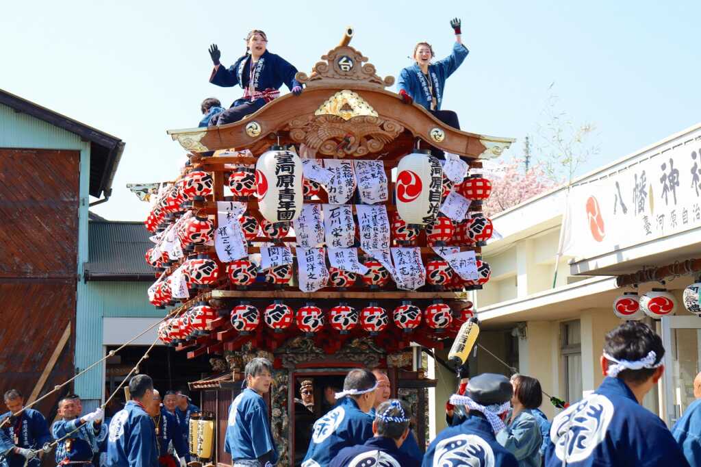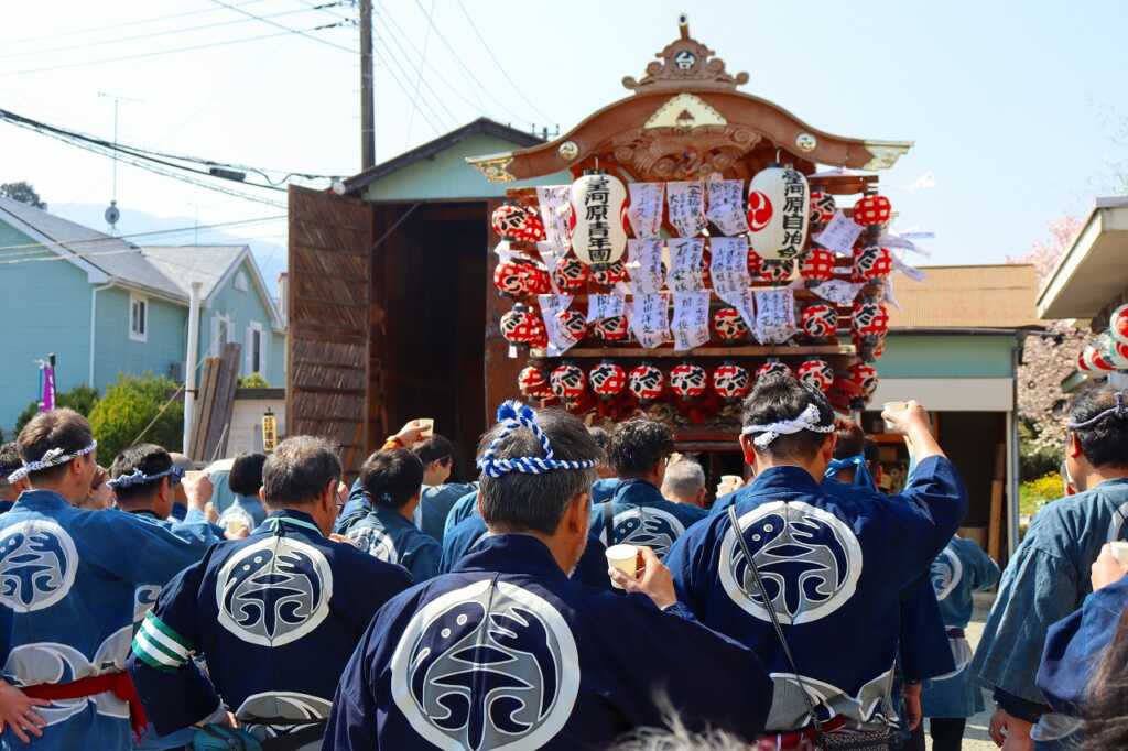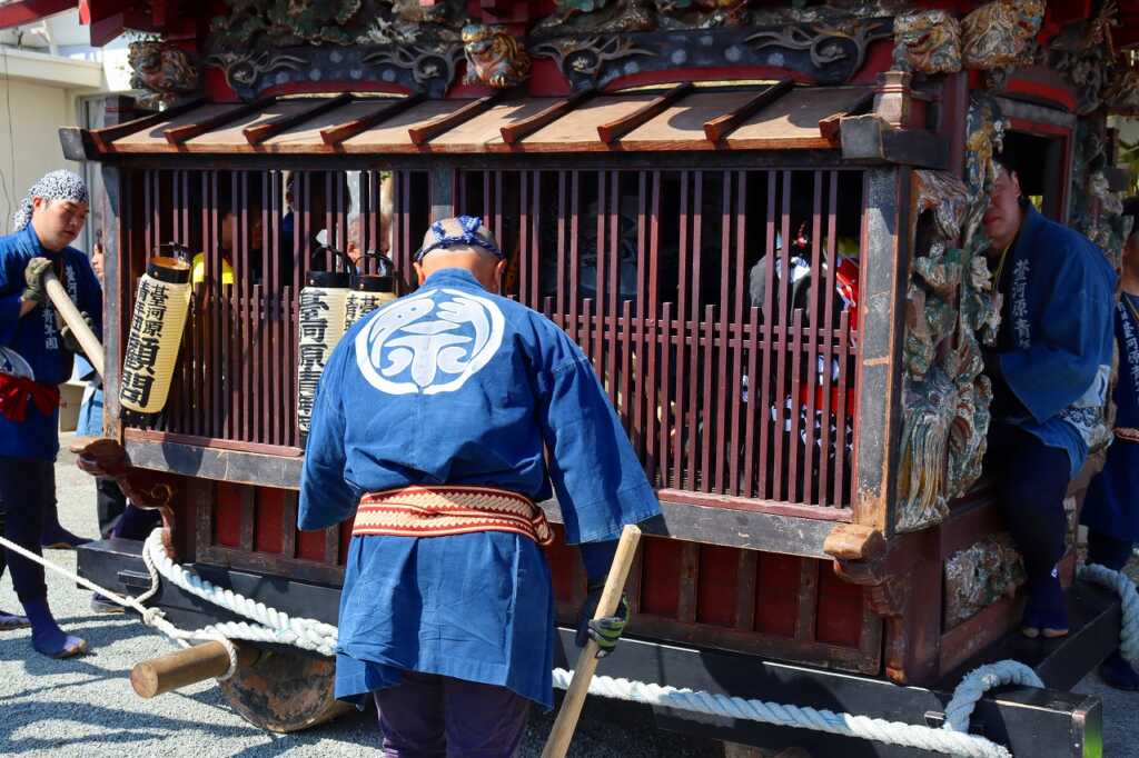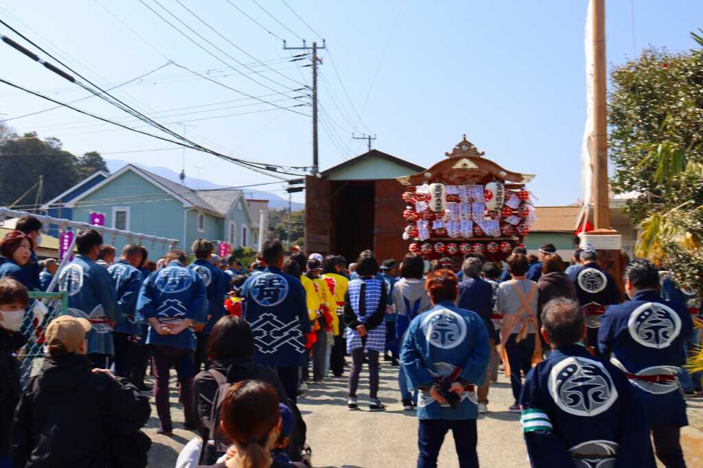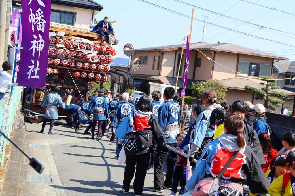 2日間に渡る例祭が行われました。宮司による祝詞の後に、青年団の勇ましい声が挙がり児童館を山車が出発。山車の中では太鼓が叩かれ、お囃子の音が聞こえてくると、近所の方が道に集まりました。掛け声と共に、子どもから大人まで力を合わせて山車を引いて町内を練り歩きました。