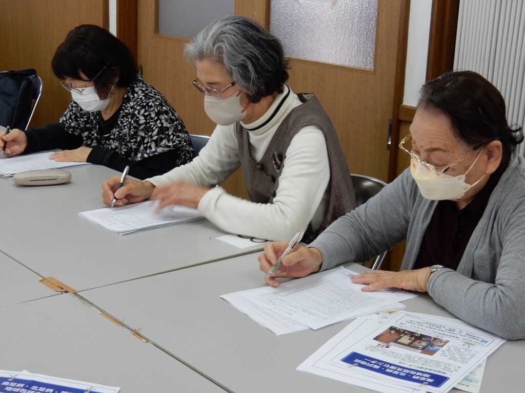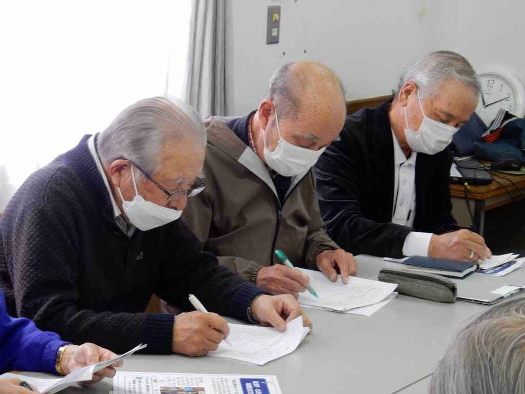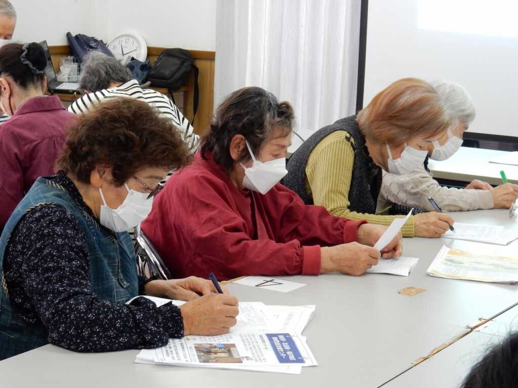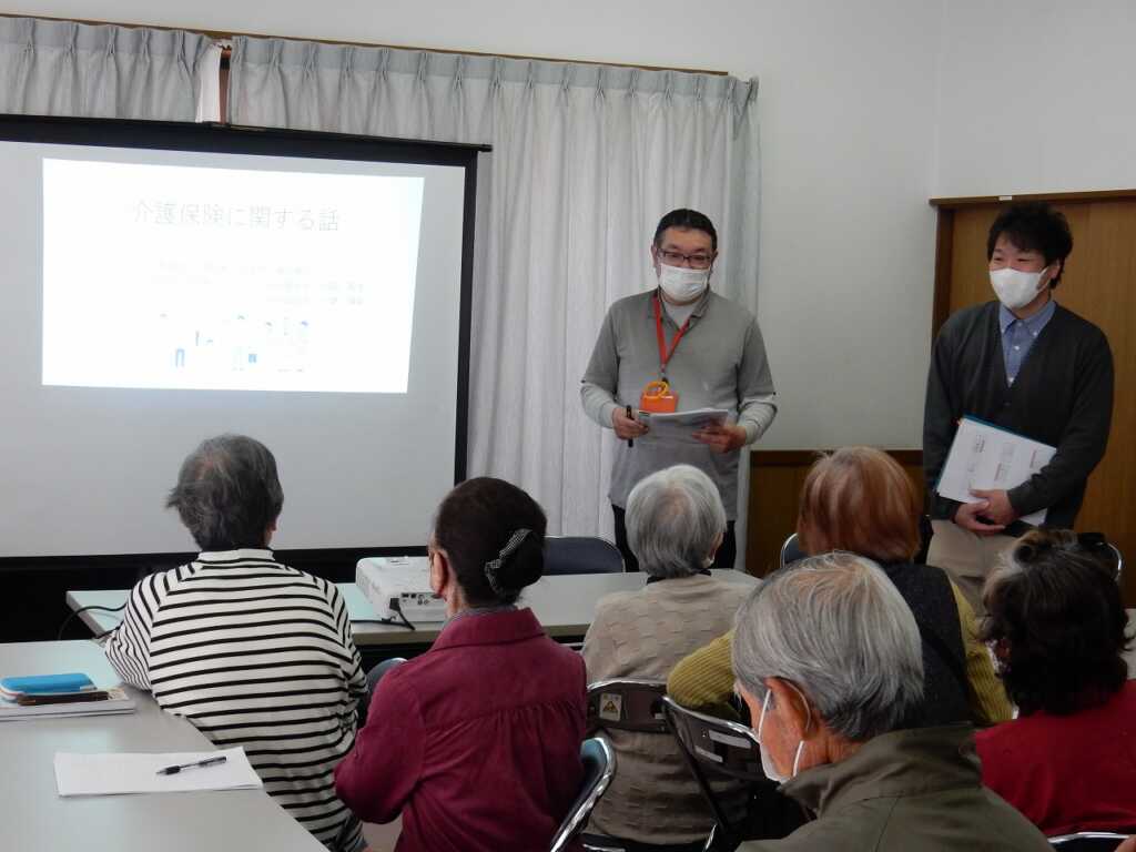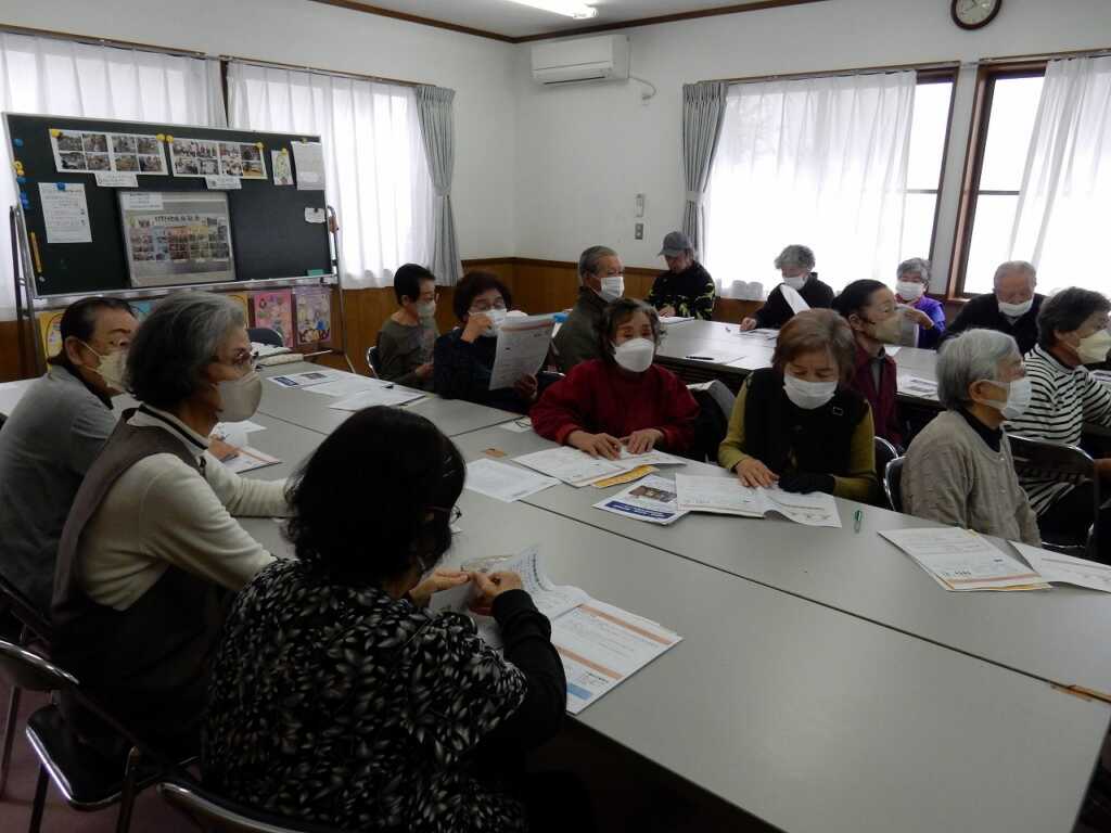 | 議事は全て承認されました。その後は、出前講座として南足柄・北足柄・福沢地区地域包括支援センターの職員による“介護保険に関する話”と題した講話を聴きました。市内にある身近な介護施設や使用できる要件が伝えられると、皆さん熱心にメモを取る様子が見られました。最後に福山福祉会長が「地域で体操教室をおこなっている。こういうことを続けていくことが必要だと思った」と感想を述べると、包括支援センターの職員も「ぜひこのような場に出て継続して活動していってほしい」と応えていました。 |