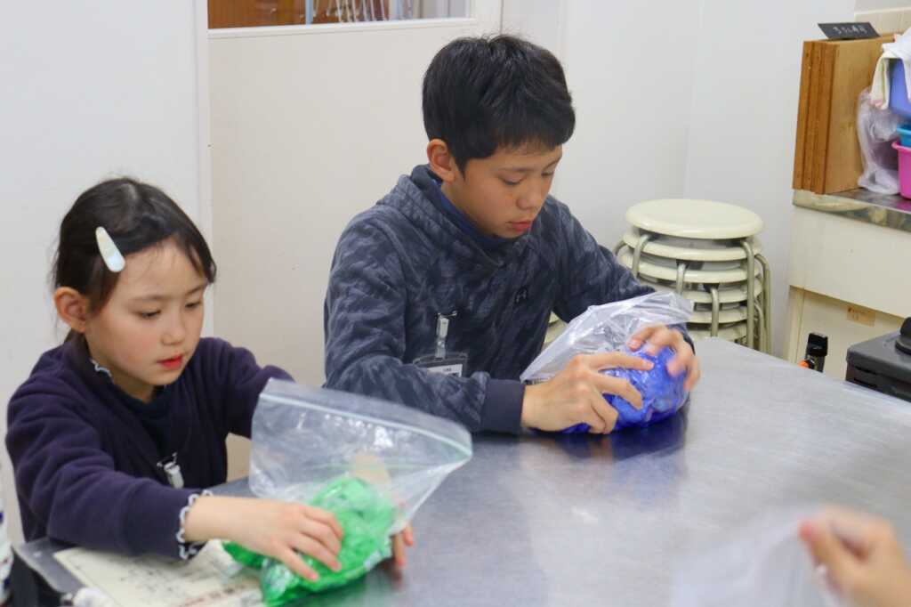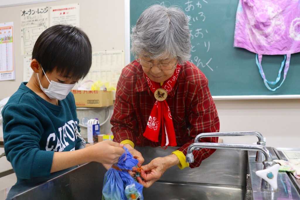 | あしがらアートの森の皆さんを講師に迎え、地域の見守りボランティアの皆さんのサポートをいただきながら開催しました。無地のTシャツに、ビー玉やペットボトルキャップなどを輪ゴムでくくり、よりどりみどりの染料から好きな色を選び、Tシャツに流し込みました。根気強く揉み込み、綺麗なグラデーションや偶然できた模様に参加した子ども達は、「綺麗に染まった!」と笑顔を見せオリジナルのTシャツを完成させました。講師の方からも、「白の部分がアクセントになっていいね!」などとお褒めの言葉を頂きました。 ~3月31日中部公民館美術工芸室、調理実習室にて |