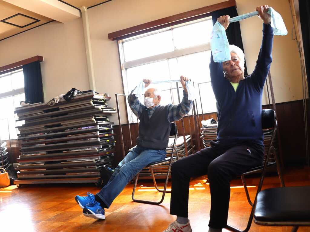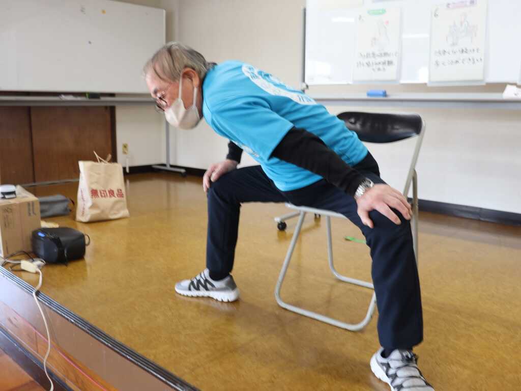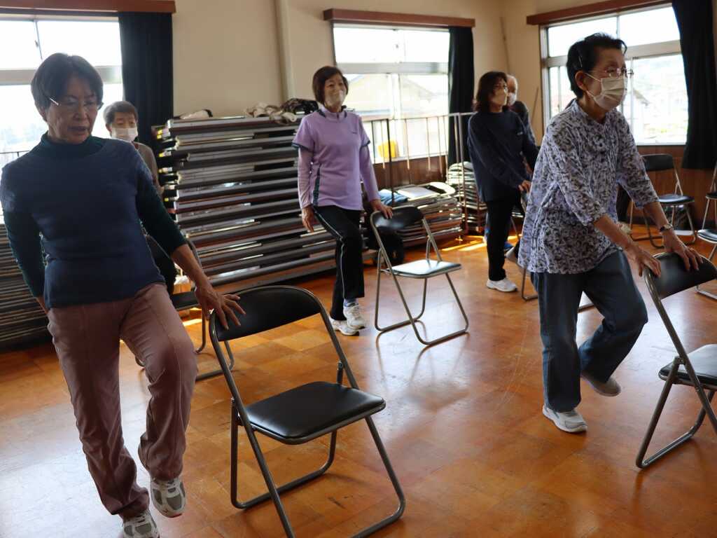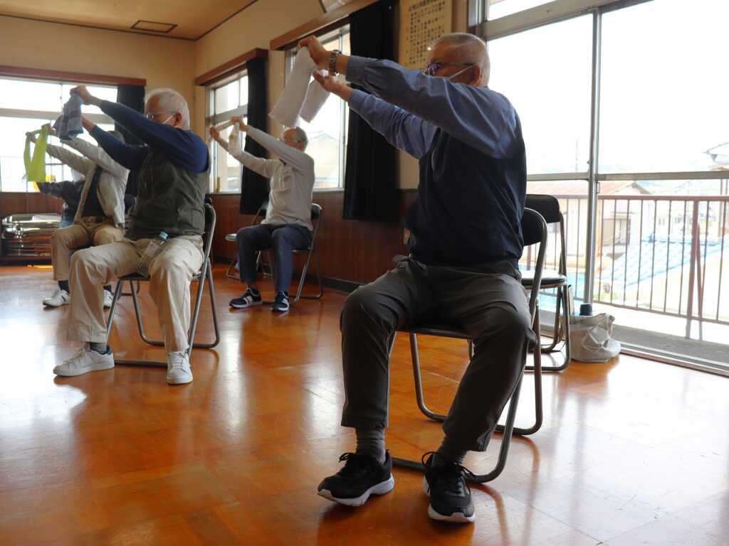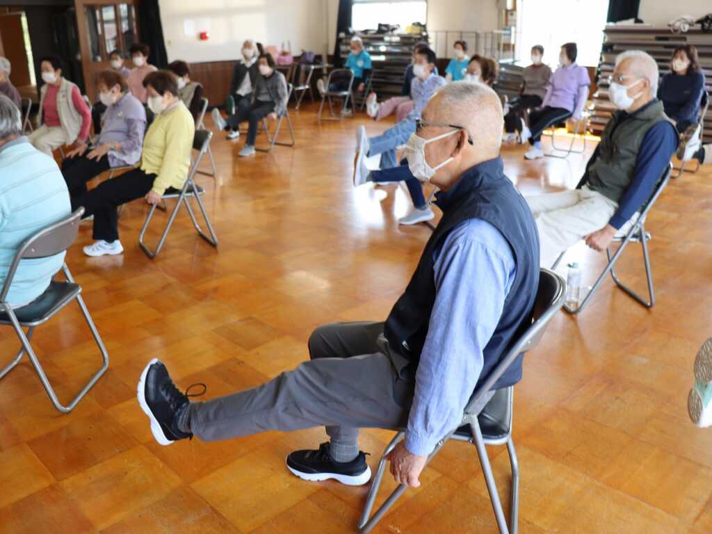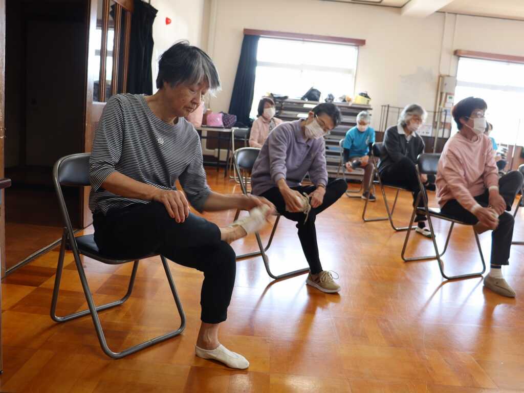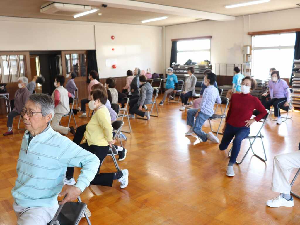 今回は27名の参加者があり介護予防サポーター3名が進行しました。ラジオ体操から始まり、サポーターの軽快なお話を聞きながら、椅子に座った状態で足先から頭の先まで丁寧にストレッチしました。続いて腿上げなど全員で「いち、に、さん」と数えながら下肢を中心に筋トレを行いました。介護予防サポーターが要所で水分補給を促し、最後まで笑顔で頑張りました。その後タオル体操で息を整え、最後は円になり「逢えてよかった」を手話を交えて歌いました。