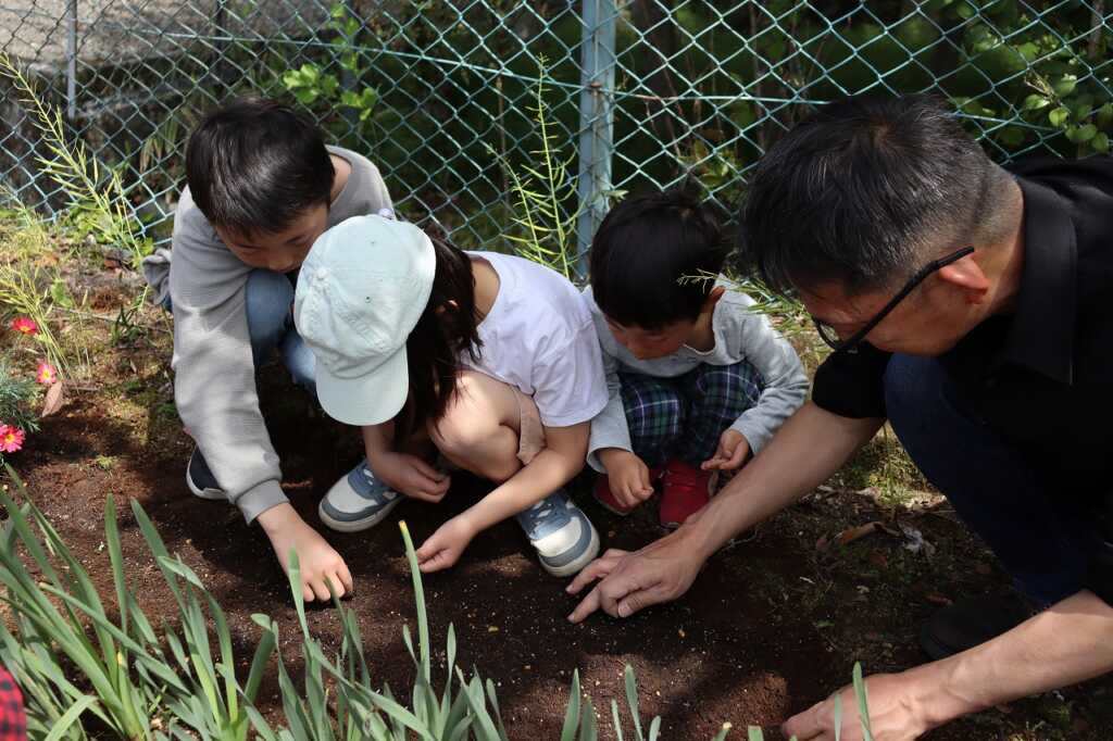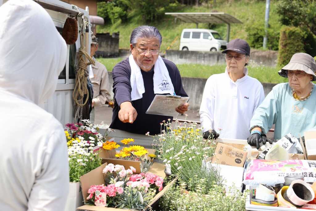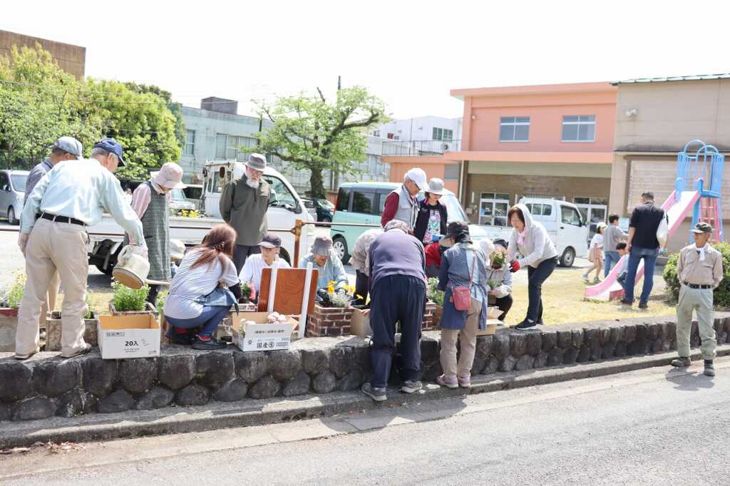 昨年10月から地域福祉会を中心に活動を開始した“花とも”。子どもたちを含めた初めてのメンバーと一緒に、先にパンジーやビオラ、チューリップを根から丁寧に抜き取り、自由に好きなだけ持ち帰ることができるよう選びました。花ともリーダーの奥津さんからチューリップを開花させるコツが伝えられたのち、入れ替え作業を開始!花の色味のバランスやそれぞれの花の相性を見ながら配置していきました。その後は、筏場分館に移動して、地植えの花植えや種を蒔く作業を協力しながら行いました。