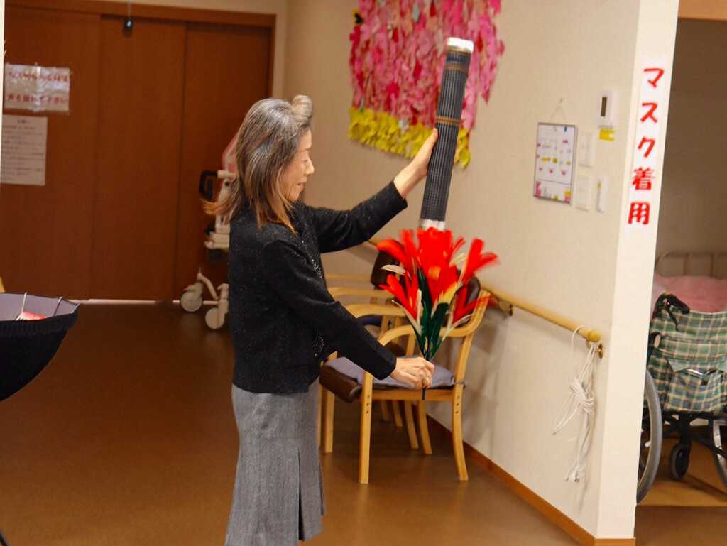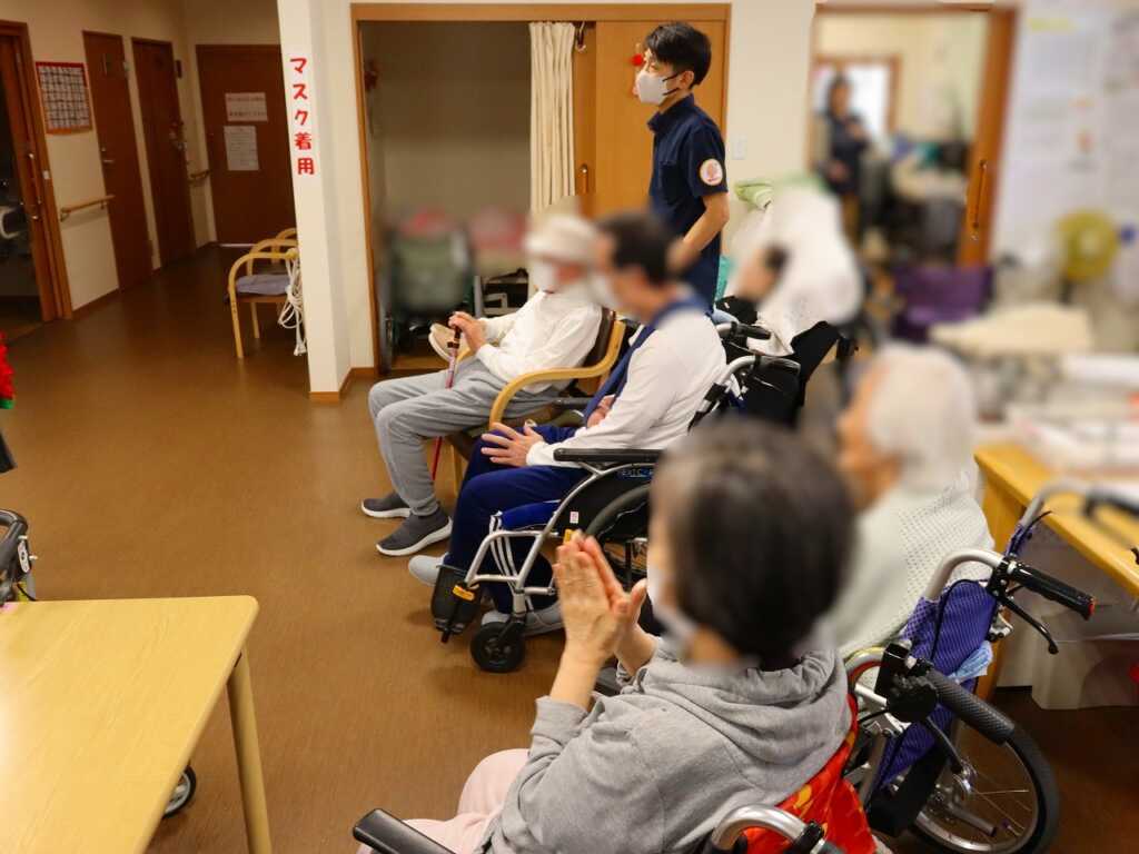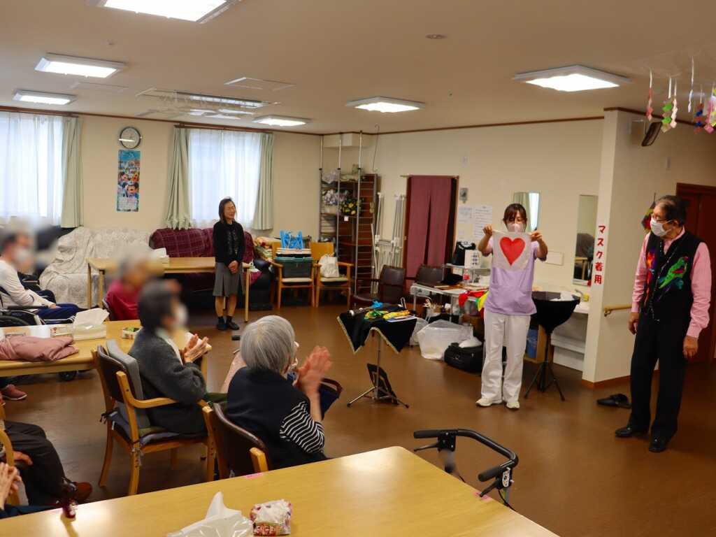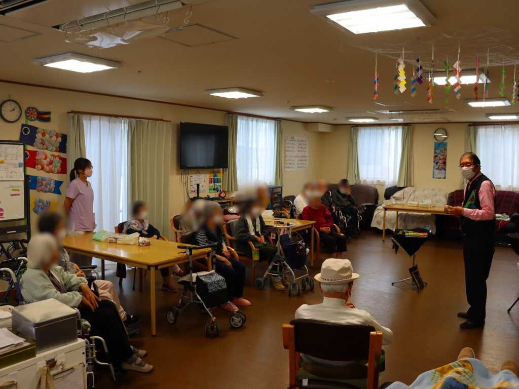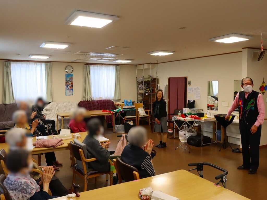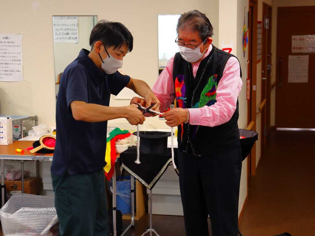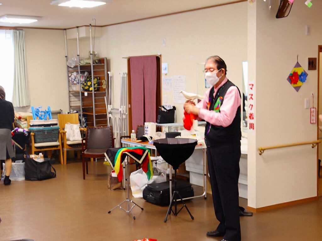 今回は、小田原マジシャンズクラブを講師にお迎えしマジックショーを開催しました。布を使ったマジックから始まり、職員さんや利用者さんにも参加していただき、音楽に合わせ次々とマジックが披露されました。ティッシュ1枚で出来る簡単マジックを講師から伝授していただき、利用者さんからは「できた!」と笑顔が見られました。最後はハトが出てくるマジックに、職員も利用者も驚きと歓声が挙がり演目は終了しました。皆さん終始笑顔で、楽しい時間を過ごしました。