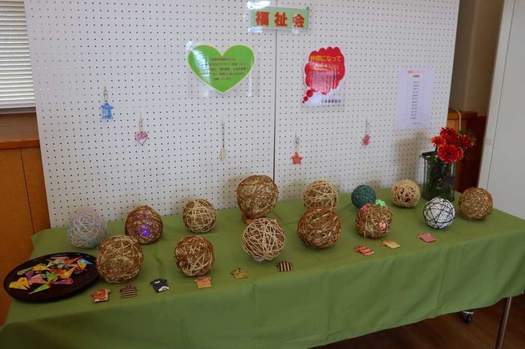 2日間にわたり公民館祭りと文化祭が行われました。福祉会は、麻紐ランプシェードの展示と2日目の喫茶店で協力しました。公民館内には、自治会内の団体や個人で作成した作品が並び、来館者の興味を引きました。福祉会の喫茶店では、3種類の焼き菓子を提供。接客の合間には、卓球と思い出カルタを楽しみました。 |