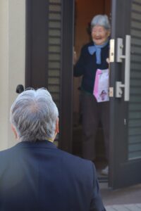 年明けに90歳以上の方へ年始のごあいさつを兼ねて祝い品を配布しており、今年は34名が対象です。役員4名が徒歩で地域内を周り、対象者へ「お変わりないですか」と声をかけると皆さん笑顔で「おかげさまで元気だよ」と応えていました。地域柄、家族で商店を営んでいる方もいらっしゃり、対象者のご家族や近所の方と触れ合う場面もあり、寒空の下でしたが笑顔が絶えない訪問活動となりました。