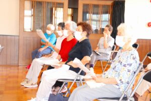 体操の前に、中北薬品株式会社の管理栄養部の方から「糖尿病予防の食事のポイント」について講義がありました。「レタスで食物繊維を目標量摂るには?」というクイズの答えが「レタス5個分」と聞いて、驚きの声が上がりました。