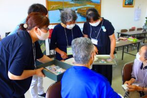 縁側みなみが活動を再開 2020年7月3日 最終更新日時 : 2023年9月22日 msyakyo 窓と扉を開け放した会場に机をロの字に配置し、個包装のお菓子とペットボトルを配るなどの工夫が随所に。「元気だった?」という再会を喜ぶ声や、「昨日から楽しみで仕方なかった」という感想があちらこちらから聞かれ、スタッフのみなさんもホッとした表情でした。最後に、幼稚園にあがるまで通ってきていた子どもからのお礼として、お母さんたちから手作りのブローチが配られると、みなさん嬉しそうに受け取られていました。次回は9月3日(木)です。