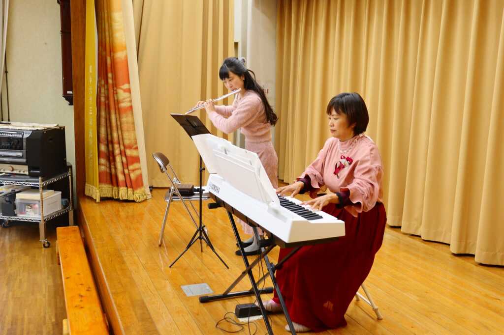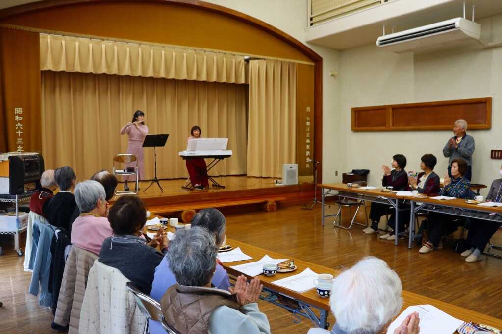 本日は開成町にある、こども音楽教室の方をお招きし、フルートやピアノ、オカリナの演奏会が行われました。美しい音色に耳を傾け、みんなで一緒に「赤とんぼ」や「上を向いて歩こう」等を歌いました。途中、参加者の方のハーモニカも加わり豪華な演奏会となりました。