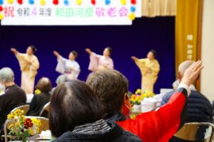 およそ3年ぶりに自治会敬老会が行われました。樋口若松会会長の軽快な司会進行でプログラムは勧められ、参加された皆さんはフラダンス・マジックショー・大正琴・舞踊と様々な演目を楽しみました。大トリは和田河原音頭保存会と、藤 智悦廣一門の皆さんによる「和田河原音頭」です!この敬老会に初めて参加された方は「このような会を開催してくれて本当に嬉しい、楽しかった」と話していました。