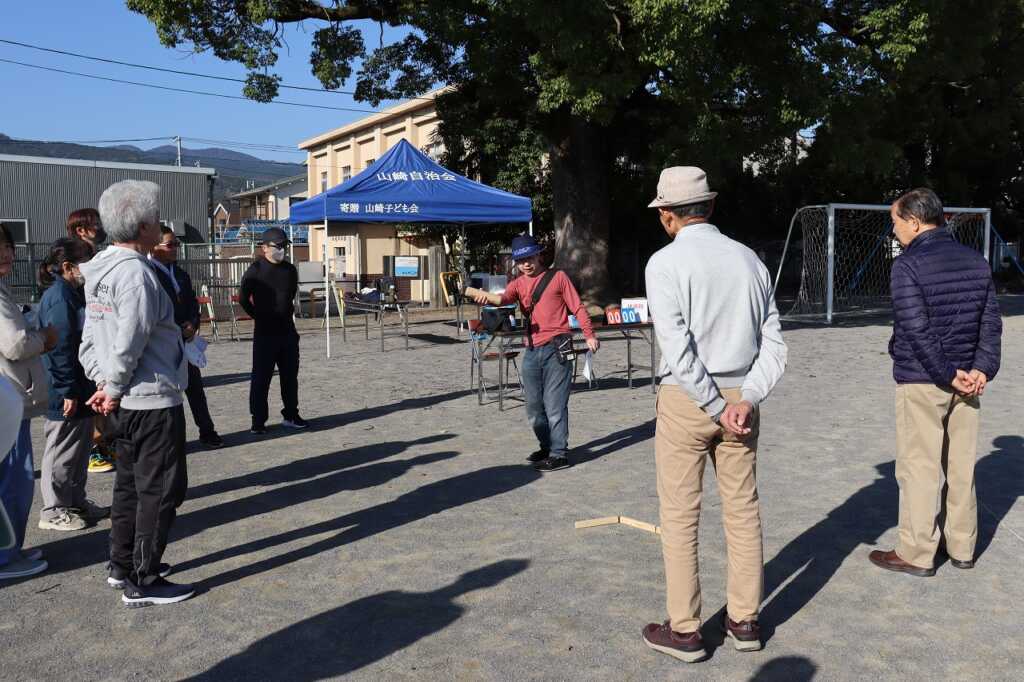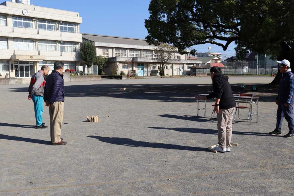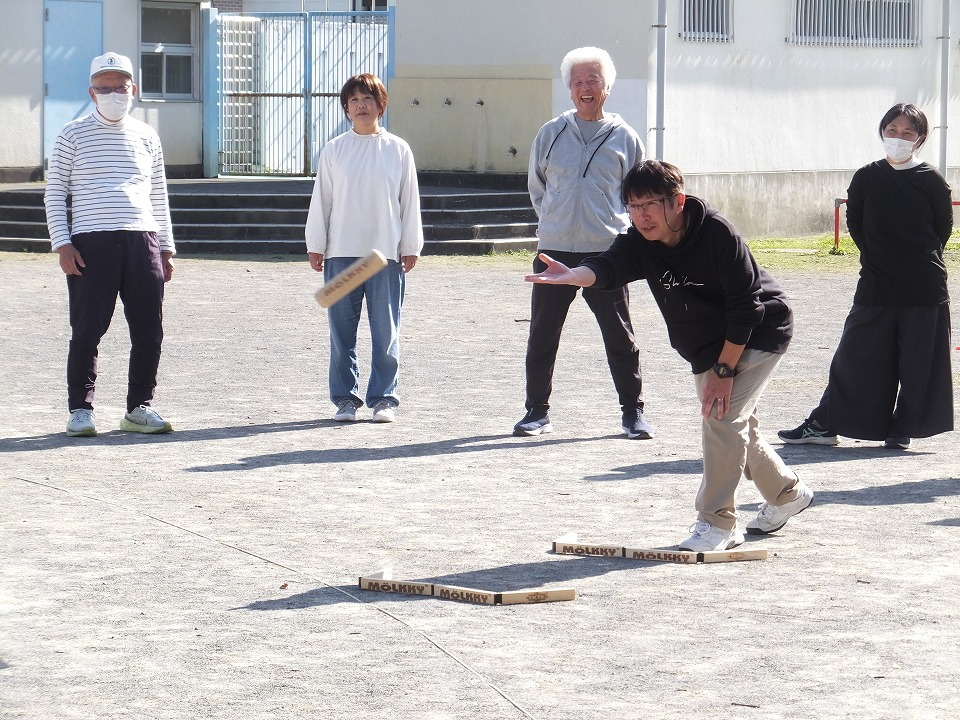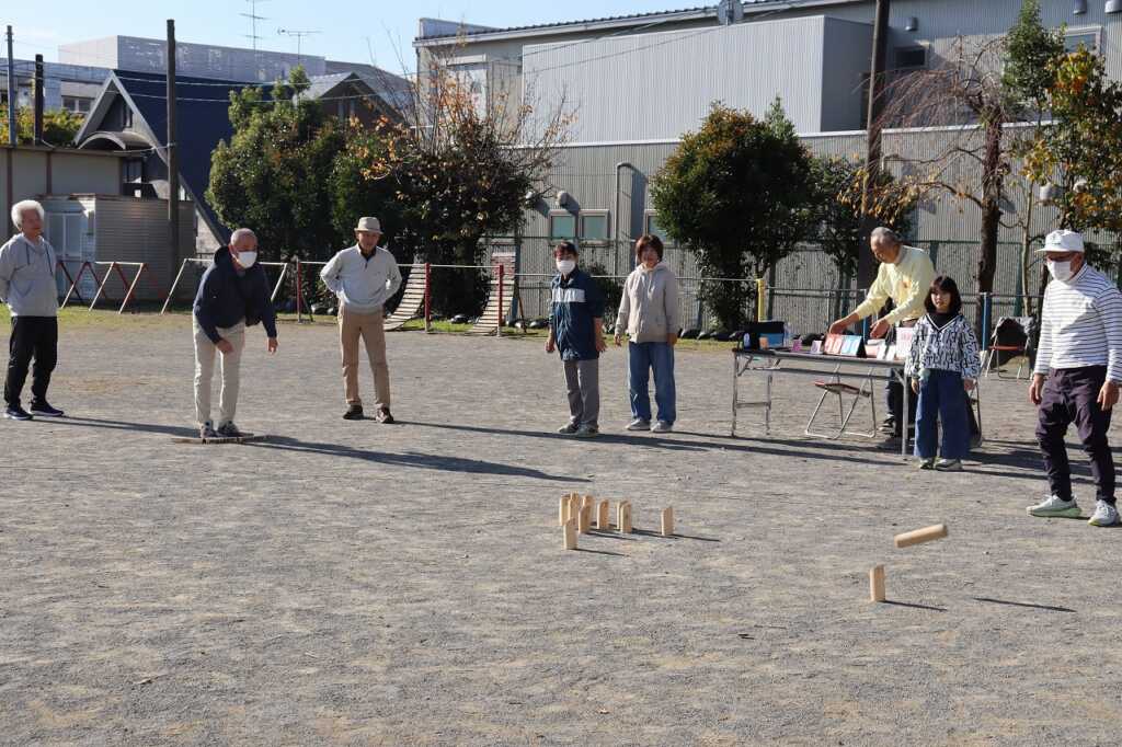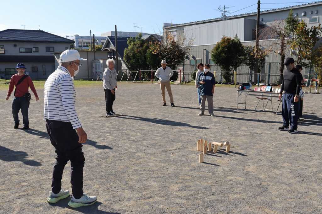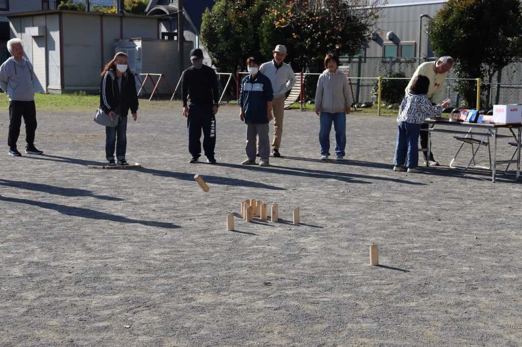 | 秋晴れの空の下、岡本小学校のグラウンドでモルック大会が開催されました。円になって入念に準備運動を行った後、初めてモルックに触れる参加者もいた為、モルック部の方が中心となってルール説明が行われました。その後、スキットルを投げる練習を挟んで、さっそく4チームに分かれて試合をしました。残り10点で勝ちとなる場面で1本倒しで10点ピッタリをとるナイスプレーも見られ、他の参加者から大きな拍手が贈られました。 (お写真の一部は、秋山副自治会長よりいただきました。) |